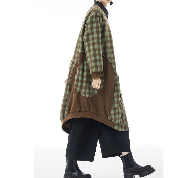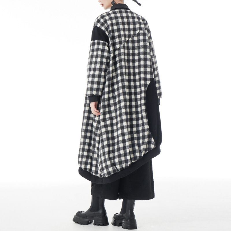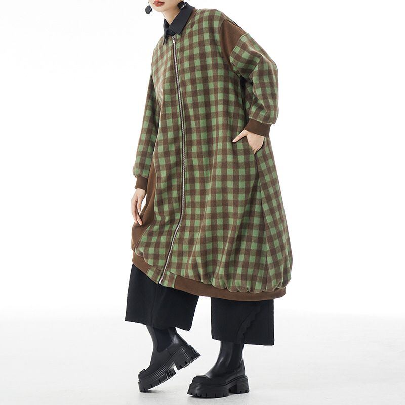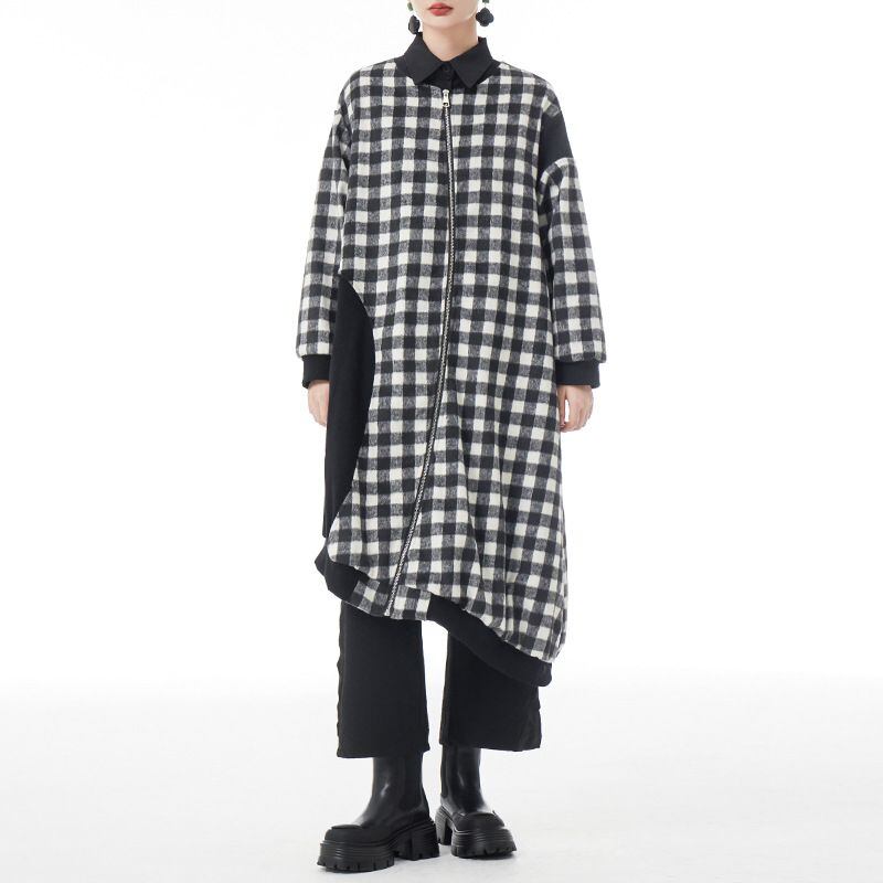 レトロなチェック柄がキュートな、襟なし・長袖・イレギュラーヘムのデザインコートです。アシンメトリックなデザインでカーブしたフルジップが目を惹く、コーディネートの主役になる温かいアイテムです。色は、白×黒と緑×茶の2種類から選べます。