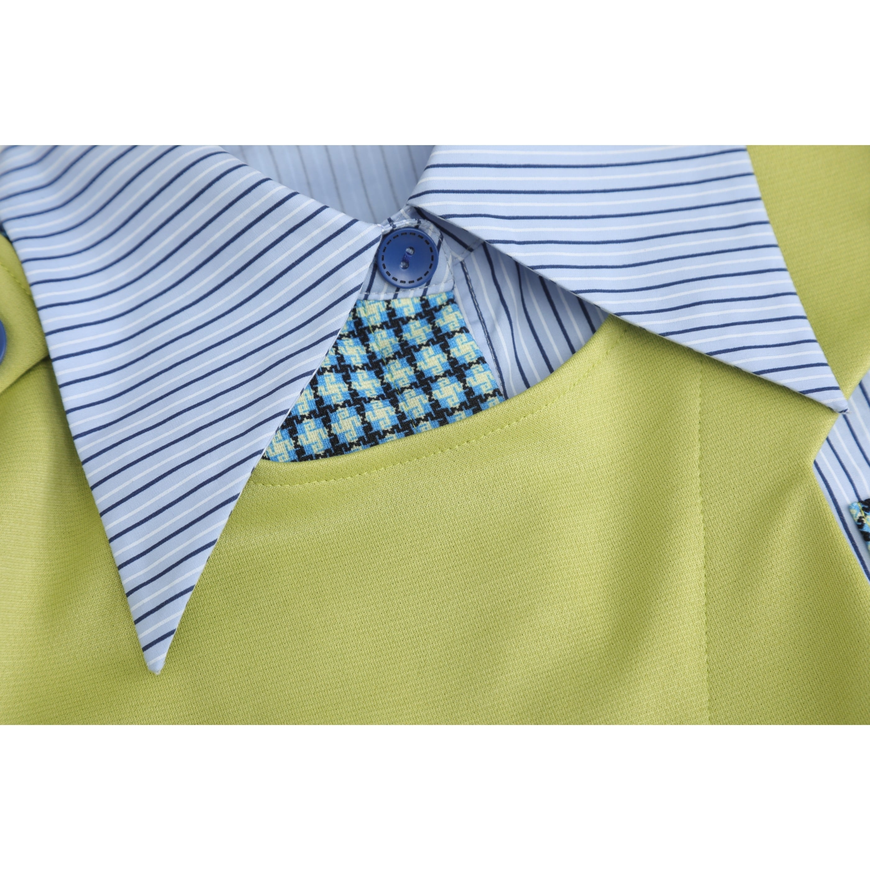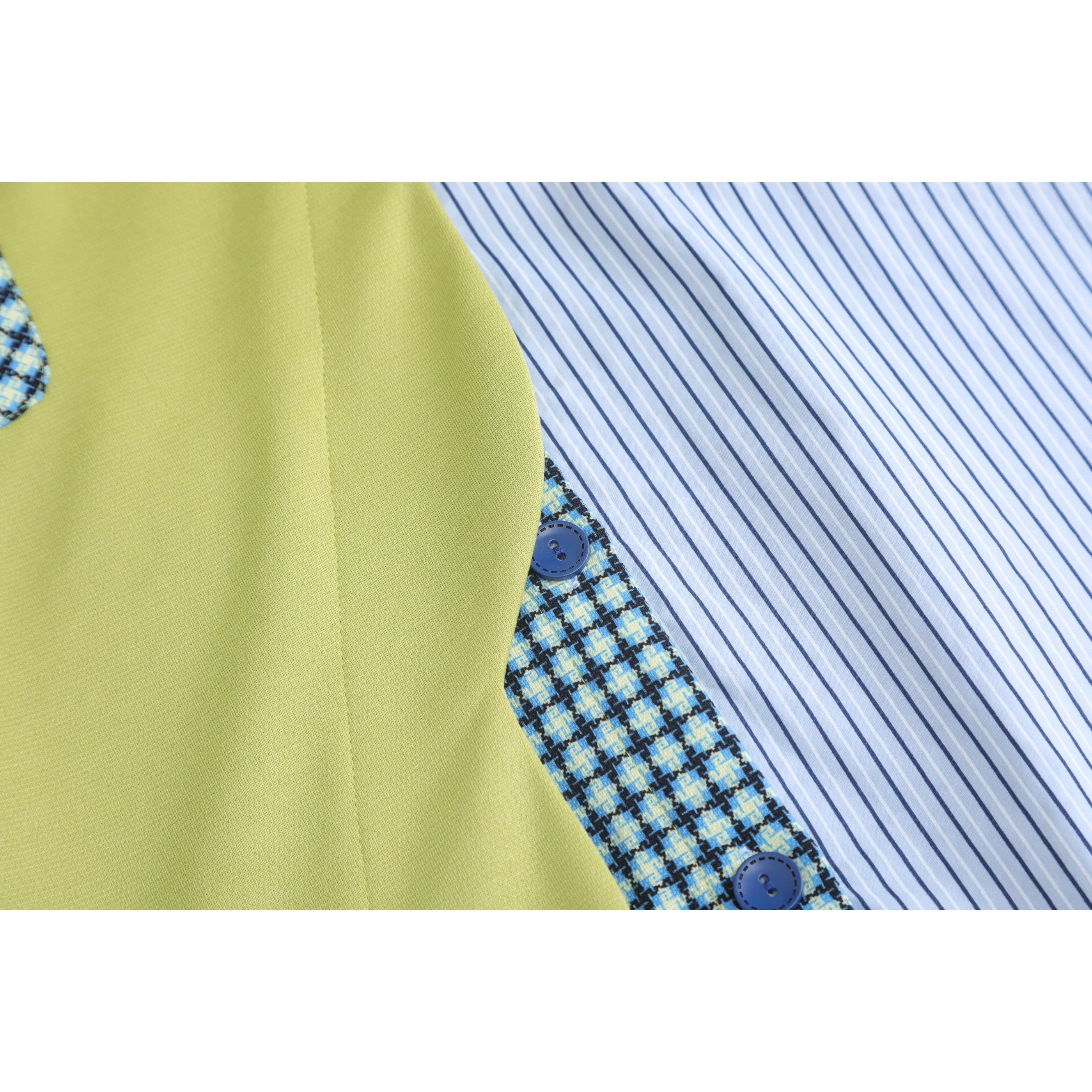 ブルーベースのストライプ、チェック柄、そしてイエローの無地の3種類の生地を組み合わせたフェイクツーピースデザインの、ポインテッドカラー・長袖・ラウンドカットのデザインシャツです。コーディネートの主役になる、目を惹くカジュアルアイテムです。