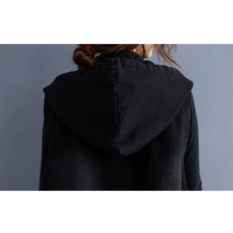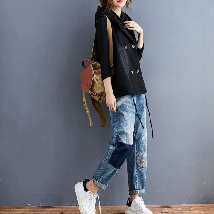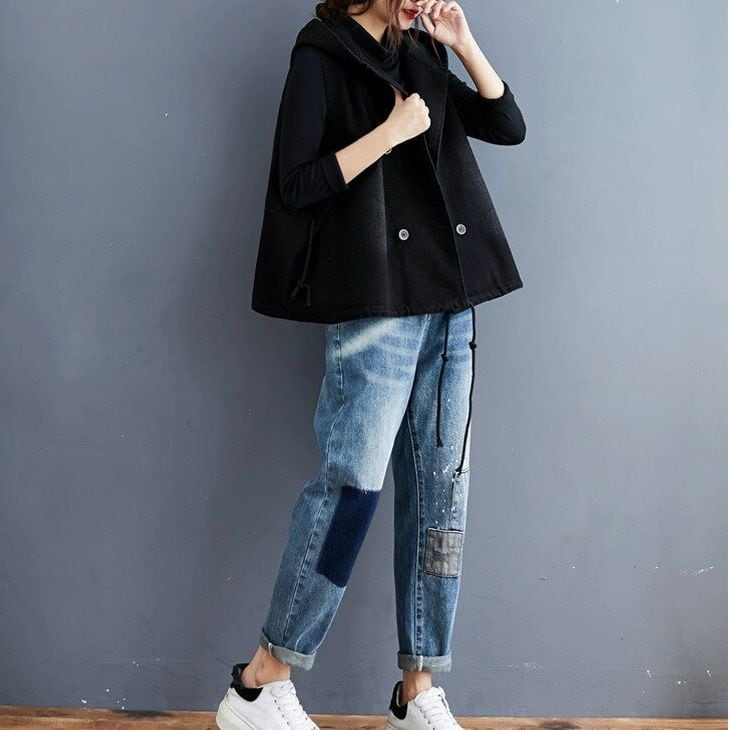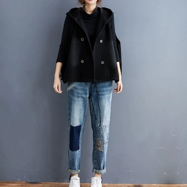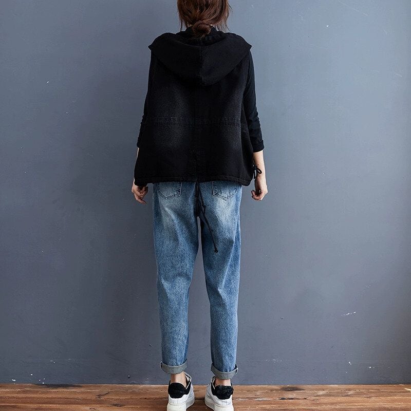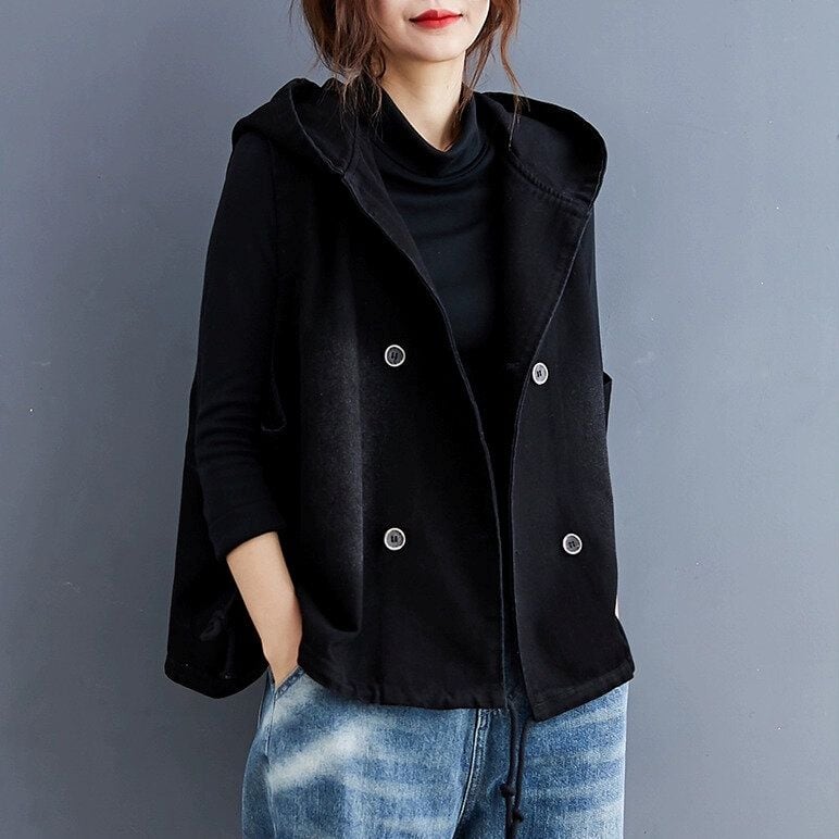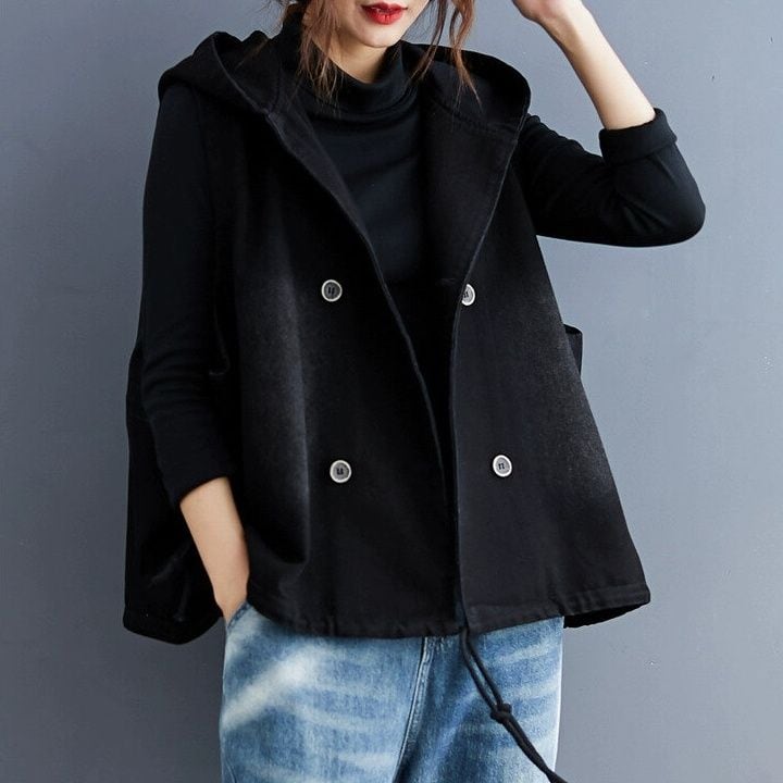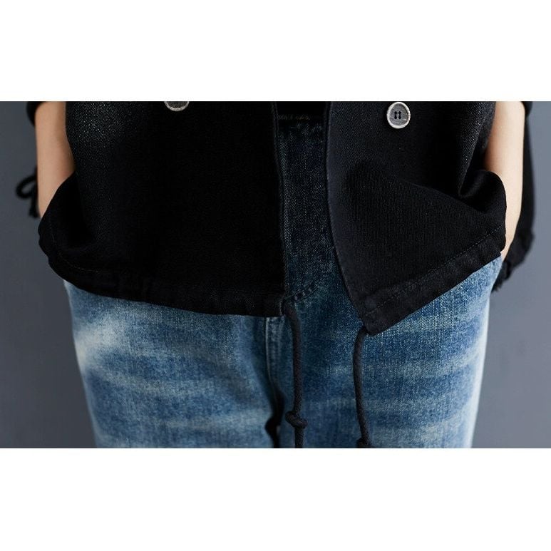 BLACK DENIM HOODED DOUBLE BREAST VEST JACKET 1color M-15010
