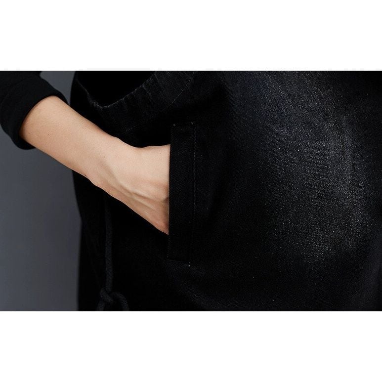 ブラックのデニム素材でできた、フード付き・ノースリーブ・ショート丈のベストジャケットです。ダブルブレストデザインで、裾にはドローストリングが付いています。シンプルで何にでも合わせやすい、カジュアルアイテムです。