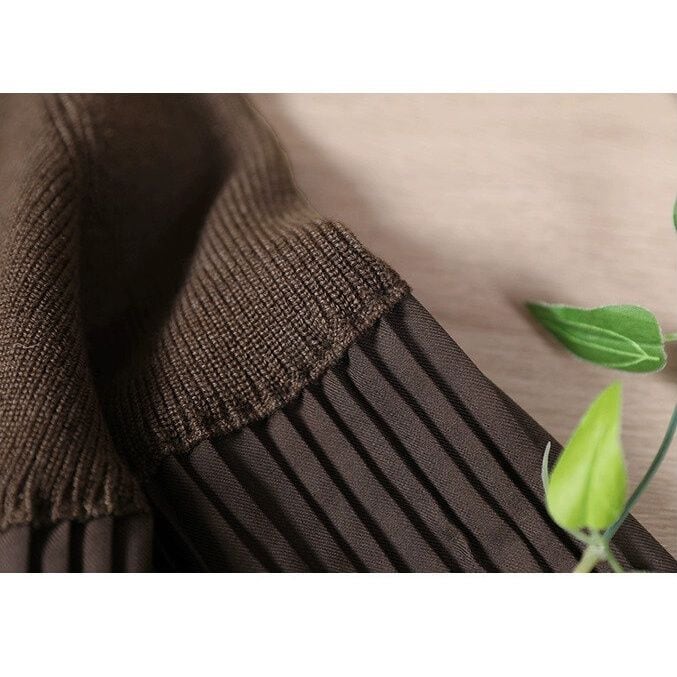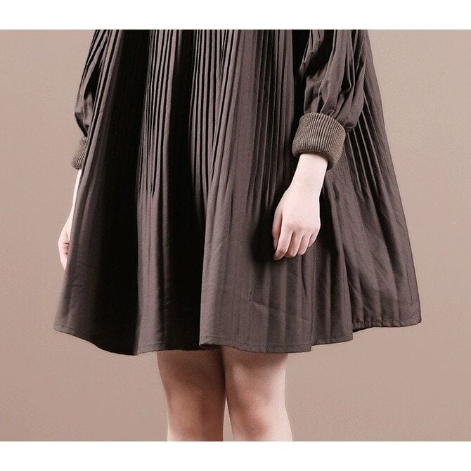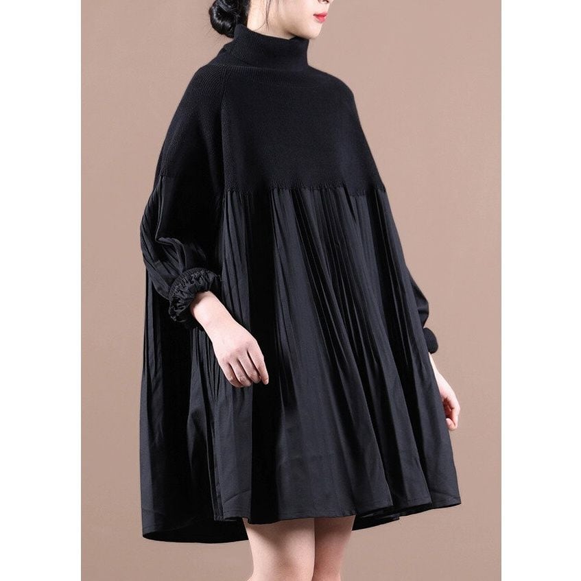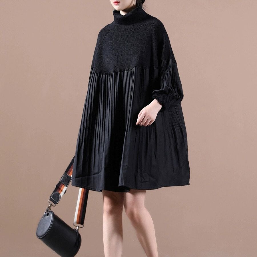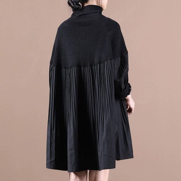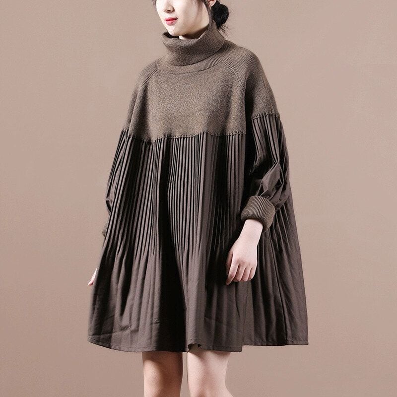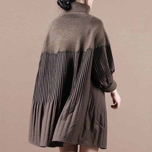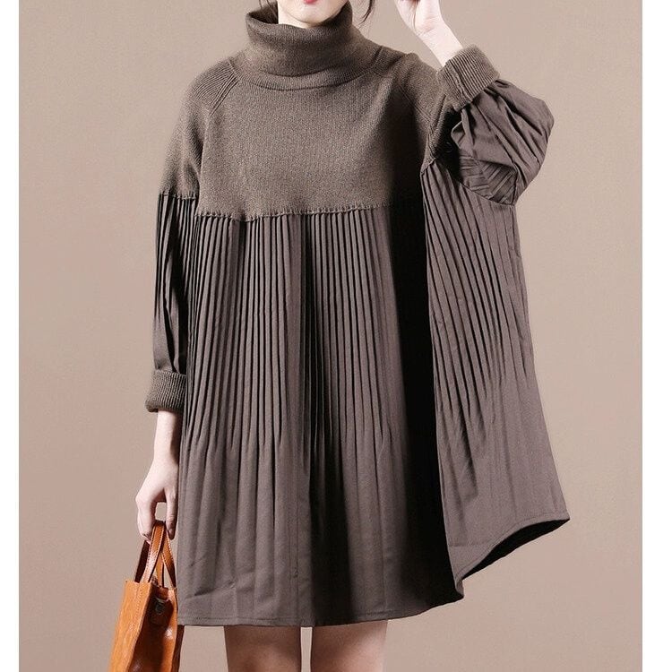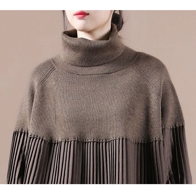 ニットとプリーツ素材のスティッチデザインがお洒落な、タートルネック・長袖・ミニ丈のプルオーバーワンピースです。ふんわりとしたAラインのシルエットがキュートな、チュニックとしても使えるカジュアルアイテムです。コーヒーとブラックの2色から選べます。