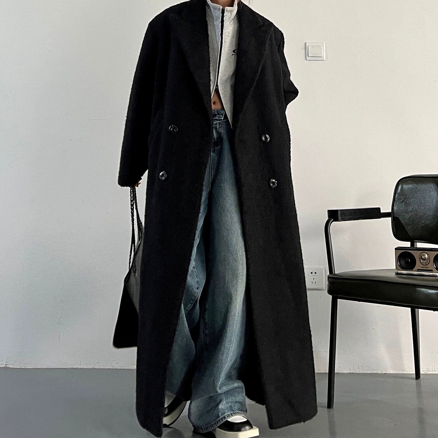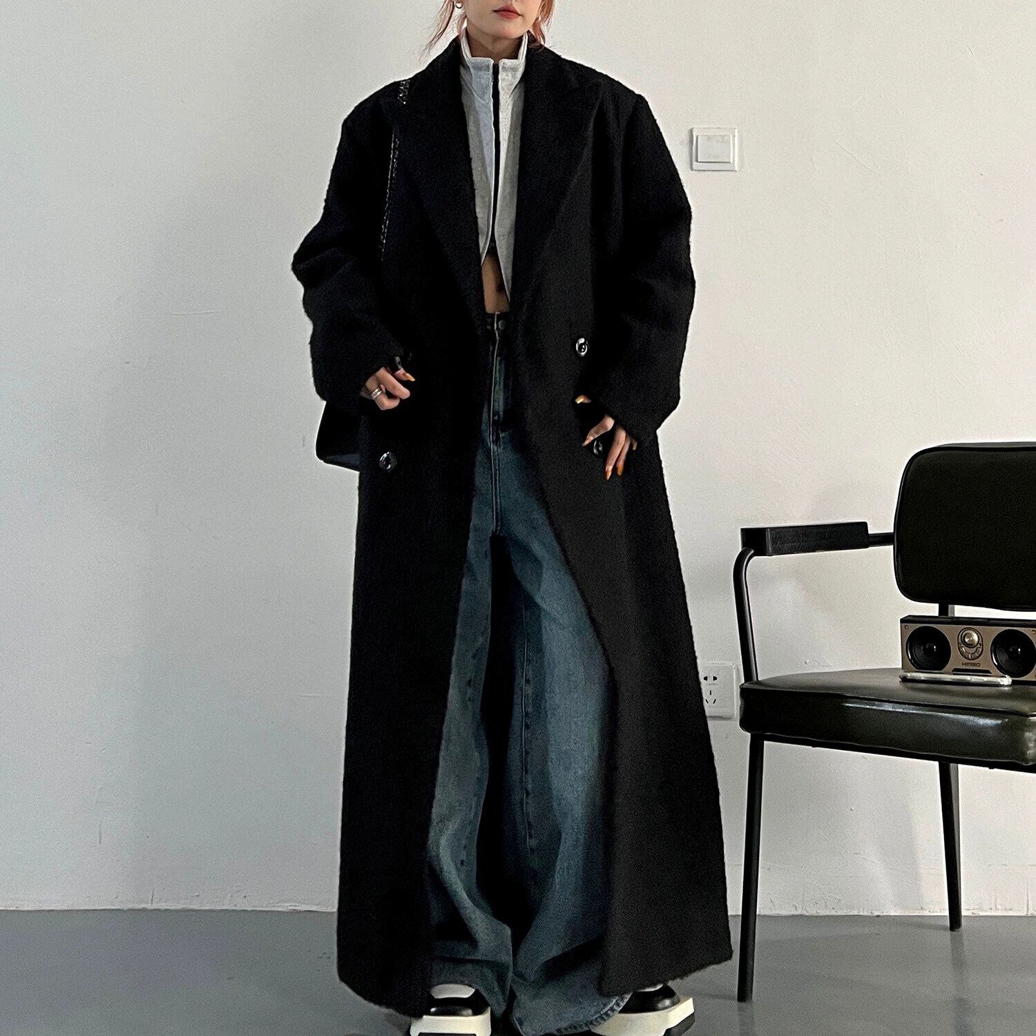 ブラックのシンプルなデザインが嬉しい、ラペル付きVネック・長袖・ロング丈のウールコートです。ダブルブレストデザインで、スウェットやセーターの上からでも羽織れるゆったりとしたシルエットです。オールブラックのクールな印象のアイテムです。