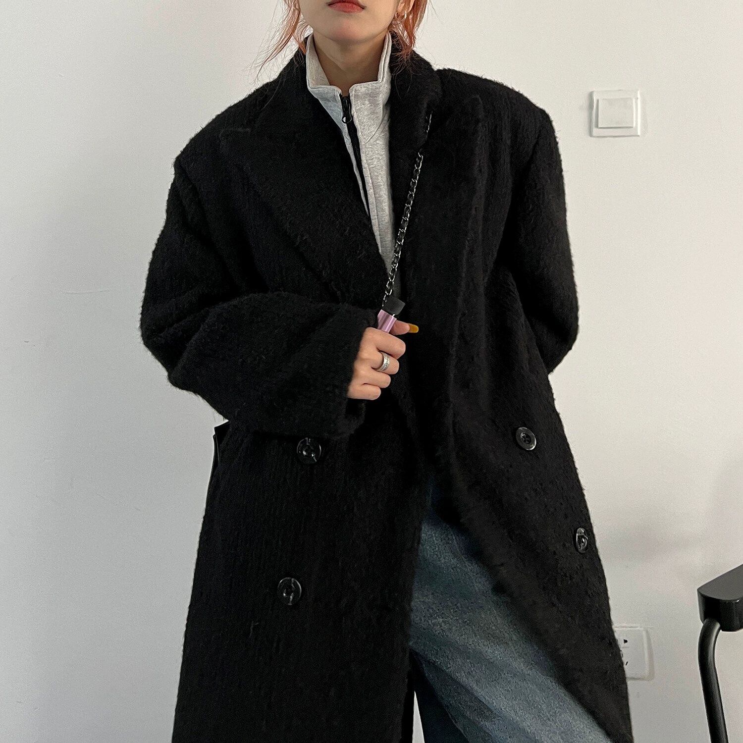 BLACK COLLARED V-NECK DOUBLE BREAST LONG WOOL COAT 1color M-15036