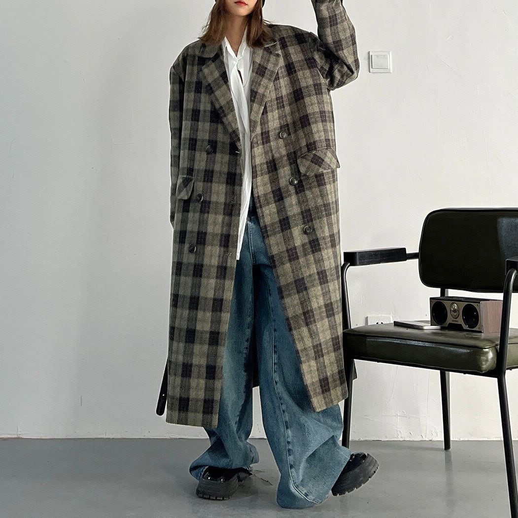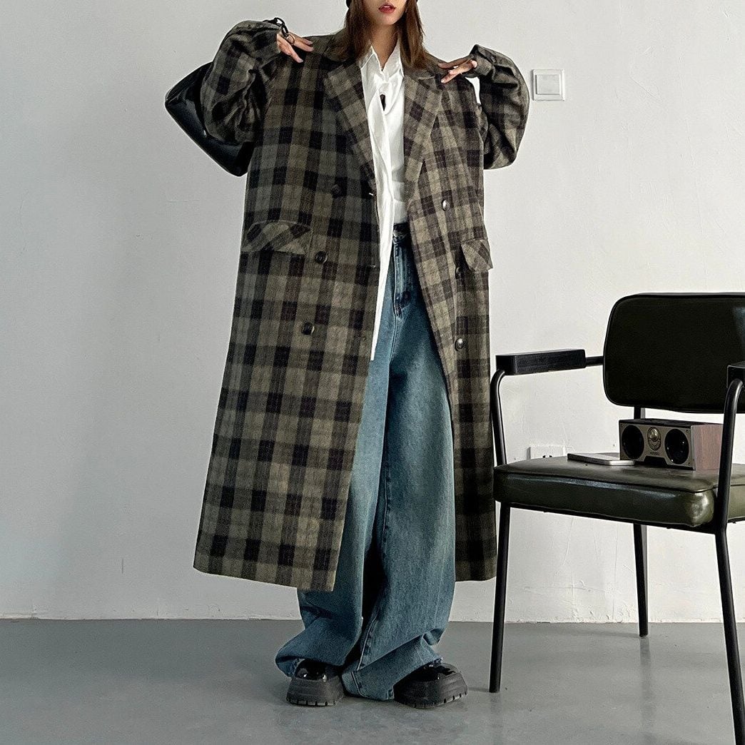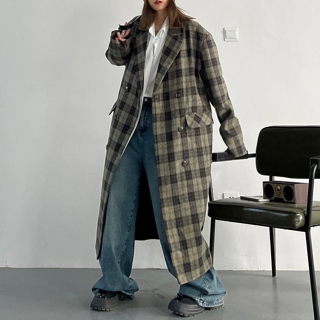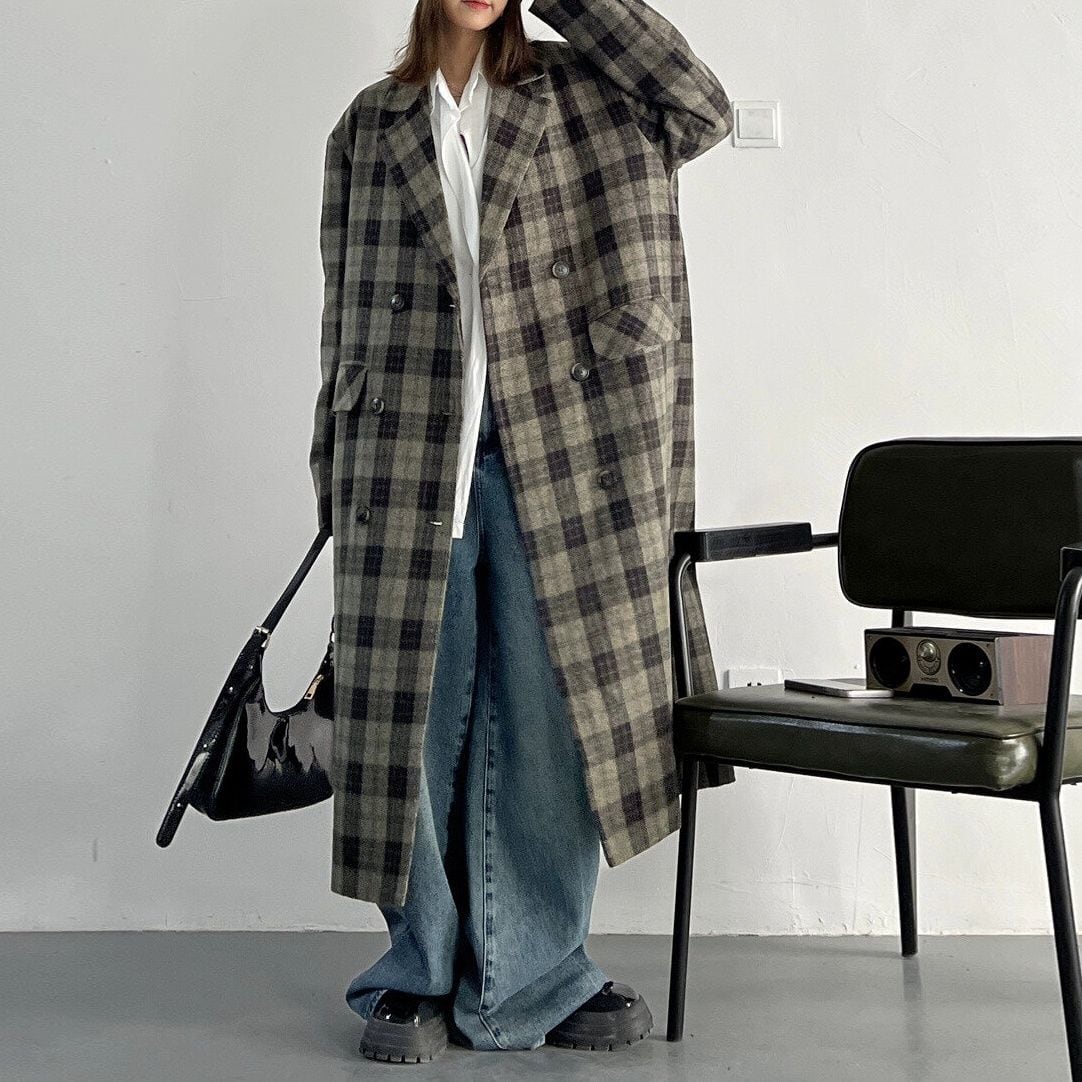 CHECKERED COLLARED V-NECK DOUBLE BREAST LONG WOOL COAT 1color M-15037