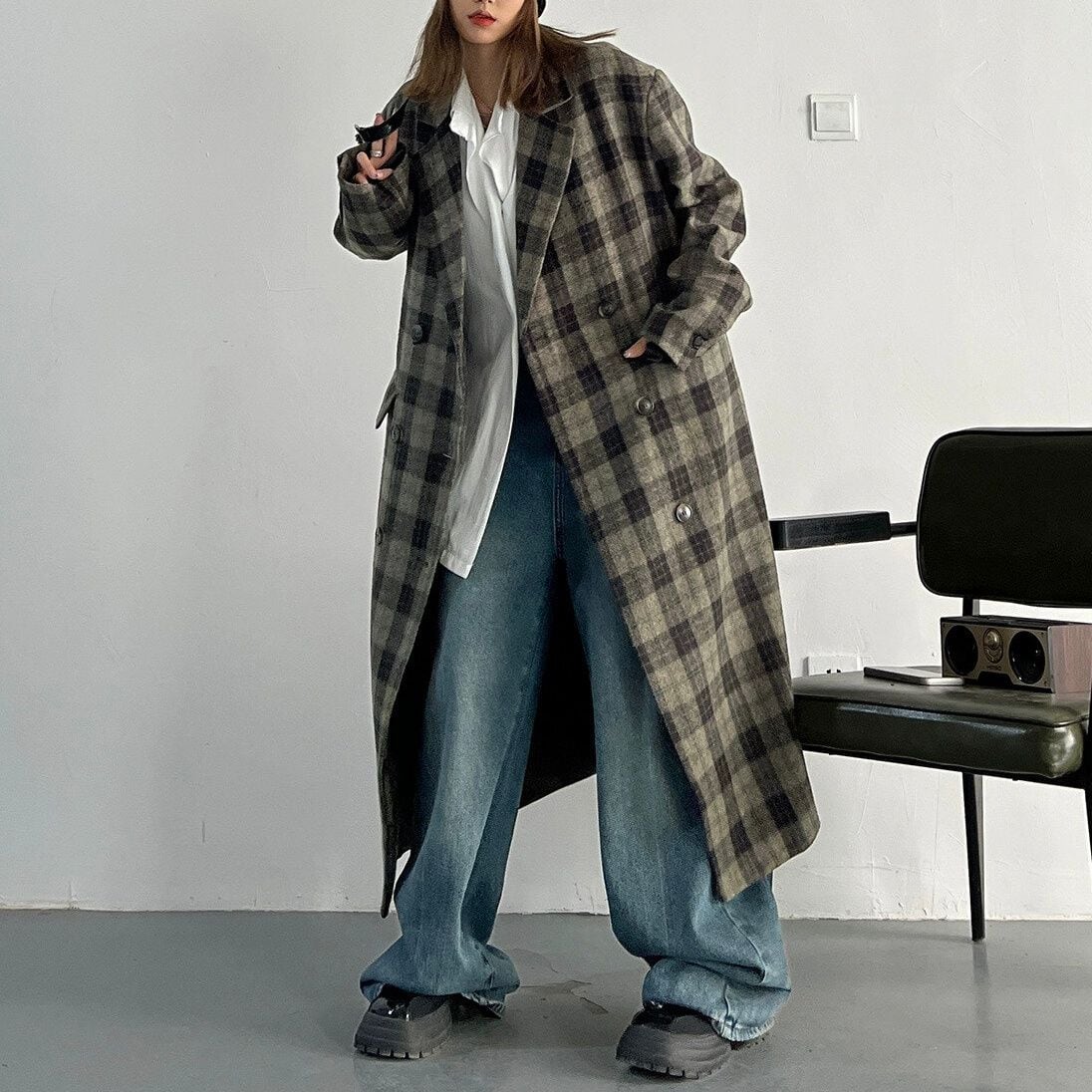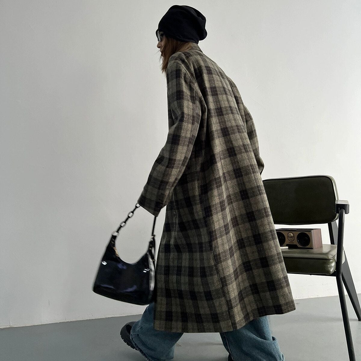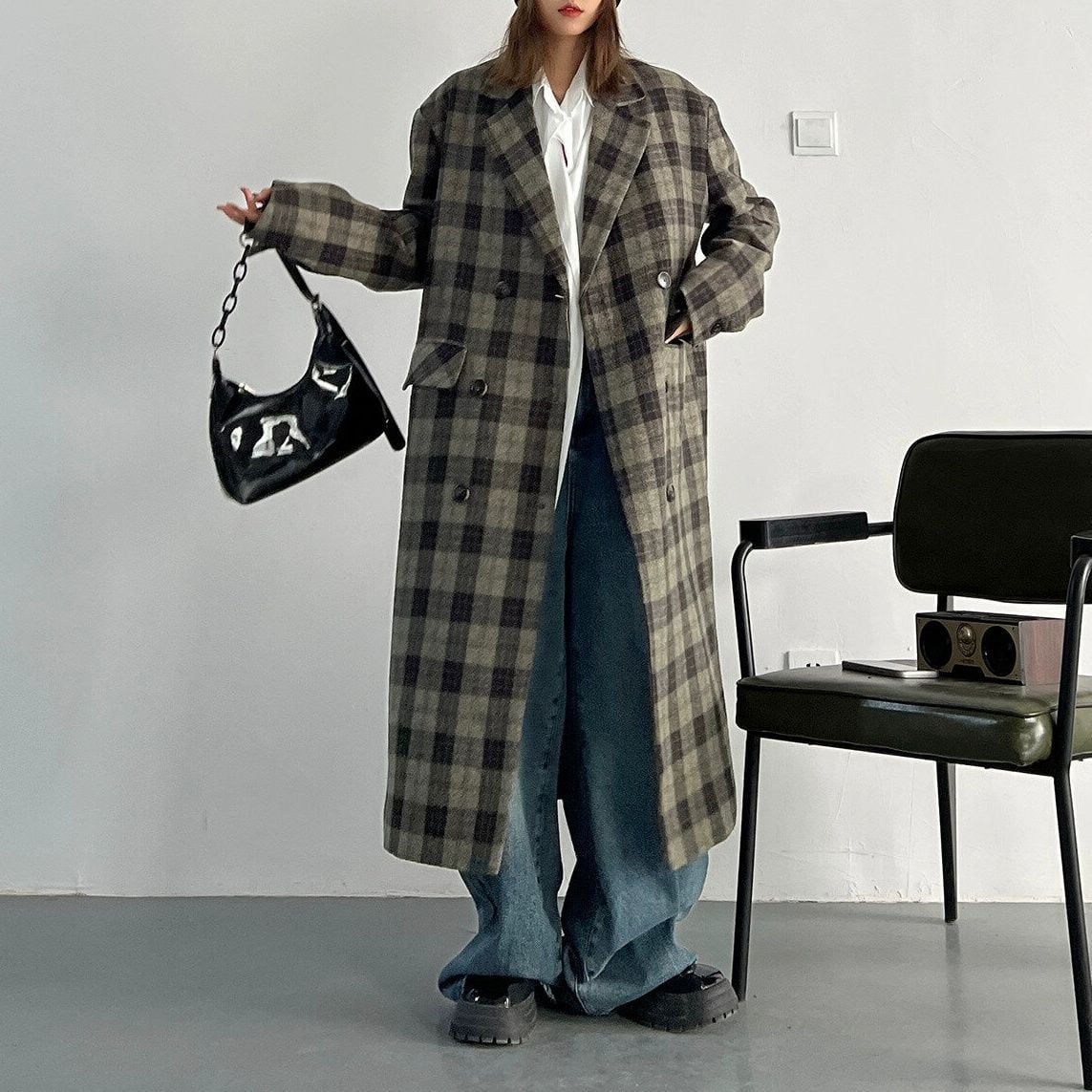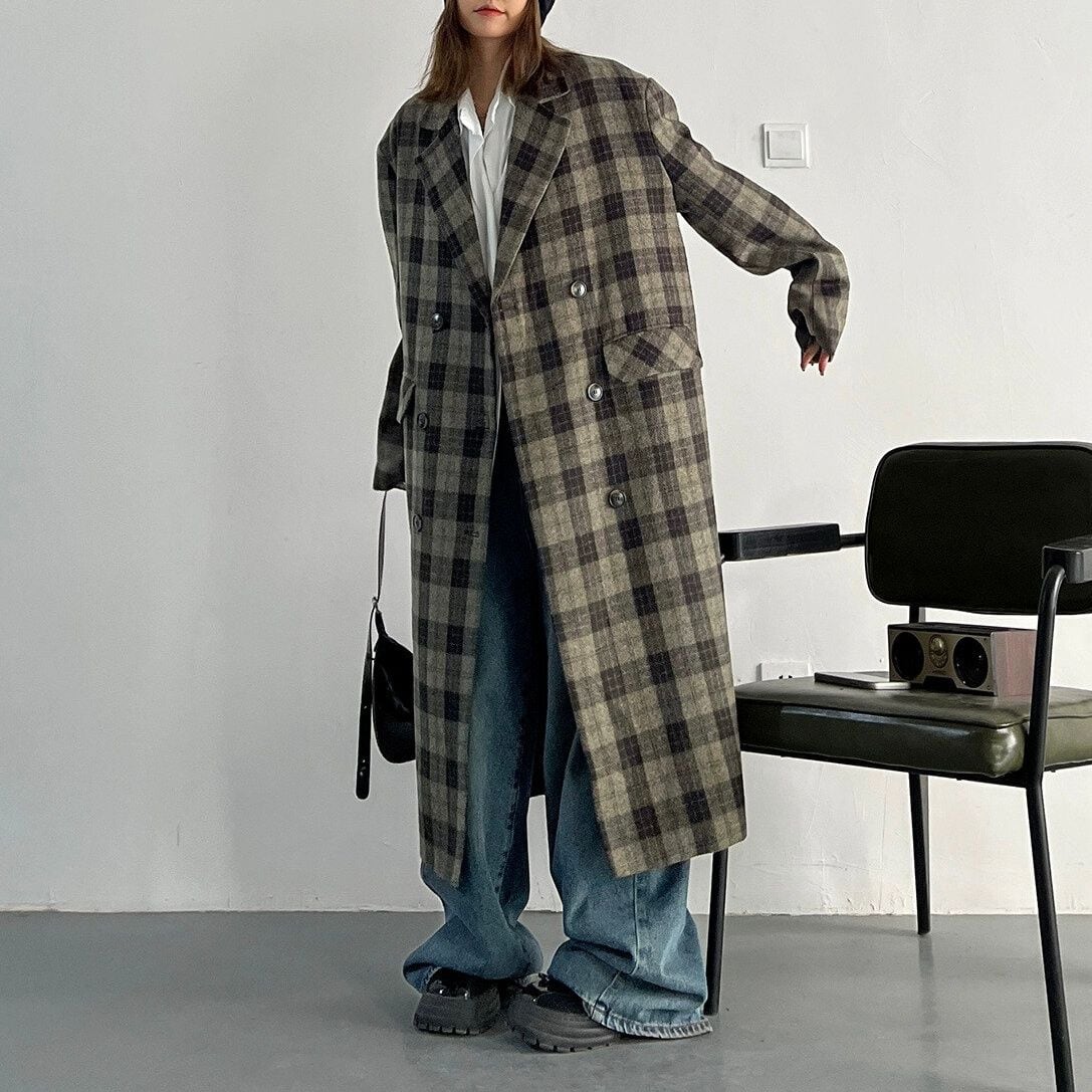 CHECKERED COLLARED V-NECK DOUBLE BREAST LONG WOOL COAT 1color M-15037