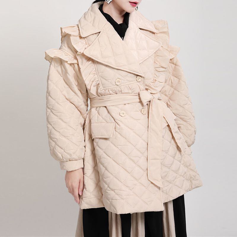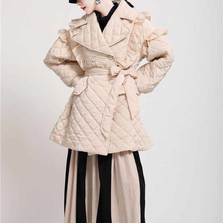 フリルのライン飾りがガーリーな、ラペル付きVネック・ダブルブレストの中綿コートです。キルティングのようなダイヤモンドのスティッチラインがキュートな、アプリコットカラーの防寒アイテムです。