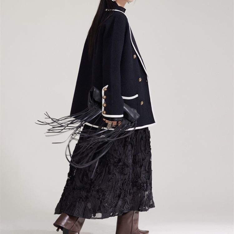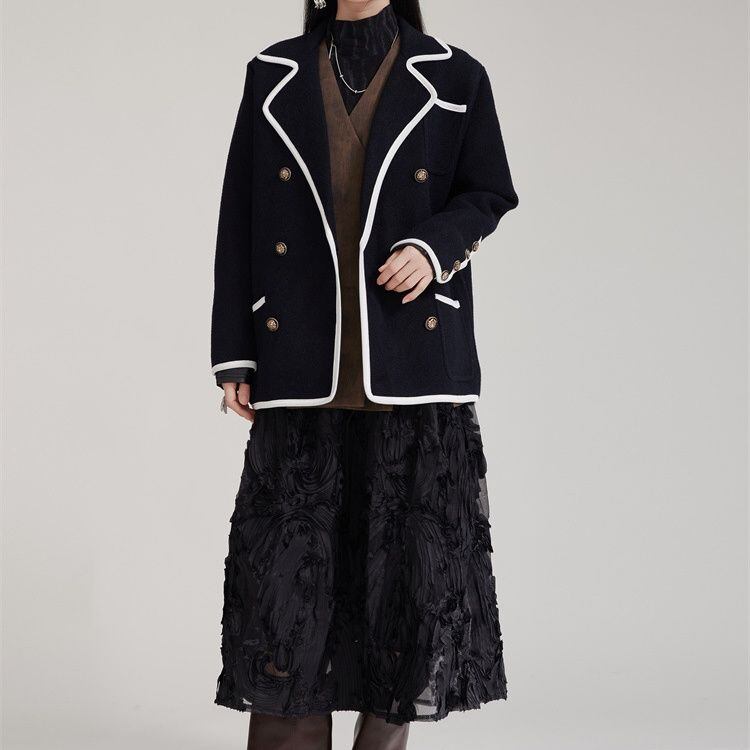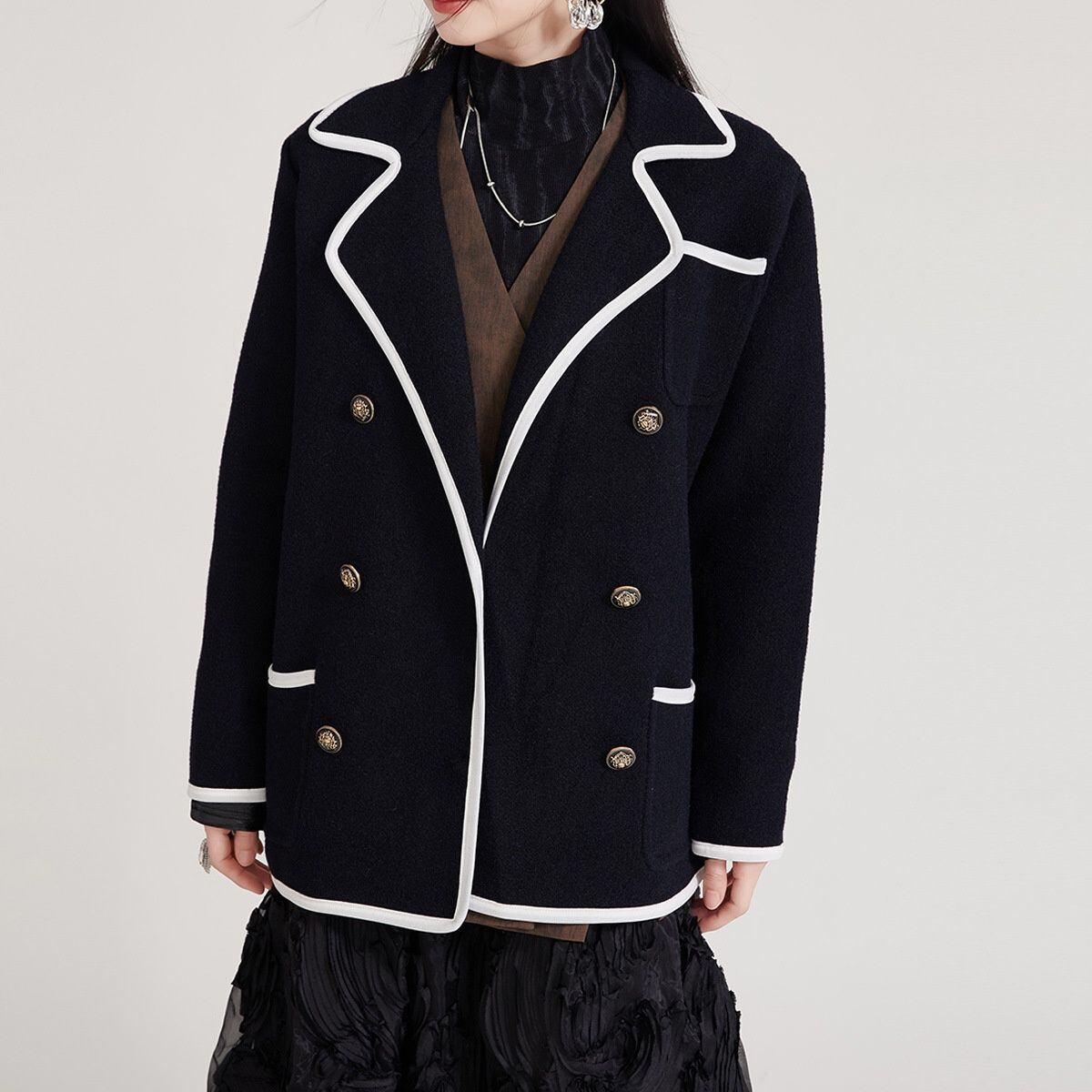 ブラック地に白い縁取りがお洒落な、ラペル付きVネック・ダブルブレストのショートコートです。デザインボタンがアクセントになった、制服のような上品さと爽やかさを感じるアイテムです。