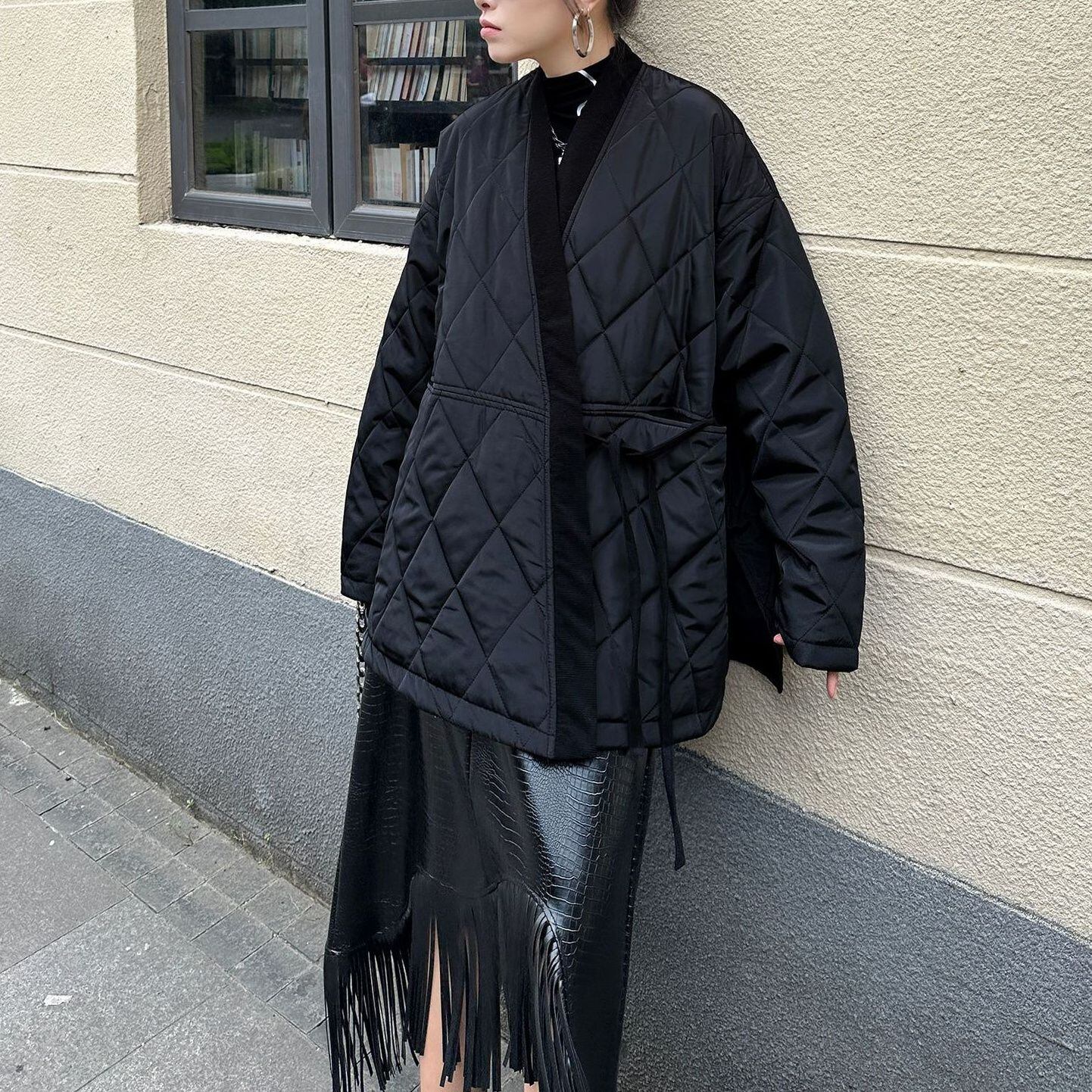 艶のあるブラックのキルティング素材がお洒落な、Vネック・長袖・ミドル丈のカーディガンコートです。留め具がなく、ストラップベルトを結ぶデザインです。ゆったりとしたワイド幅のシルエットで、何にでも合わせやすいカジュアルアイテムです。