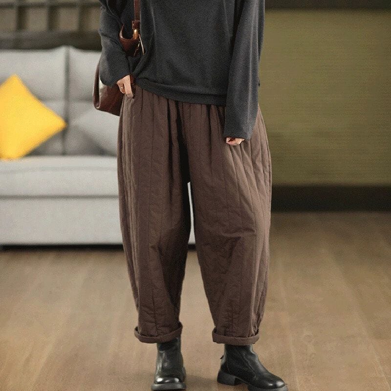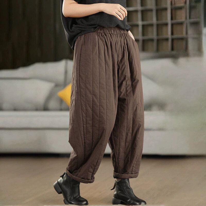 コーヒーブラウンのストライプスティッチキルティングが暖かくてキュートな、ワイドレッグ・中綿・カジュアルパンツです。ウエストはゴムなので、着脱が簡単で履き心地が良いです。裾に向かってやや絞った、バギーシルエットがお洒落な防寒アイテムです。
