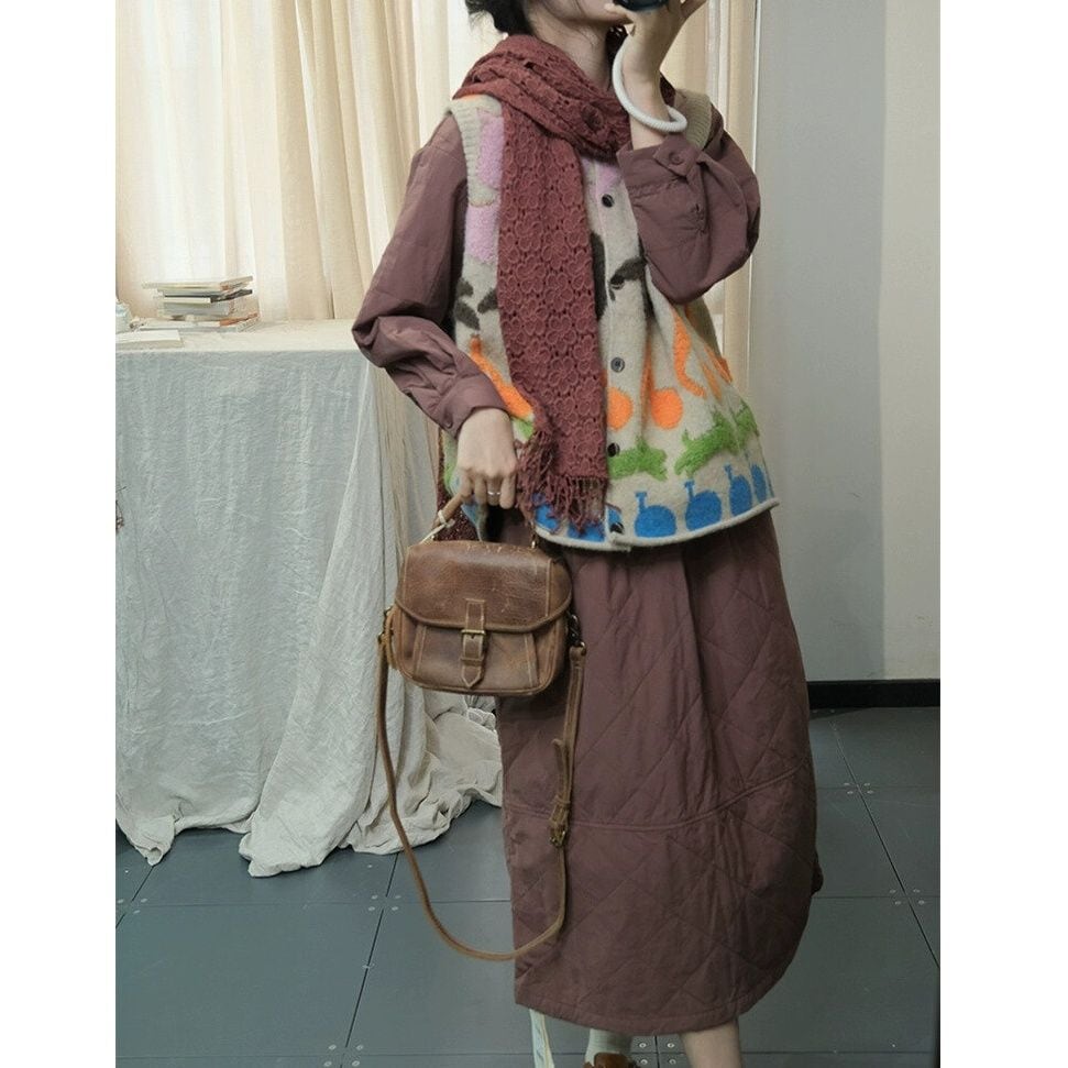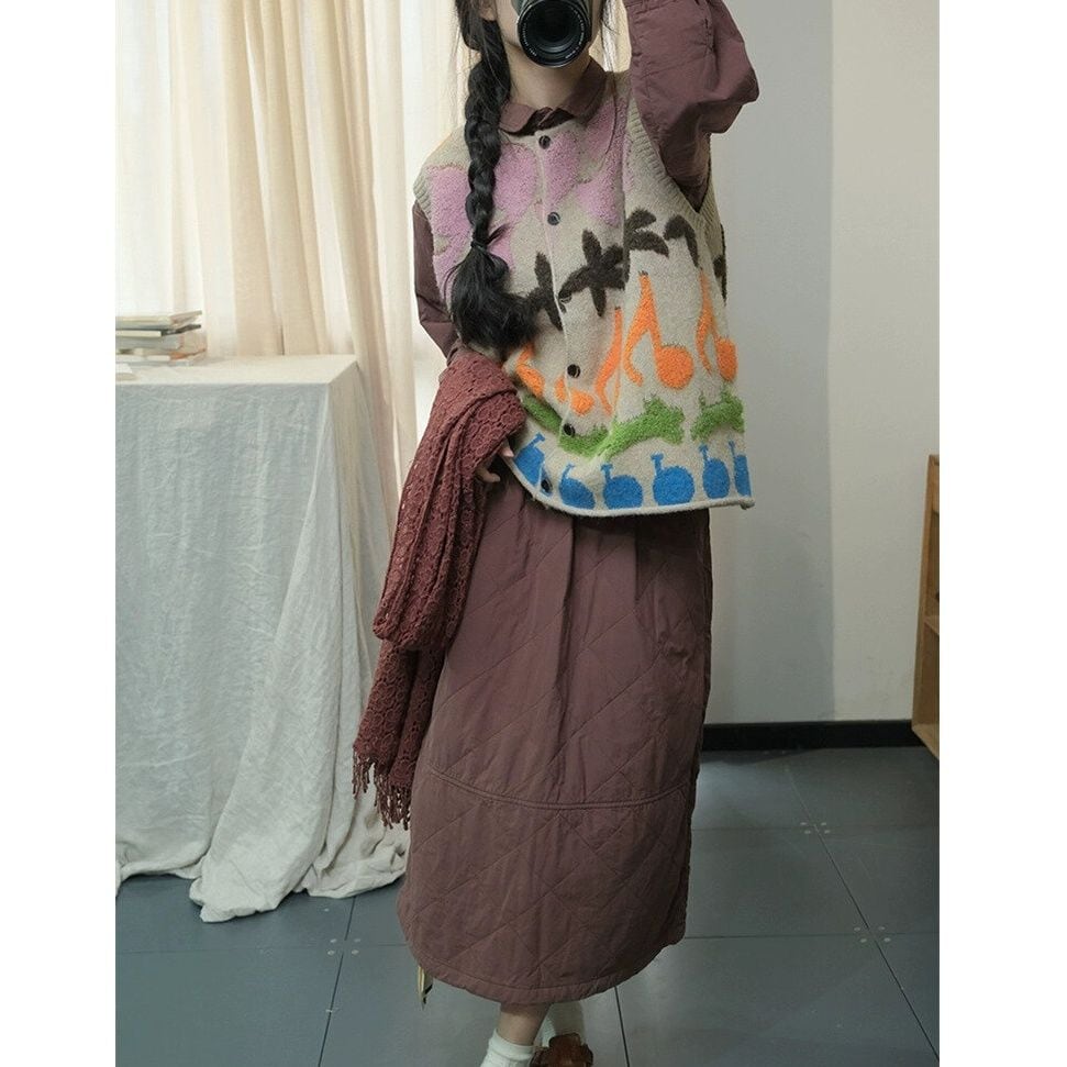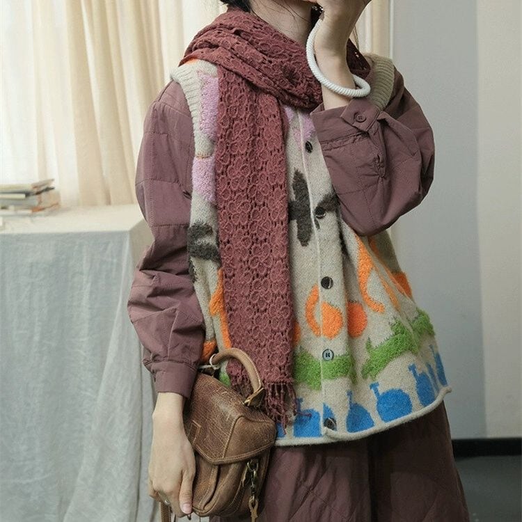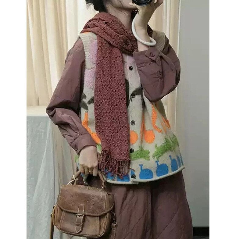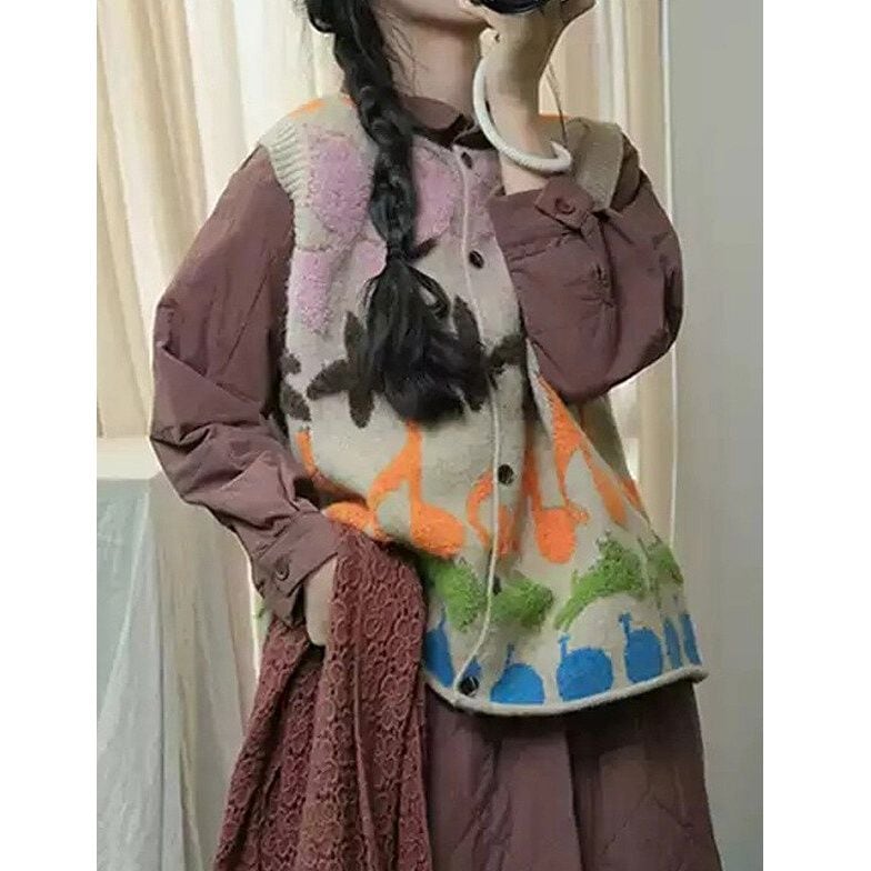 アプリコット地にカラフルな柄が目を惹く、ラウンドネックのニットベスト・カーディガンです。ゆったりとしたシルエットで重ね着しやすい、コーディネートのアクセントになるあったか・カジュアルアイテムです。