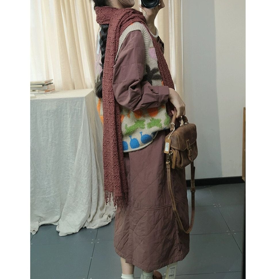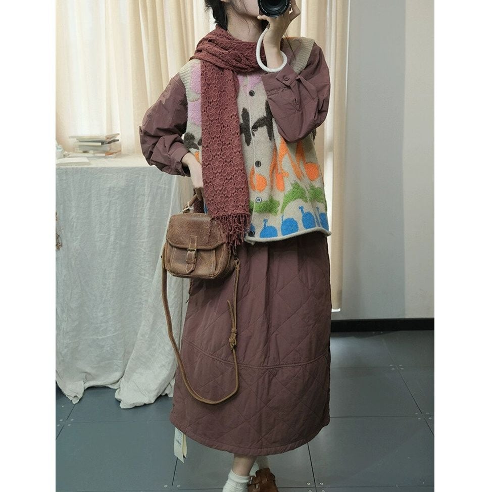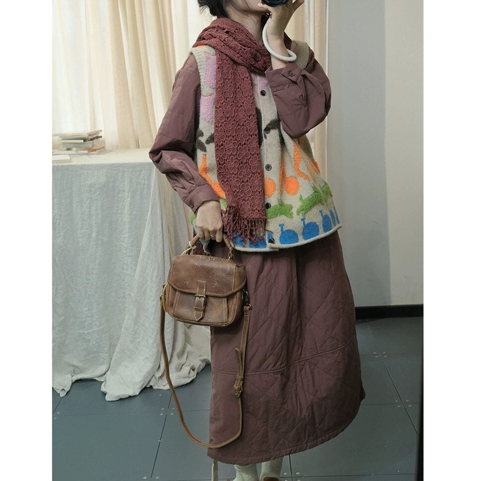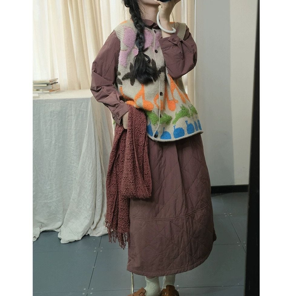 アプリコット地にカラフルな柄が目を惹く、ラウンドネックのニットベスト・カーディガンです。ゆったりとしたシルエットで重ね着しやすい、コーディネートのアクセントになるあったか・カジュアルアイテムです。