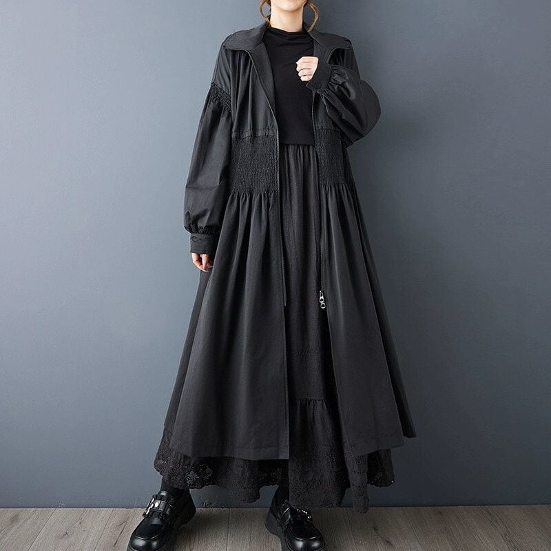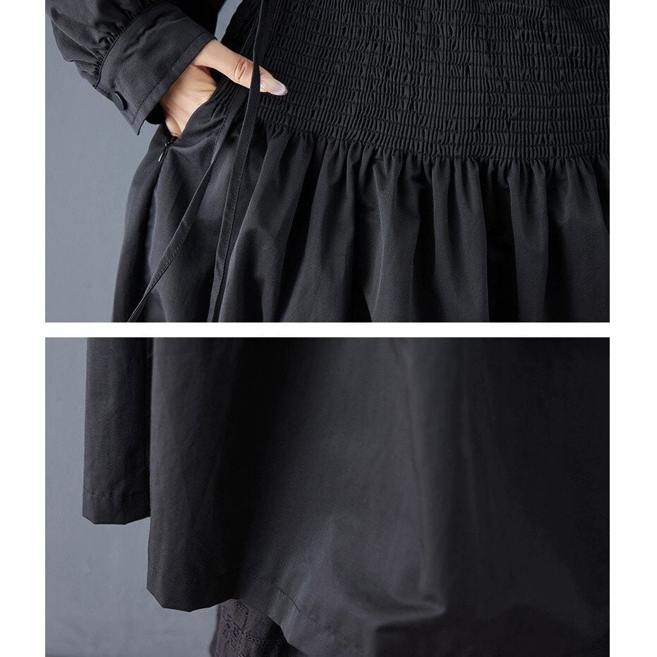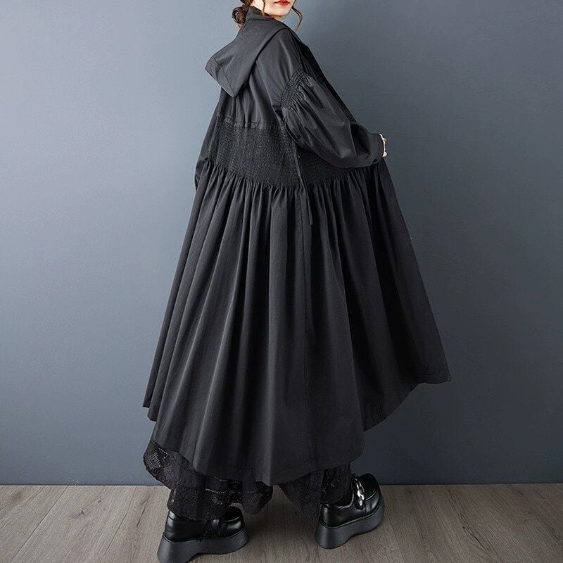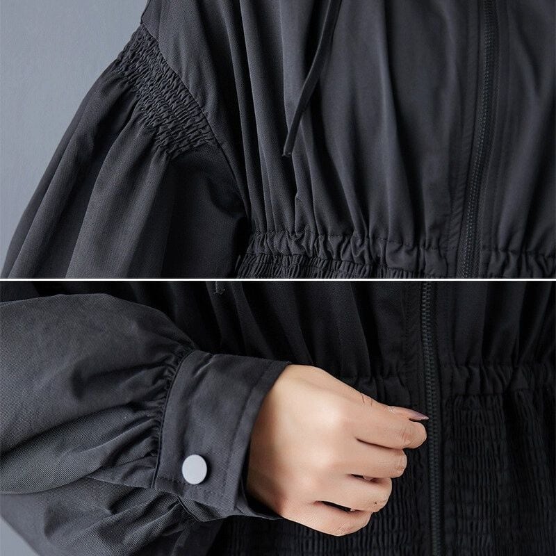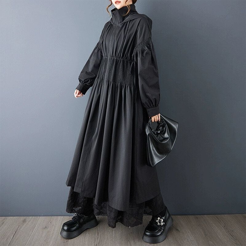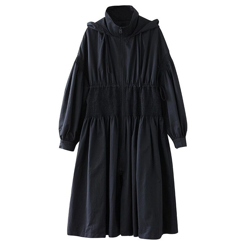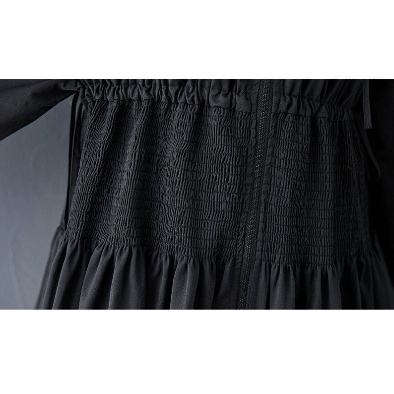 ウエストのシャーリングがアクセントになった、フード付き・長袖・ロング丈・ウインドブレーカーコートです。オールブラックのフルジップデザインで、ワンピースのようなAラインのシルエットが魅力的なアイテムです。