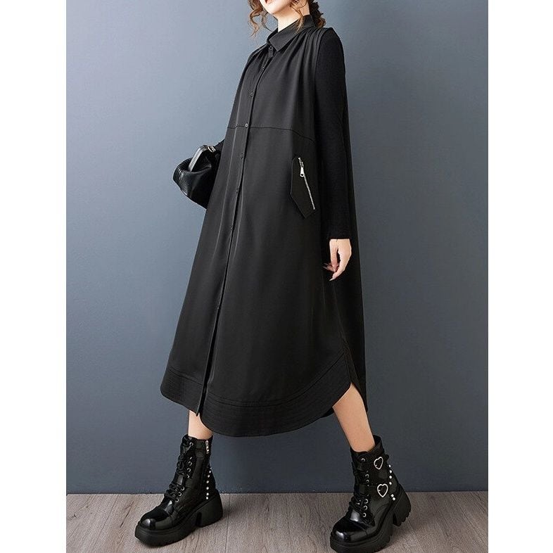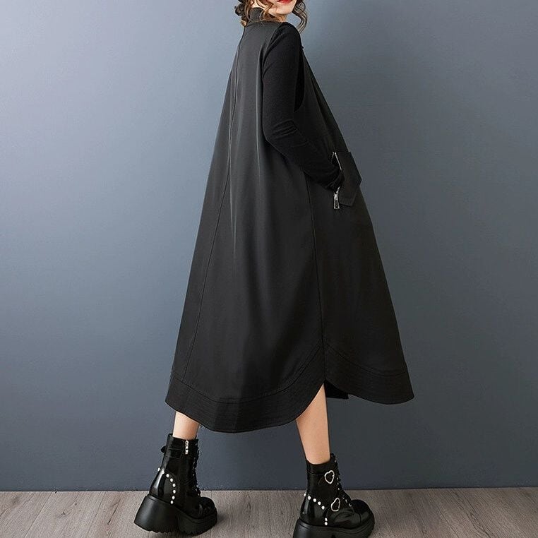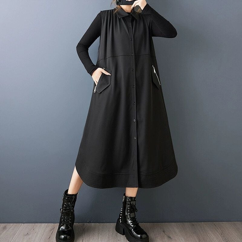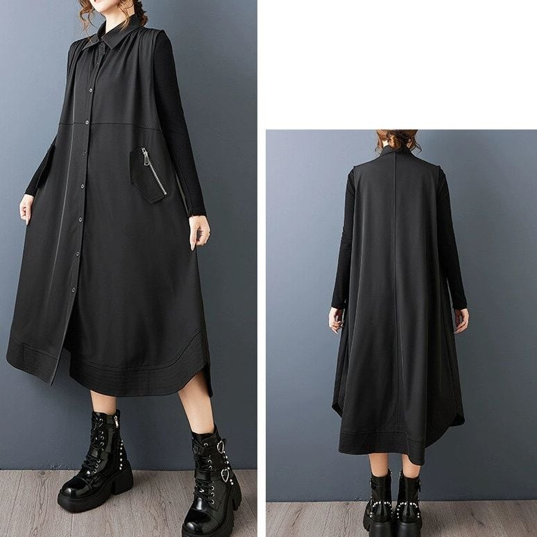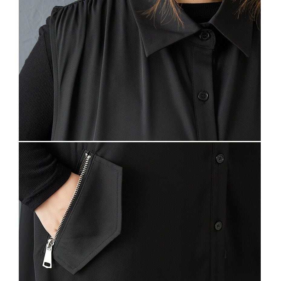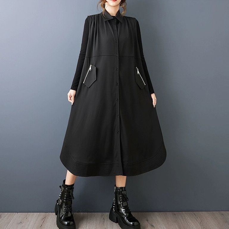 ジップとフラップのデザインポケットがお洒落な、ポロ襟・ノースリーブ・ラウンドカット・ミドル丈のシャツワンピースです。ブラックのシンプルなデザインがクールな、Aラインシルエットのカジュアルアイテムです。