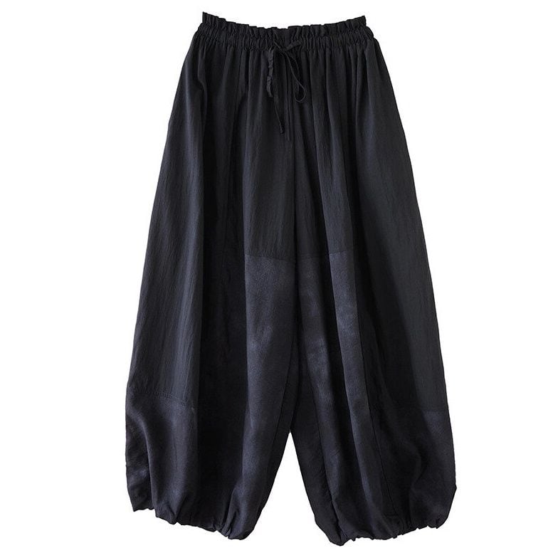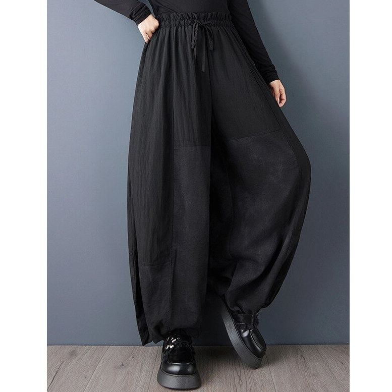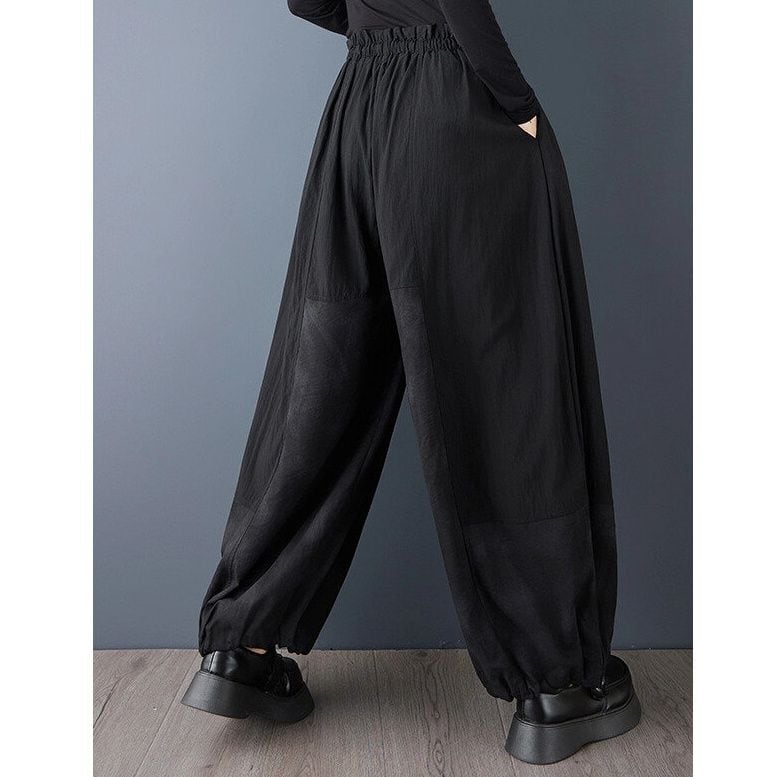 ランタンのようなシルエットが魅力的な、ブラックのハーレムパンツです。ウエストはゴム+ドローストリングで、着脱が簡単で履き心地が良いです。さりげないスティッチデザインがお洒落な、単色でコーディネートしやすいアイテムです。