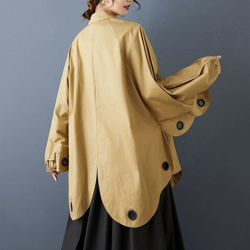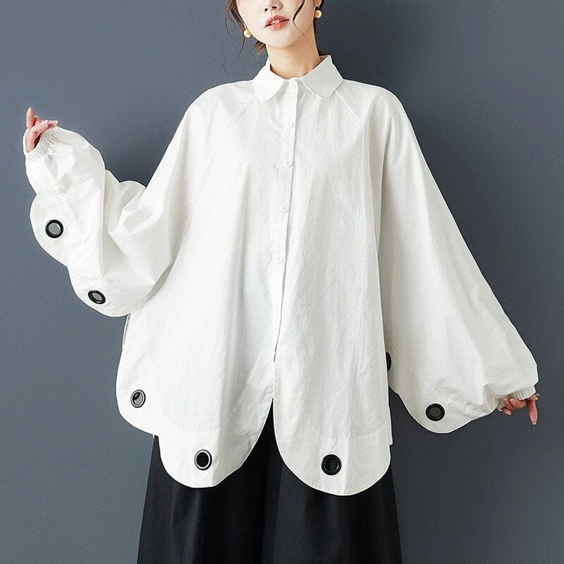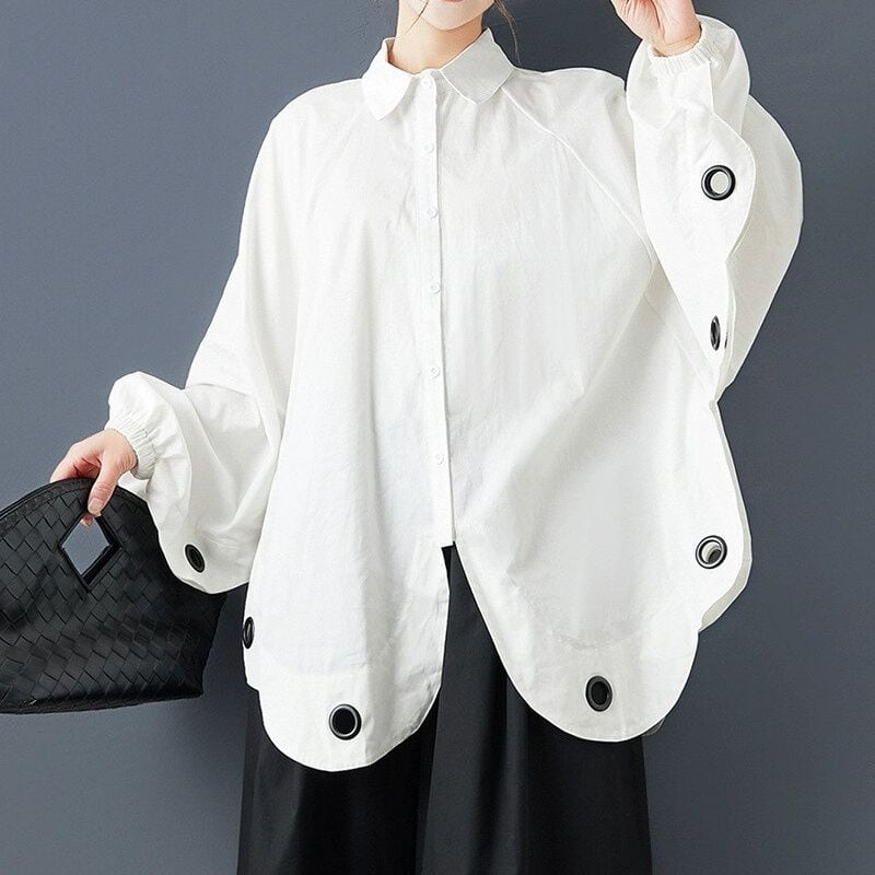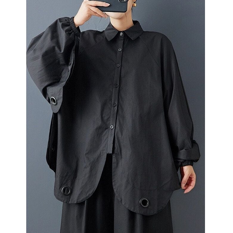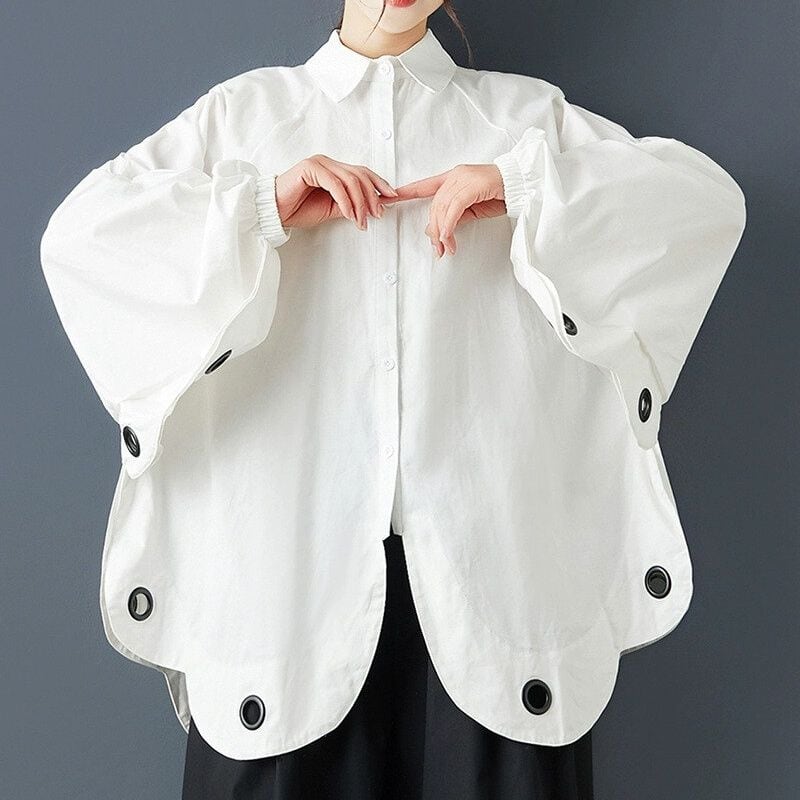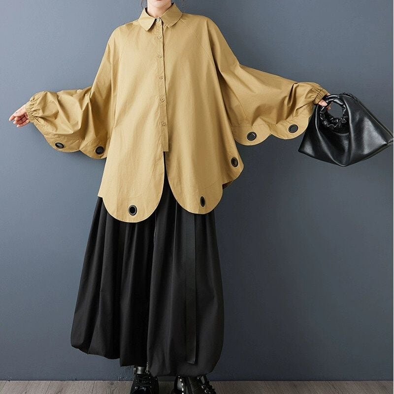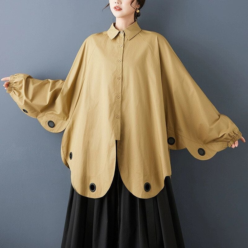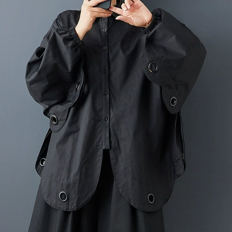ハトメを使った蝶のようなシルエットが目を惹く、ポロ襟・長袖・イレギュラーヘムのデザインシャツです。カーキの落ち着いた色味でどんなボトムスとも合わせやすい、コーディネートの主役になるアイテムです。ブラック・ホワイト・カーキの3色から選べます。