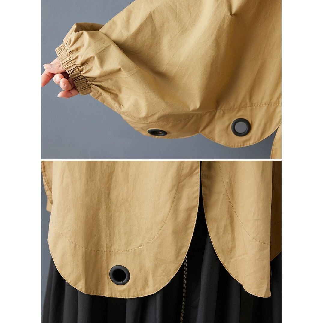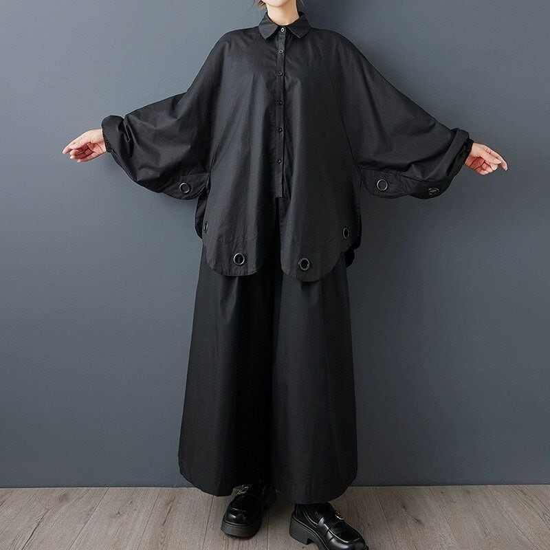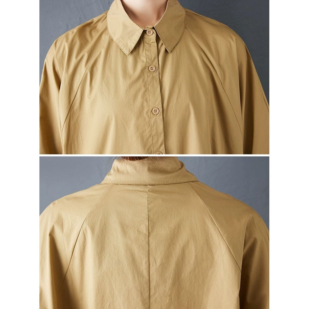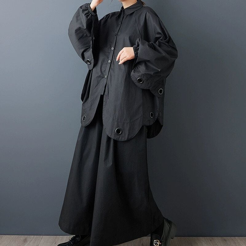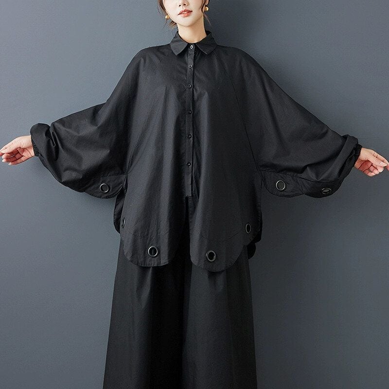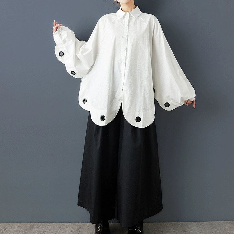 ハトメを使った蝶のようなシルエットが目を惹く、ポロ襟・長袖・イレギュラーヘムのデザインシャツです。カーキの落ち着いた色味でどんなボトムスとも合わせやすい、コーディネートの主役になるアイテムです。ブラック・ホワイト・カーキの3色から選べます。