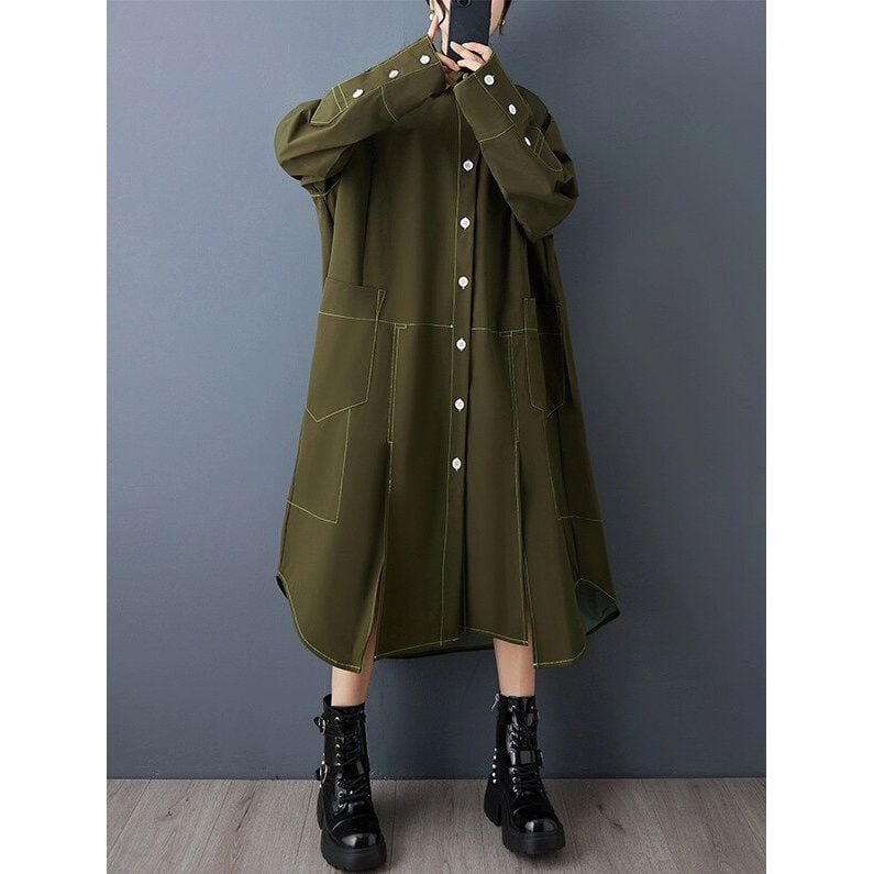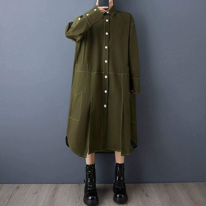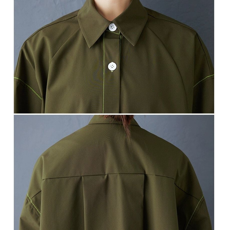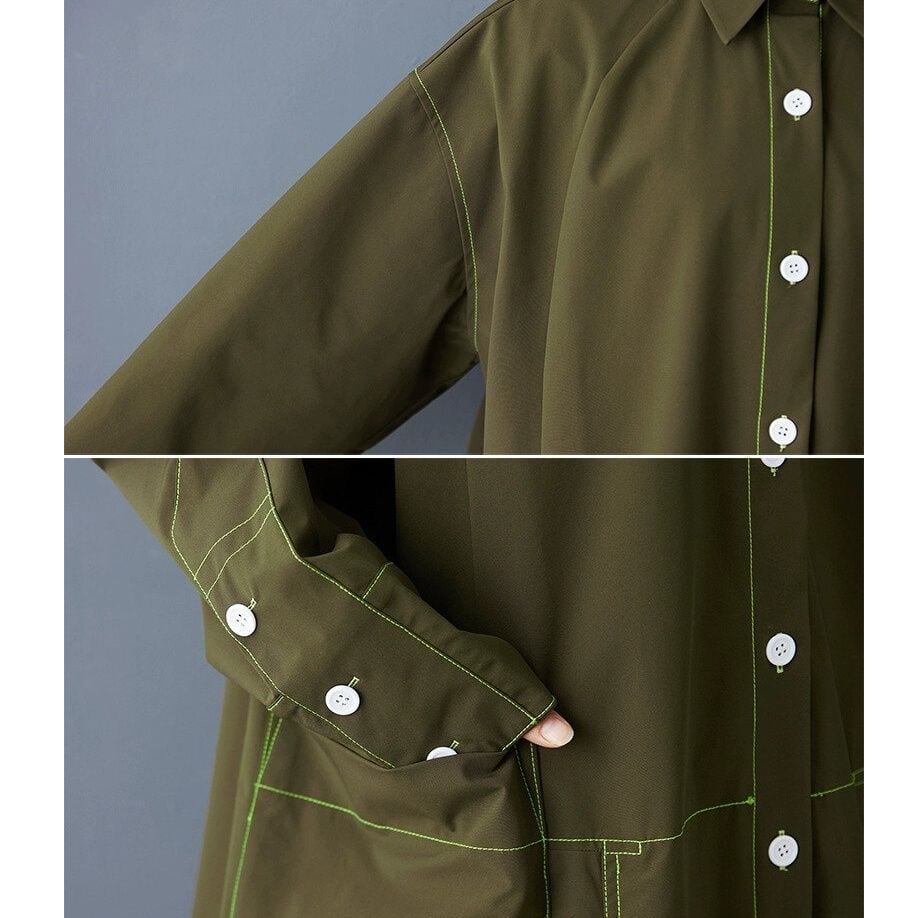 遊び心を感じるスティッチラインやスリットがキュートな、アーミーグリーンのポロ襟・長袖・膝下丈のシャツワンピースです。白い大きめのボタンがアクセントになっています。ゆったりとしたシルエットで、シャツジャケットとしても活躍するカジュアルアイテムです。