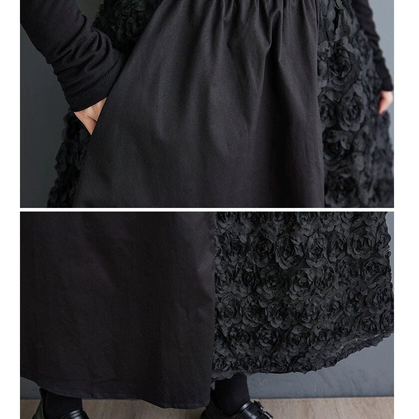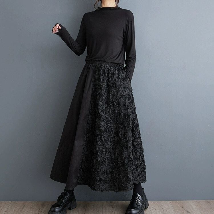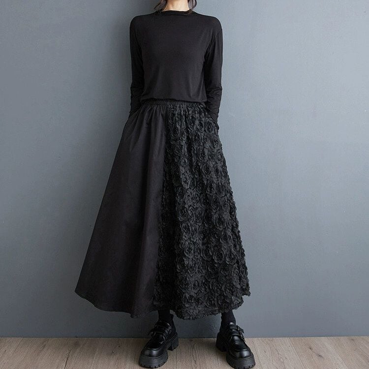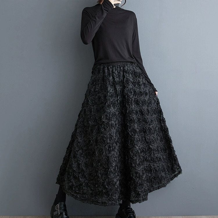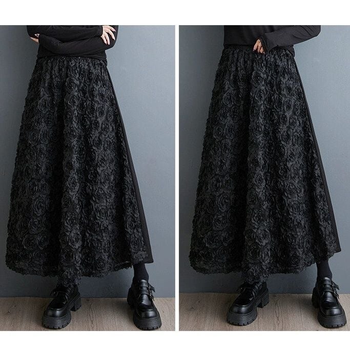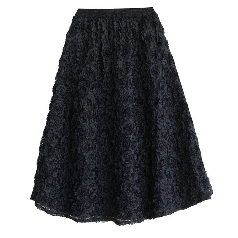 BLACK 3D FLOWER A-LINE LONG SKIRT 1color M-15073