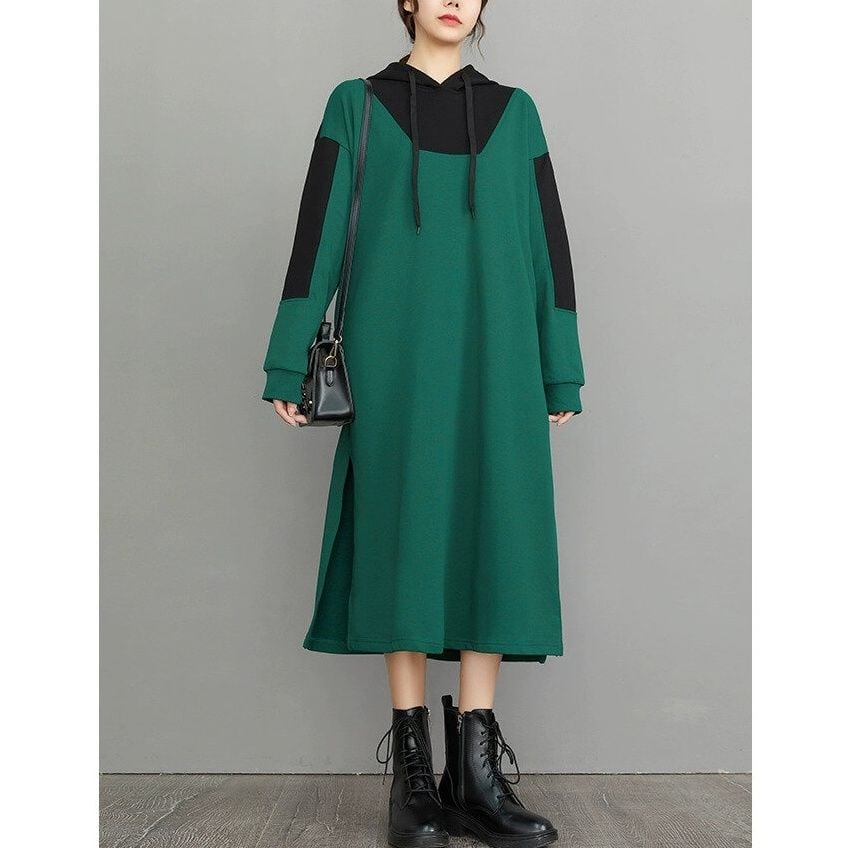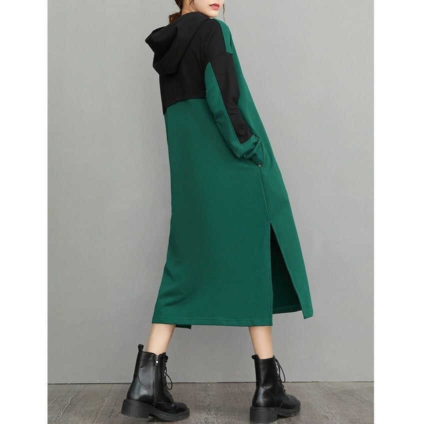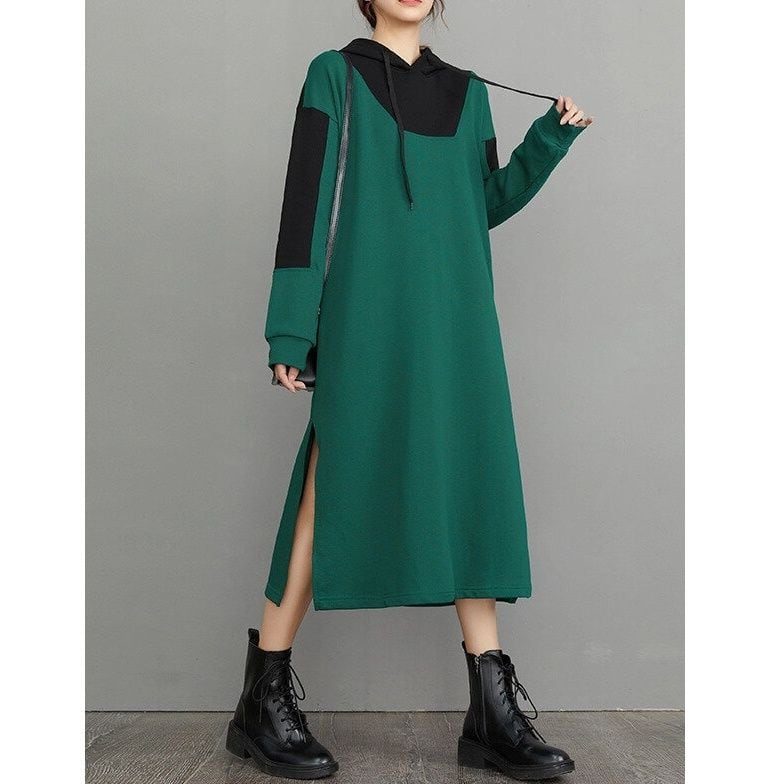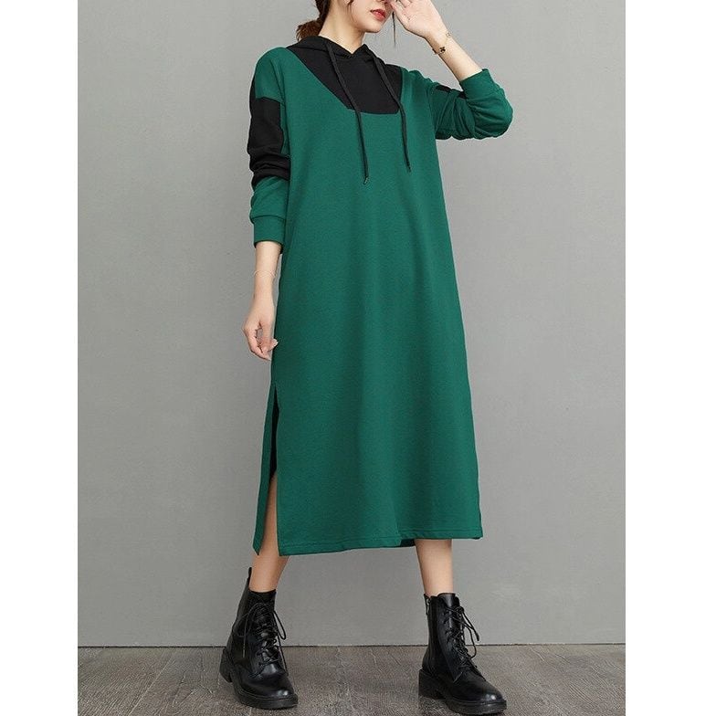 CONTRAST STITCH HOODED A-LINE SIDE SPLIT MIDI SWEAT DRESS 1color M-15076