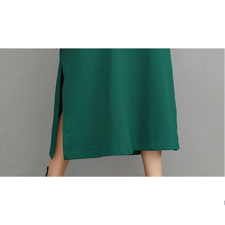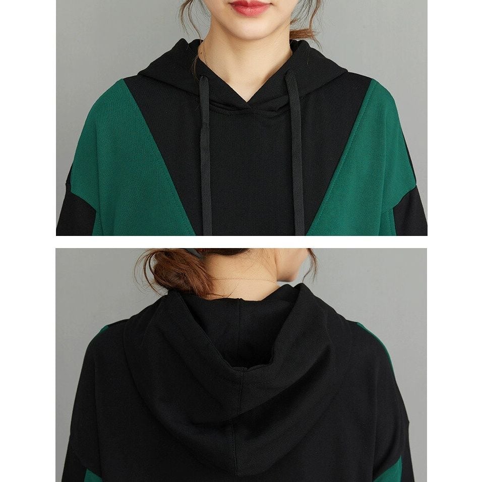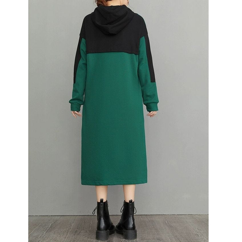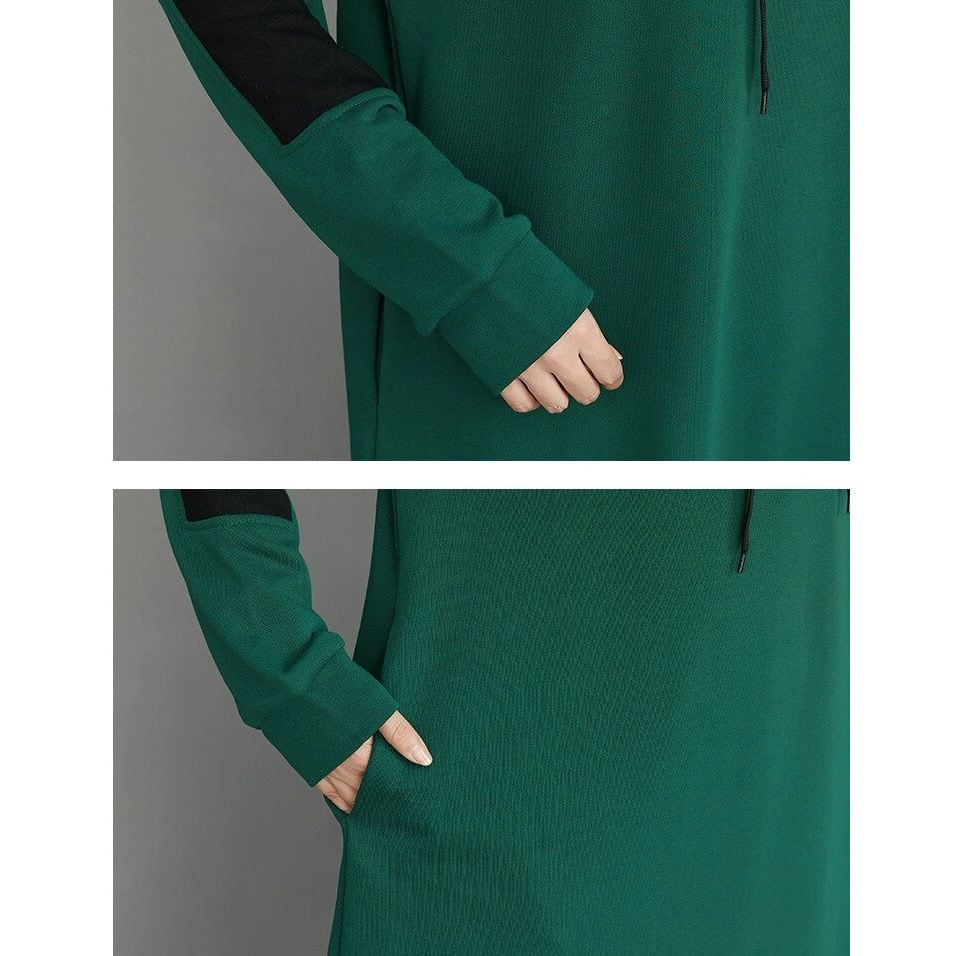 グリーンとブラックのコントラストスティッチがクールな、フード付き・長袖・膝下丈のスウェットワンピースです。タイト目なAラインの裾は、両サイドにスリットが入って動きやすいです。ルームウェアとしても使える、着心地の良いカジュアルアイテムです。