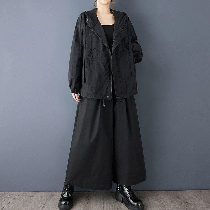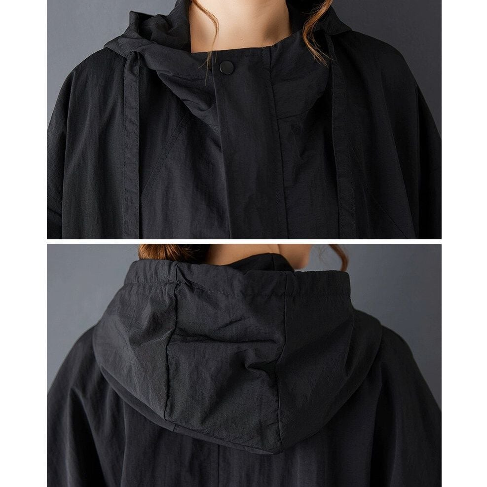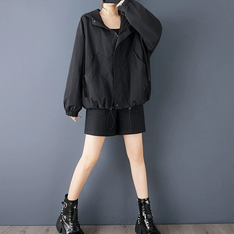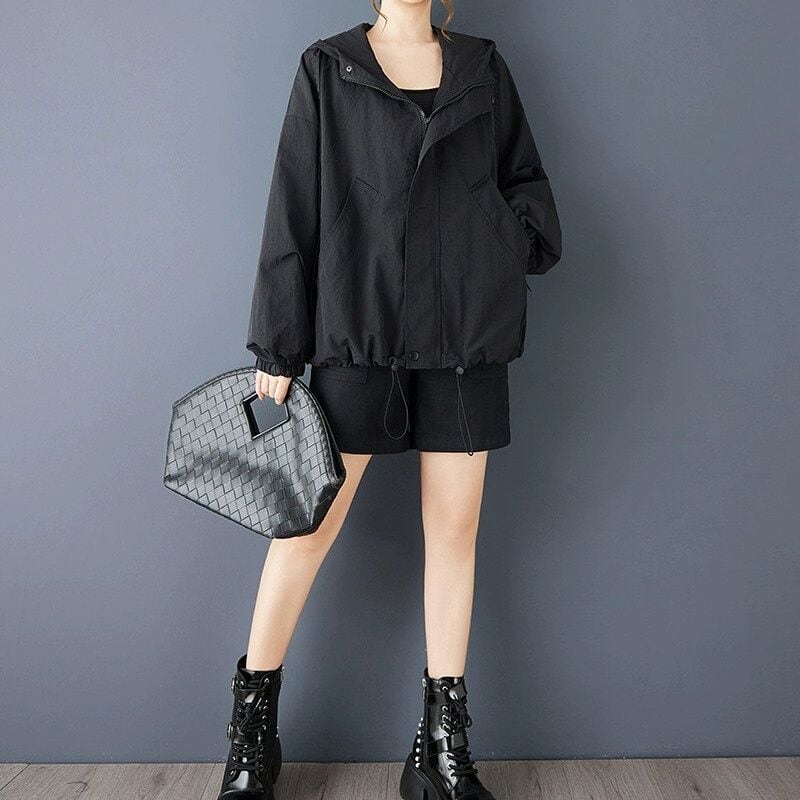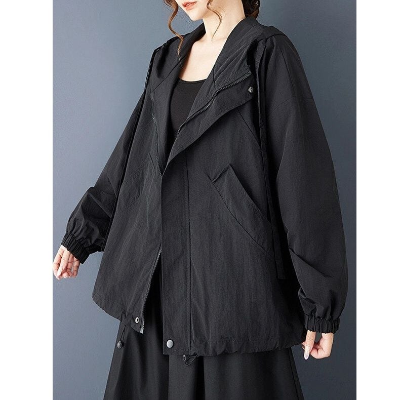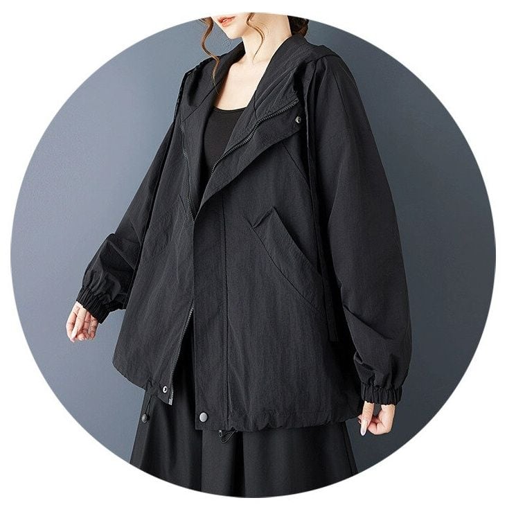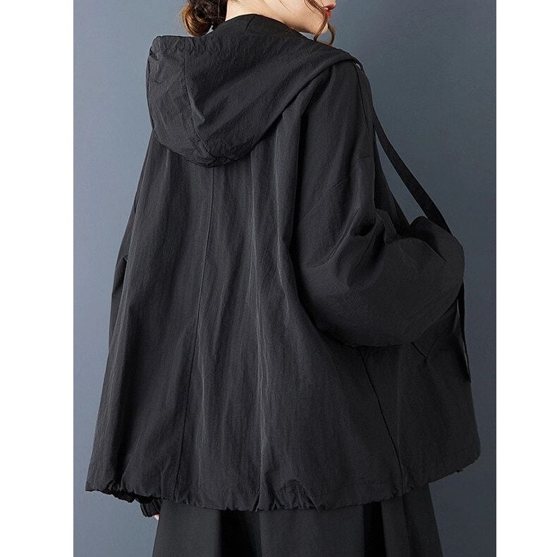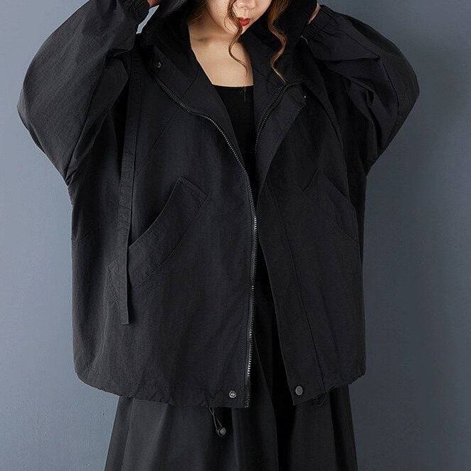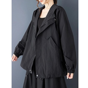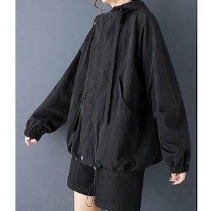 ブラックのフード付き・長袖・ショート丈・ウインドブレーカージャケットです。フルジップのゆったりとしたシルエットの裾は、ドローコードが付いています。大きなスラッシュポケットがキュートな、何にでも合わせやすいカジュアルアイテムです。