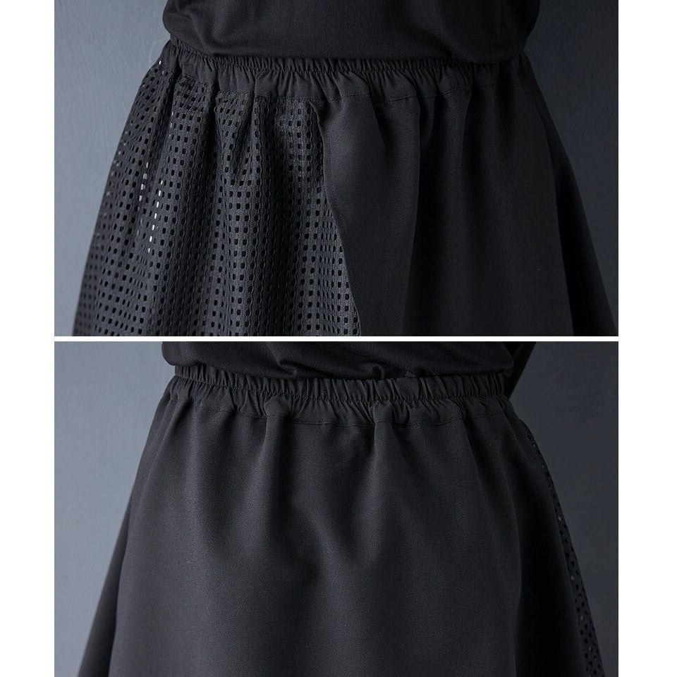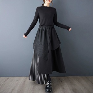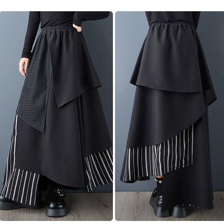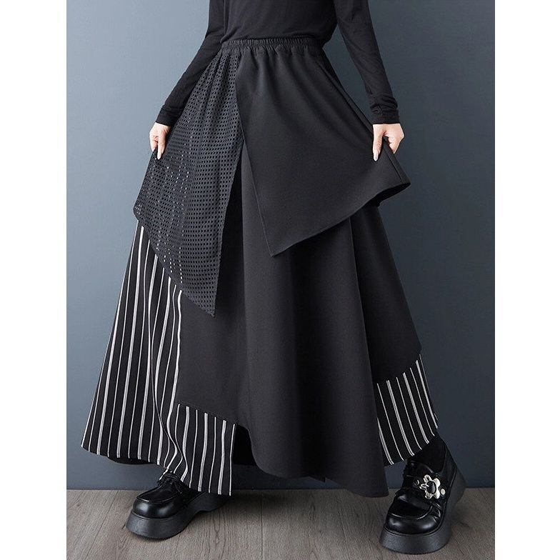 ブラック・メッシュ・ストライプ生地のランダムなレイヤーデザインが目を惹く、Aライン・ロング丈のデザインスカートです。ウエストはゴムなので、着脱が簡単で履き心地が良いです。落ち着いた色味ながらも、コーディネートの主役になるアイテムです。