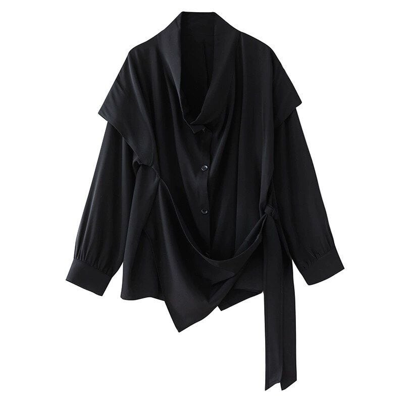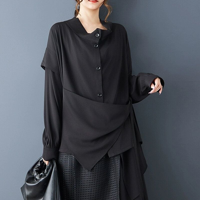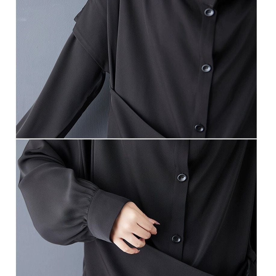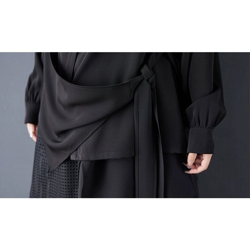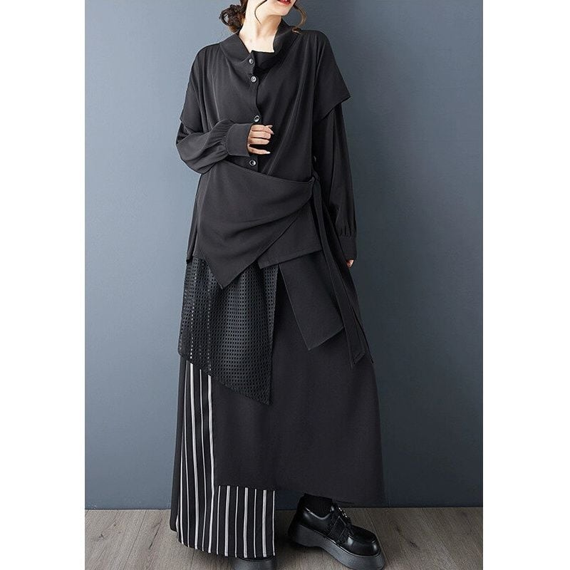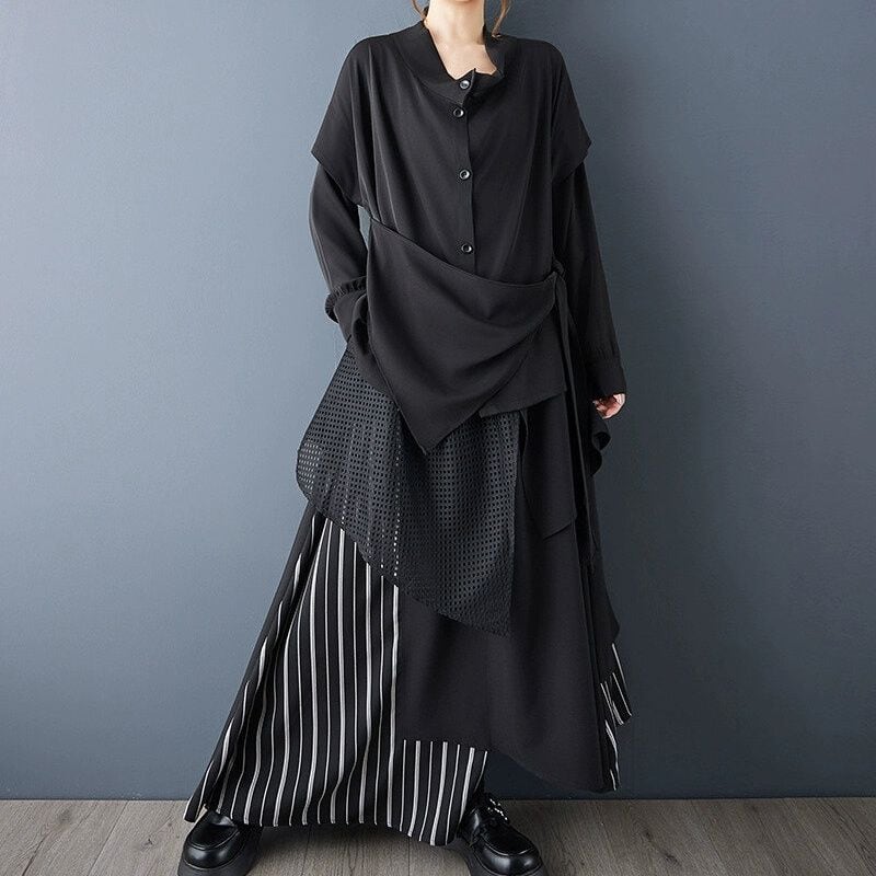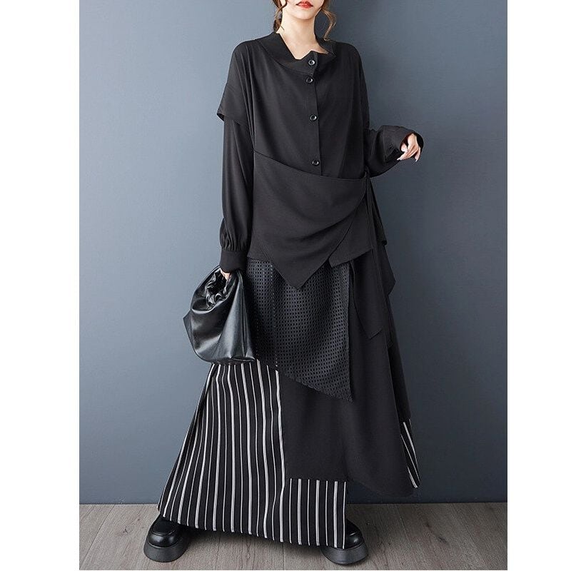 ブラックのフェイクツーピースデザインがお洒落なデザインシャツと、イレギュラーなレイヤーデザインが目を惹くロングスカートです。上下別売りです。シャツは、ルーズなスタンドカラーやウエストのフラップが特徴的なデザインです。上下共に他アイテムとも合わせやすい、クールな印象のアイテムです。