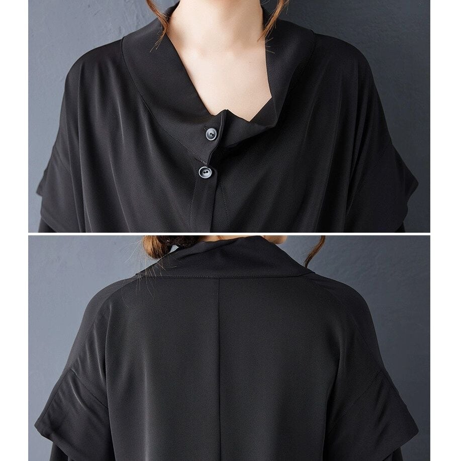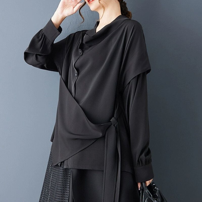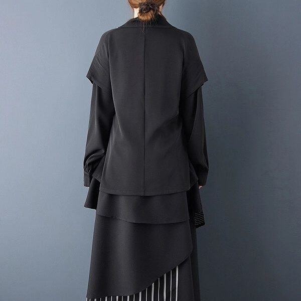 BLACK FAKE-2-PIECE DESIGN SHIRT & LAYERED DESIGN SKIRT 2colors M-15085