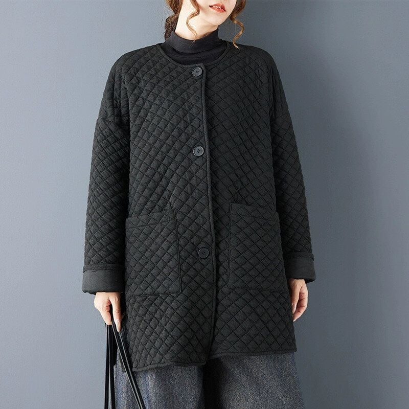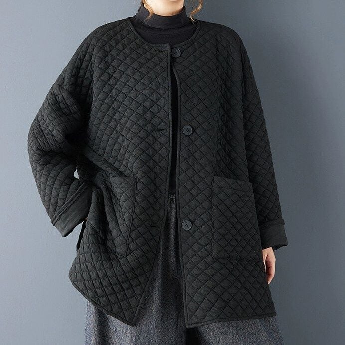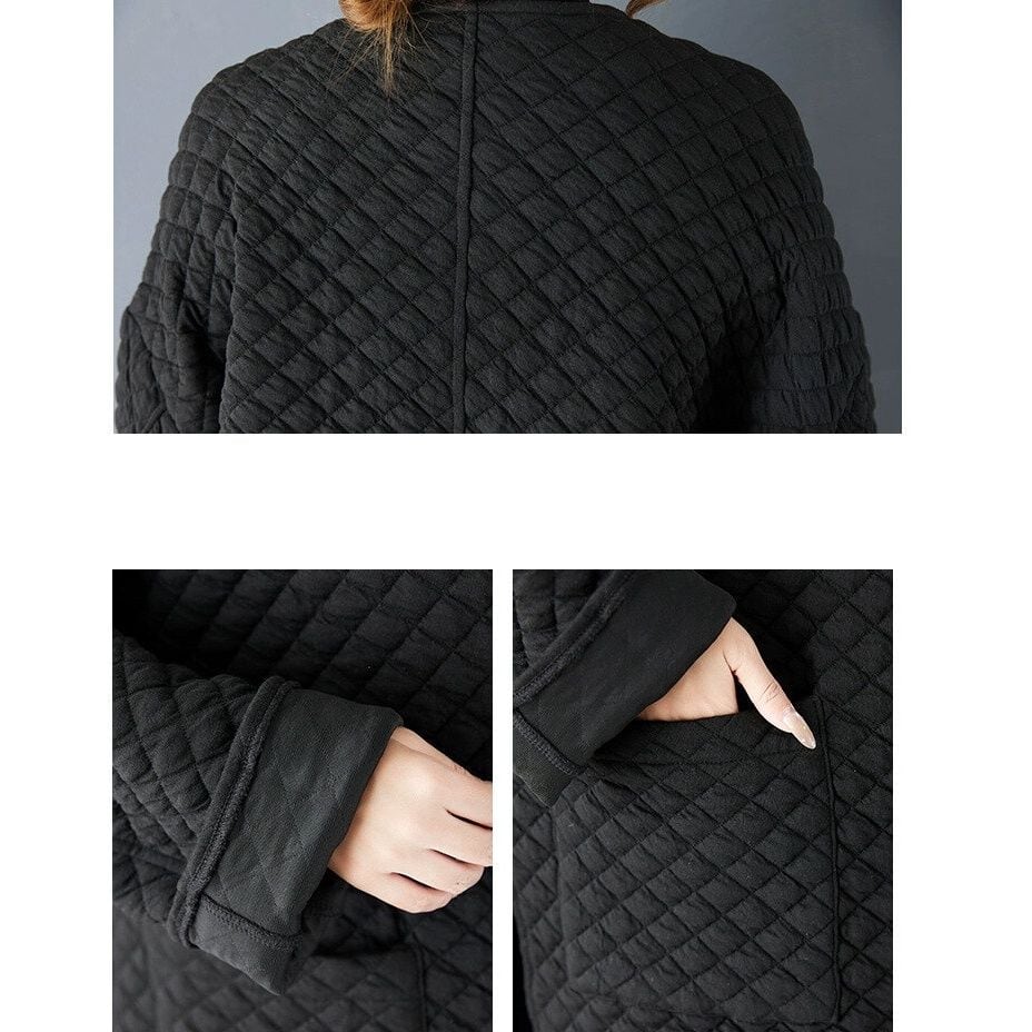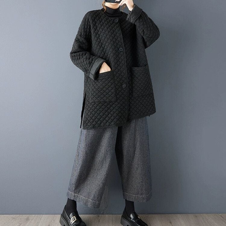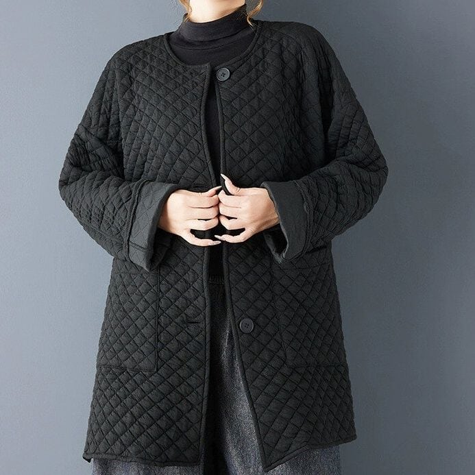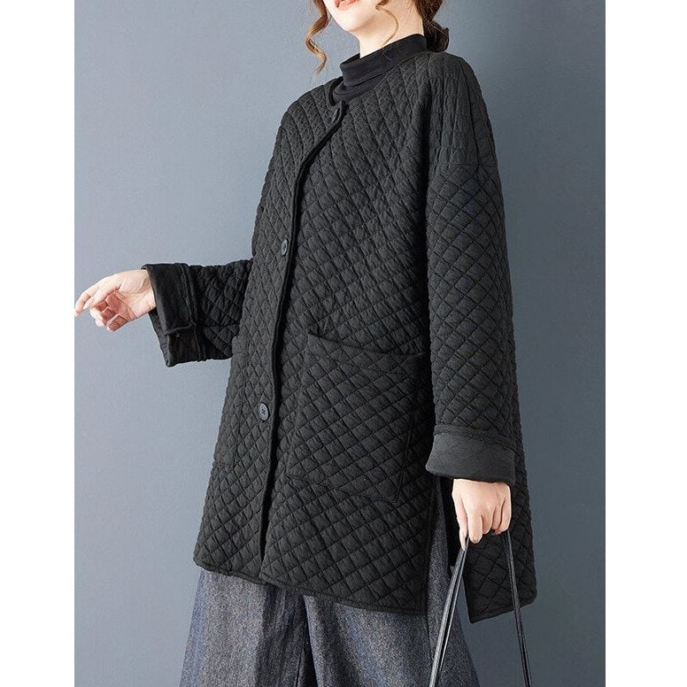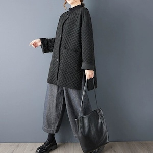 ブラックのキルティング素材でできた、襟なし・長袖・チュニック丈のカジュアルジャケットです。ゆったりとしたAラインシルエットの裾は、サイドにスリットが入っています。シンプルなデザインで合わせやすい、カジュアルなアイテムです。