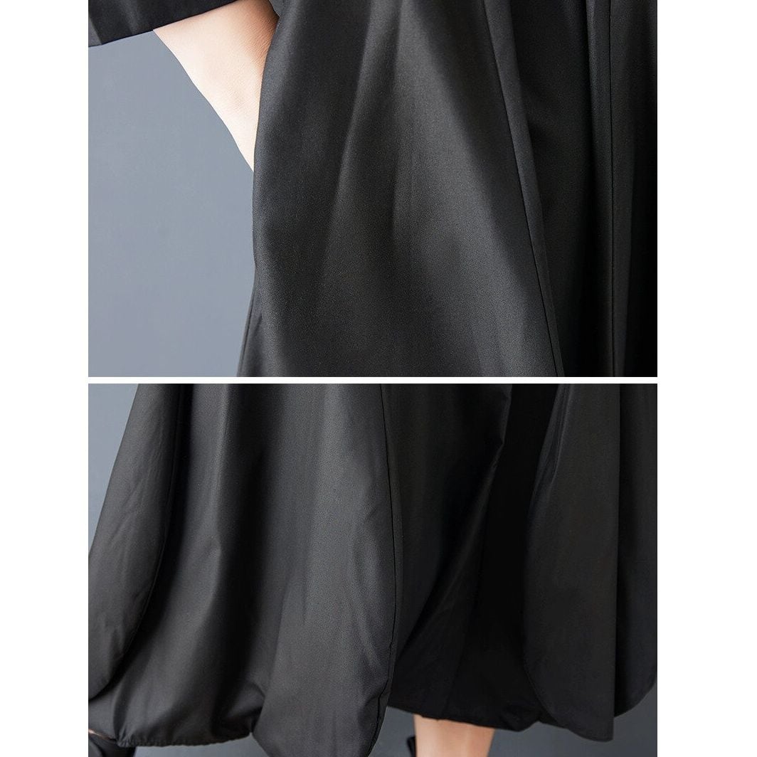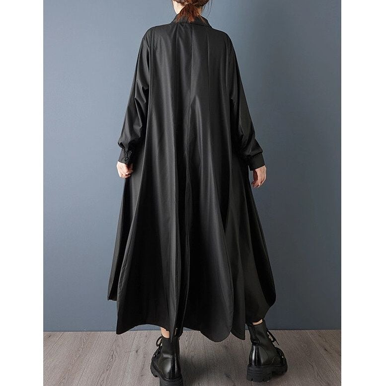 花びらのような裾のデザインが美しい、ブラックのポロ襟・長袖・ロング丈・シャツワンピースです。ゆったりとしたシルエットがエレガントな、アクセサリーなどの小物アレンジが利くアイテムです。