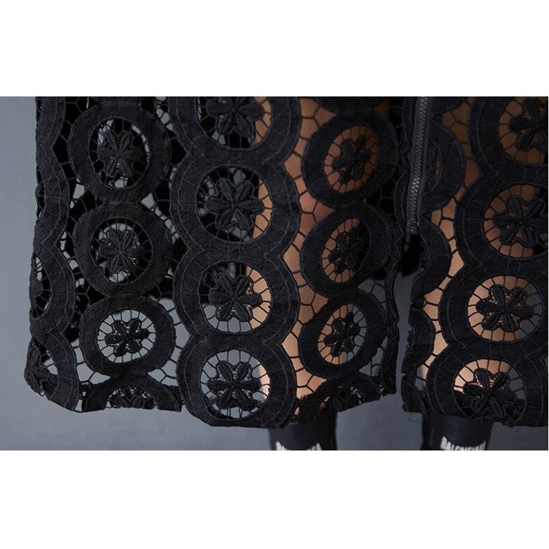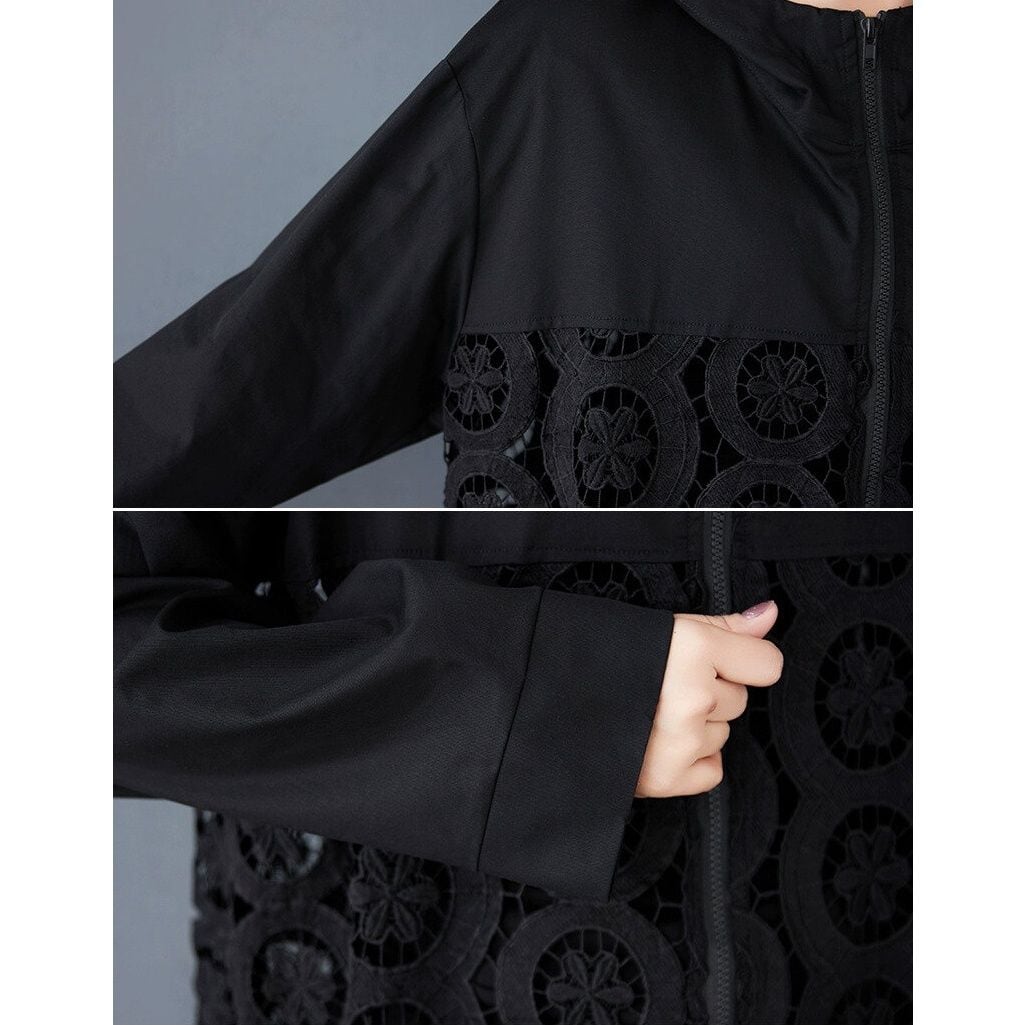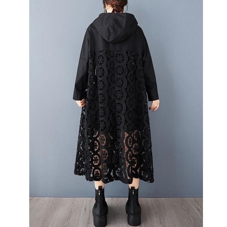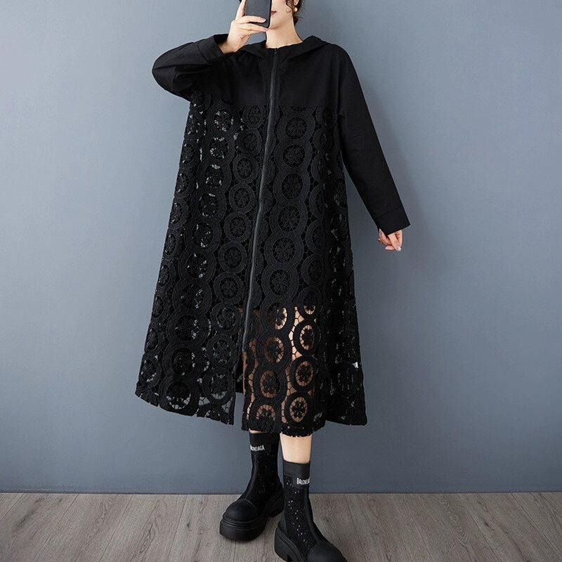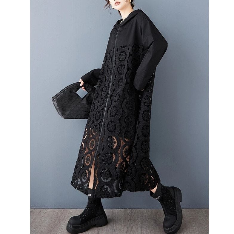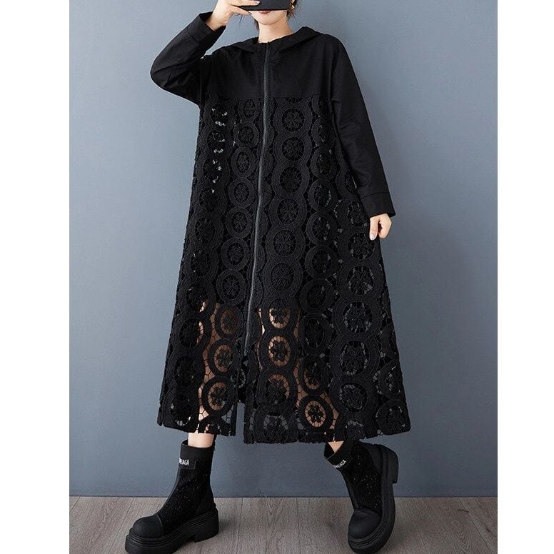 BLACK LACE STITCH HOODED A-LINE MIDI FULLZIP COAT 1color M-15092