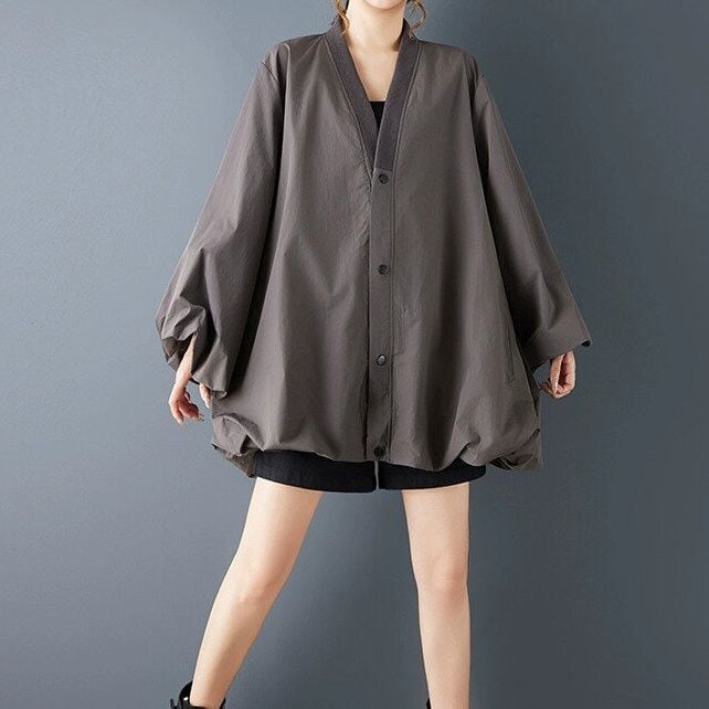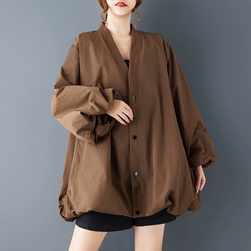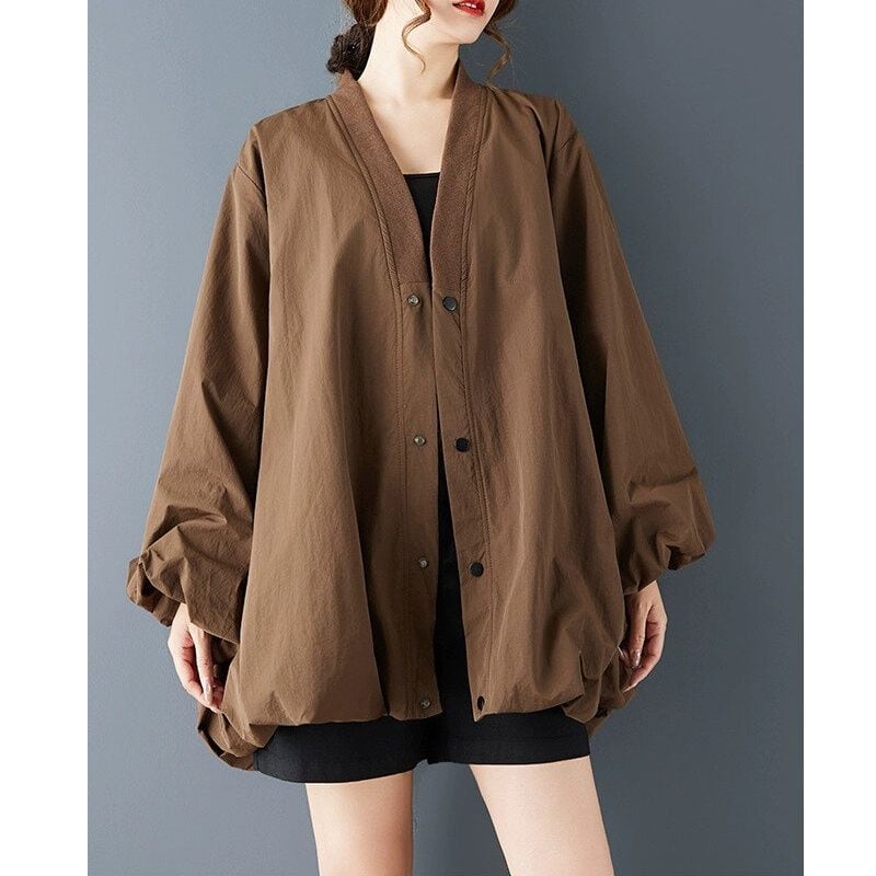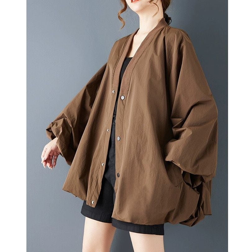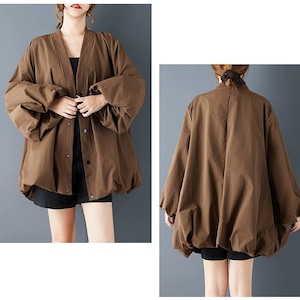 バルーン状になった袖口や裾のシルエットがキュートな、Vネック・長袖・ショート丈のカーディガンジャケットです。ゆったりとしたシルエットとスナップボタンで使いやすい、コーディネートのアクセントになる目を惹くアイテムです。コーヒーとグレーの2色から選べます。
