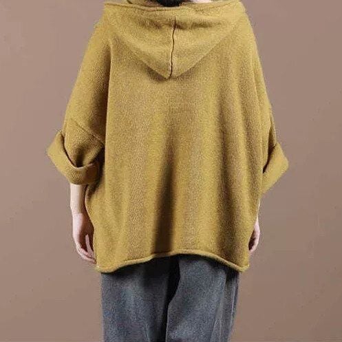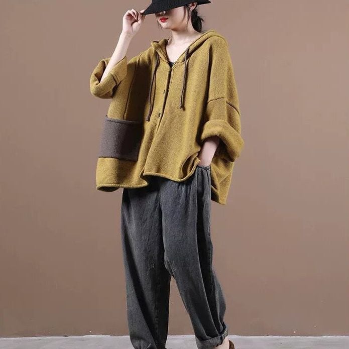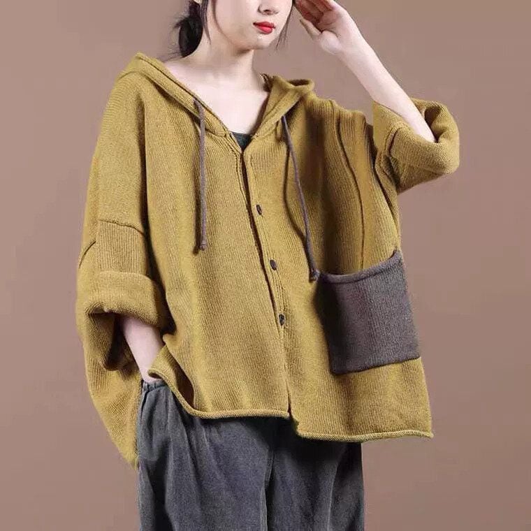 コントラストデザインがキュートな、フード付き・長袖・ニットカーディガンです。オーバーサイズシルエットの裾は、サイドにスリットが入っています。コーディネートのアクセントになる、お洒落なカジュアルアイテムです。色はグレーとイエローの2色から選べます。