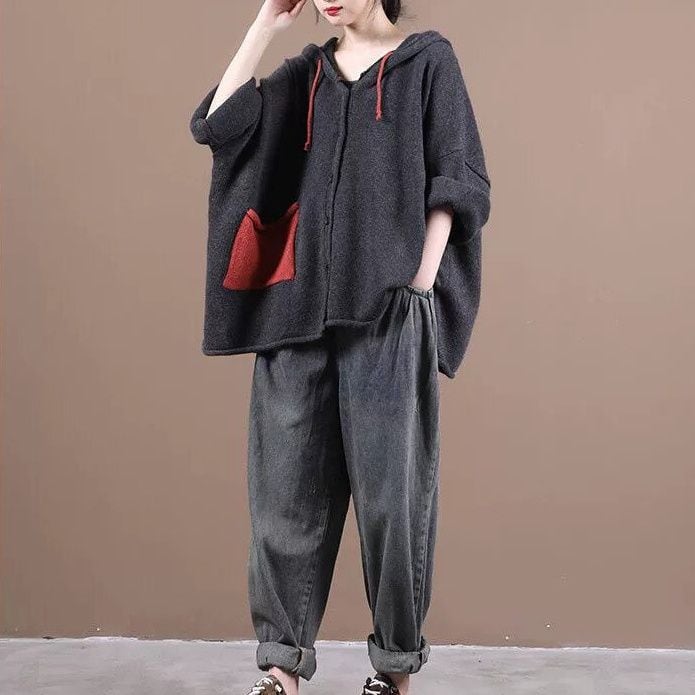 CONTRAST STITCH POCKET HOODED OVERSIZED KNIT CARDIGAN 2colors M-15102