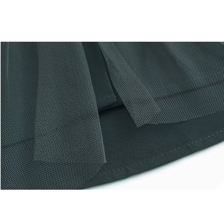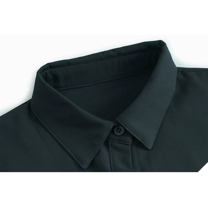 フロントの裾に弧を描くように施されたメッシュのフリルがキュートな、ポロ襟・長袖のデザインシャツです。落ち着いた色味の単色でコーディネートしやすい、ガーリーな印象のアイテムです。色は3色から選べます。