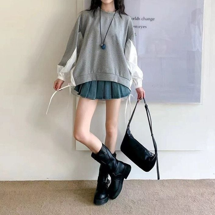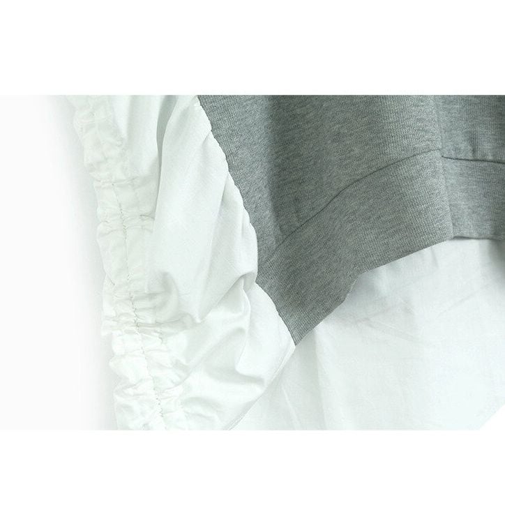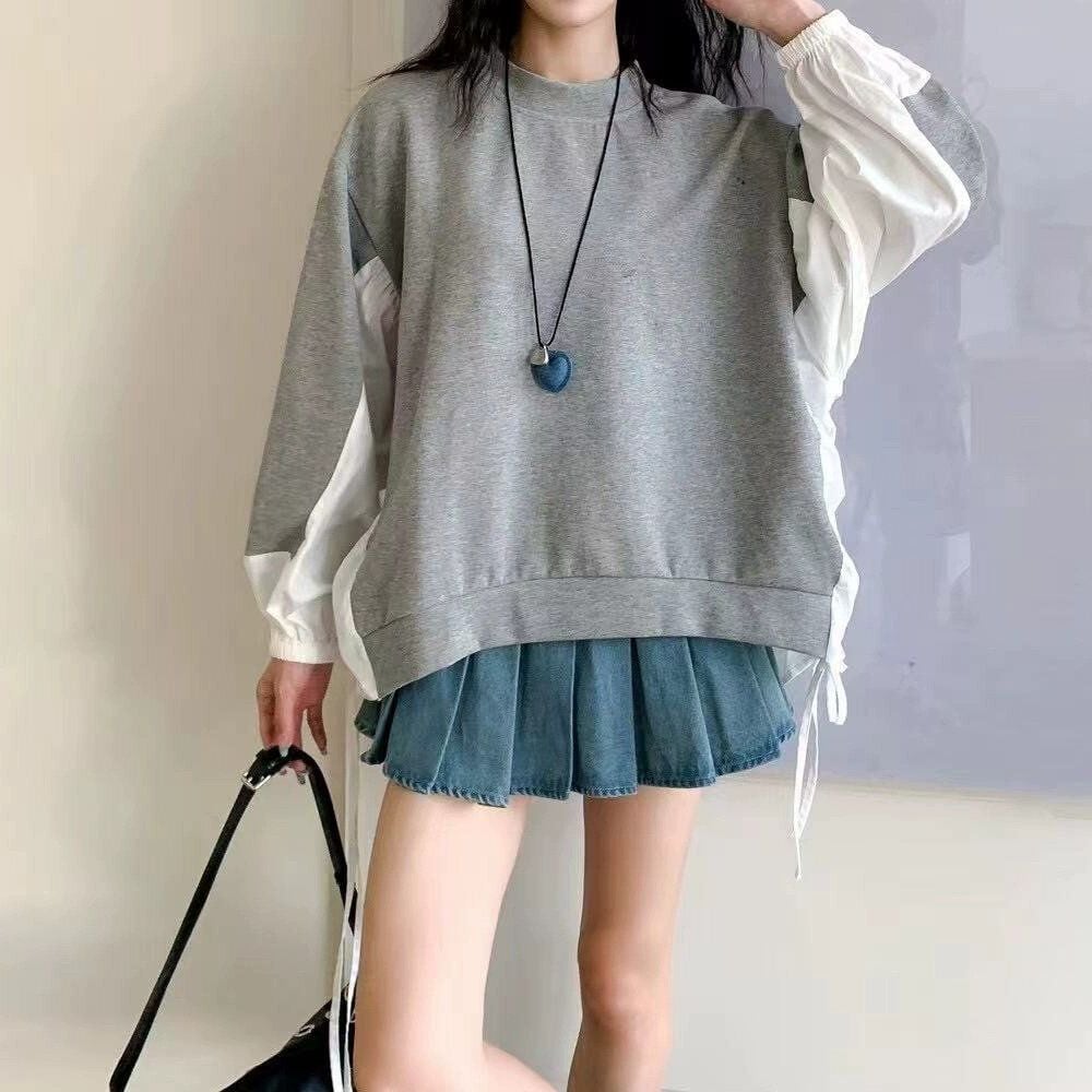 スウェットとシャツ生地を組み合わせたスティッチデザインがキュートな、モックネック・長袖ハイローヘムのプルオーバー・デザイントップです。サイドの縦のドローストリングでラインを調節できます。ゆったりとしたシルエットが魅力的な、ガーリーな印象のアイテムです。色は2色から選べます。