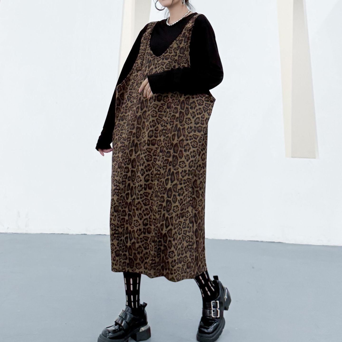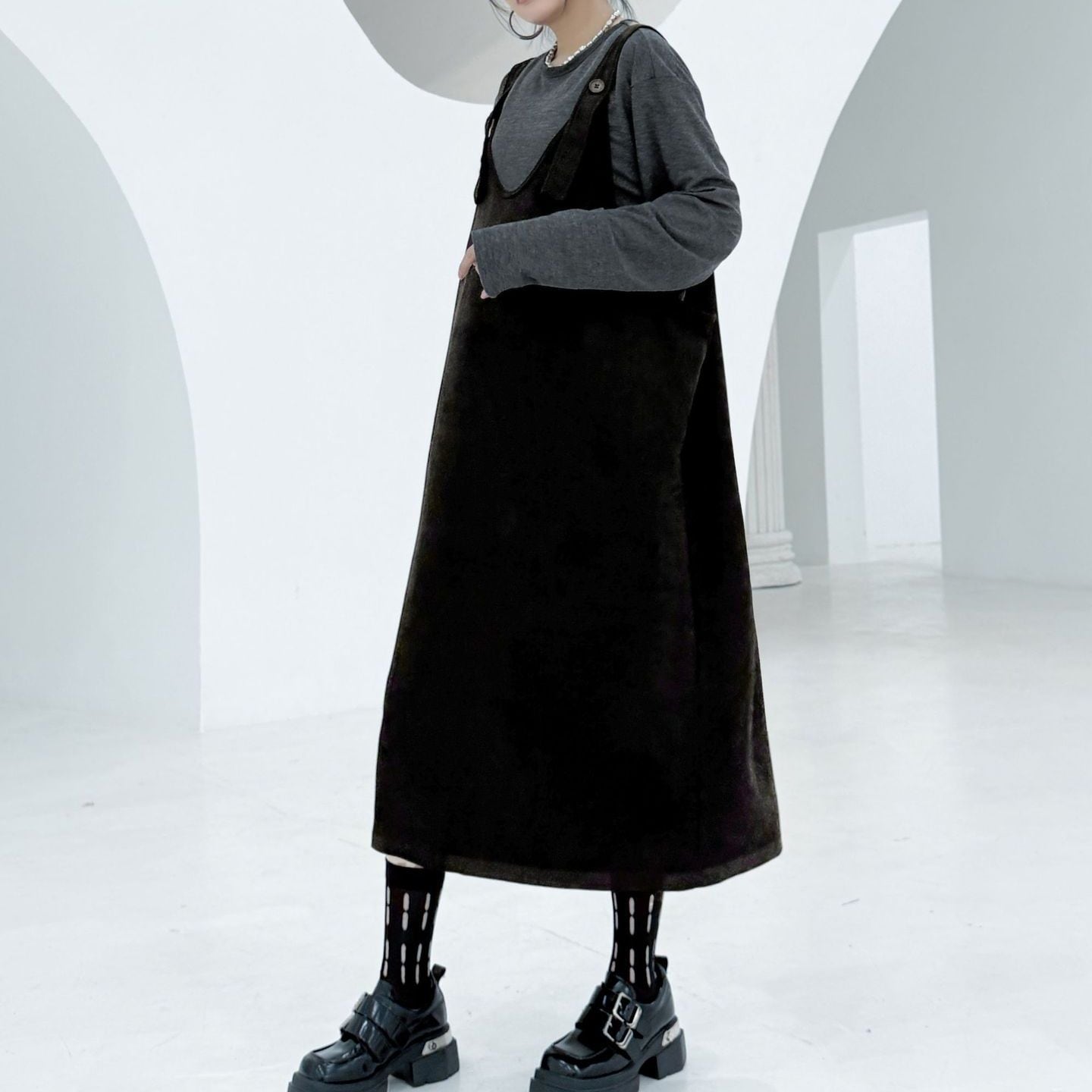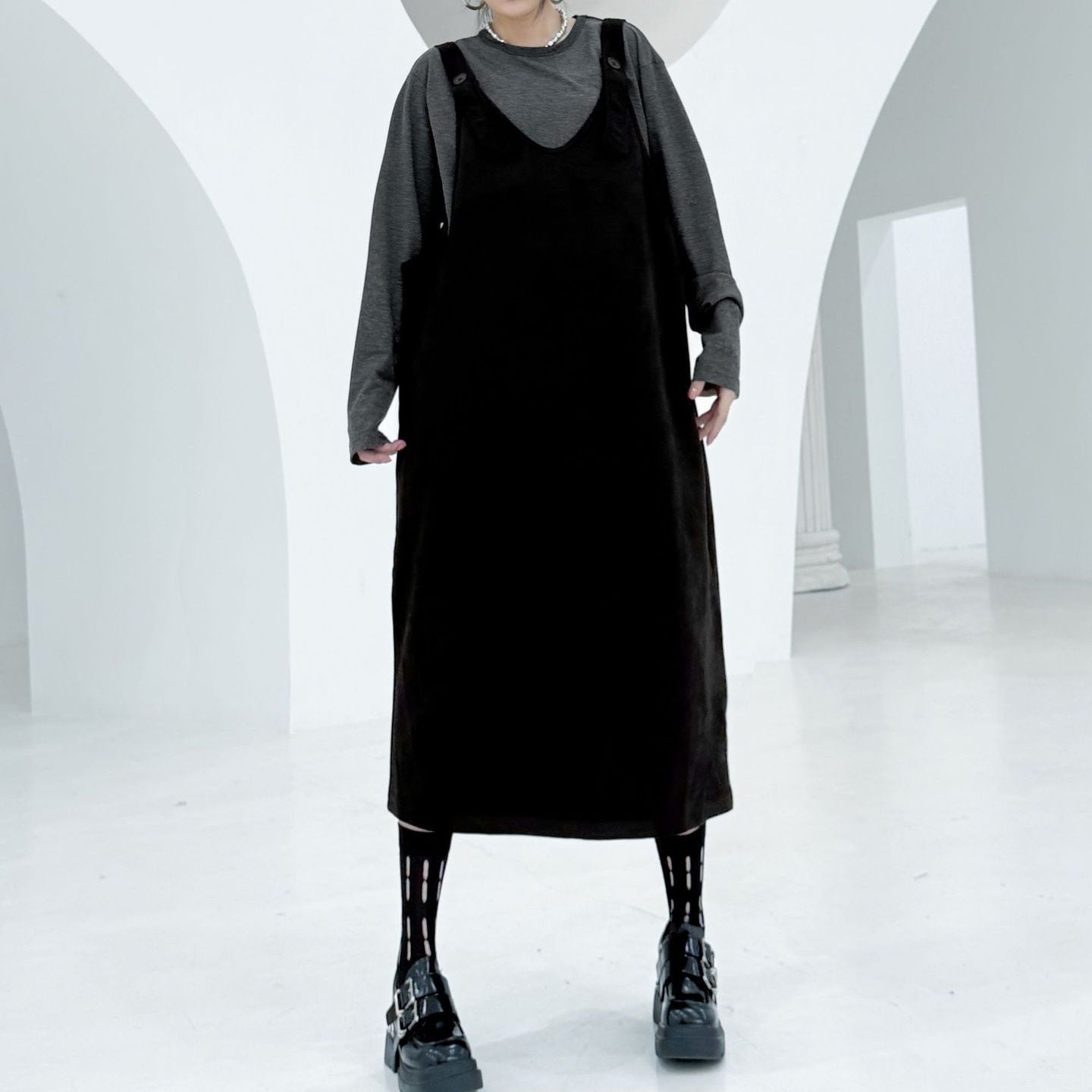 ブラックのVネック・ミドル丈のストラップジャンパースカートと、インナー用のラウンドネック・ロングスリーブ・Tシャツです。スカートは、ショルダーストラップがボタンで調節可能で、ゆったりとしたワイド幅のストレートラインです。Tシャツはグレーとブラックの2色から選べます。