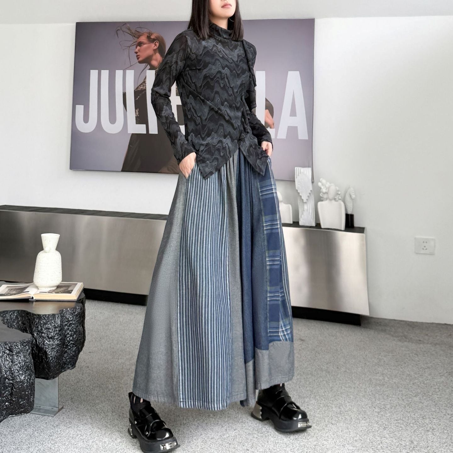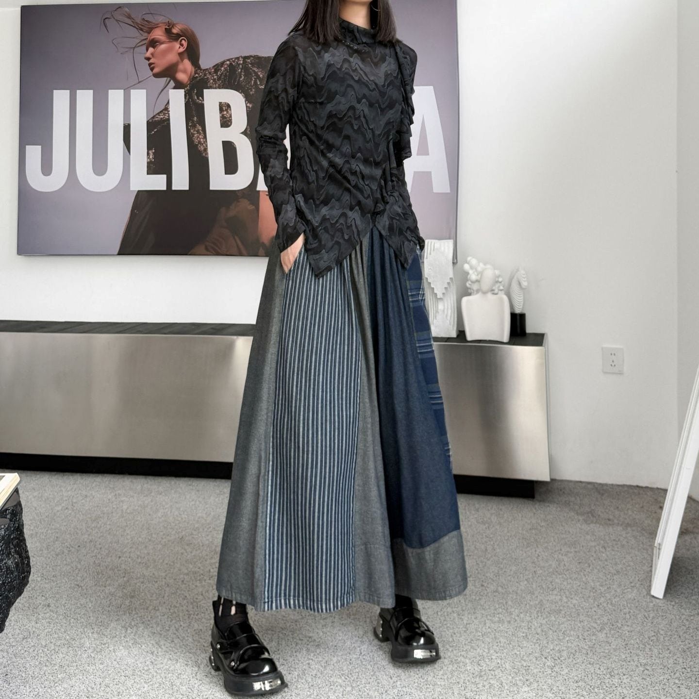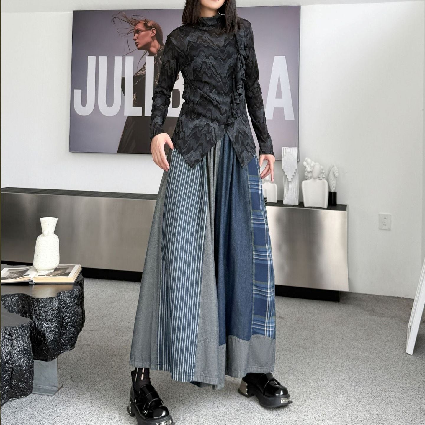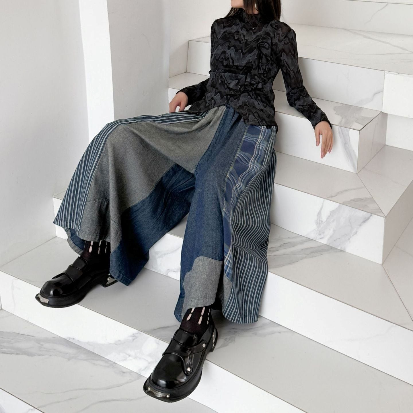 PATCHWORK A-LINE WIDE LEG DENIM PANTS 1color M-15119
