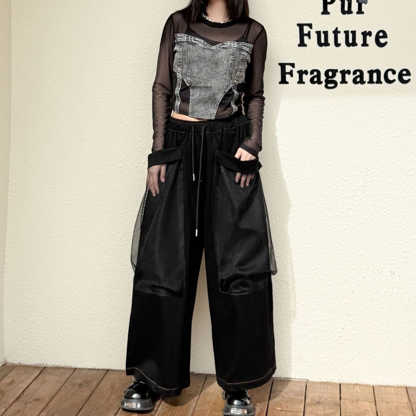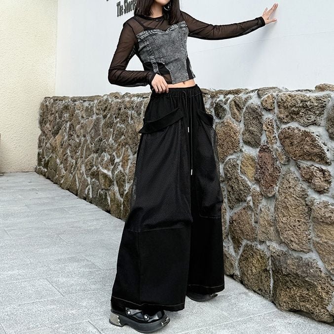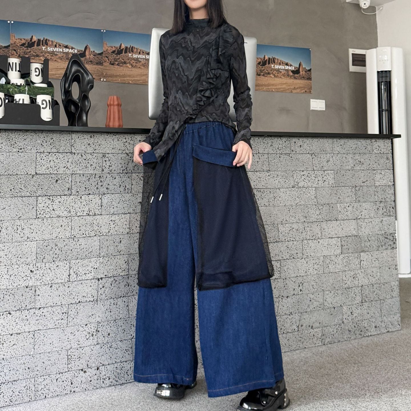 メッシュ素材でできた大きなデザインポケットが目を惹く、ワイドレッグ・デニムパンツです。ウエストはゴム+ドローストリングで、履き心地が良いです。Aラインのシルエットが魅力的な、コーディネートのアクセントになるアイテムです。色はブルーとブラックの2色から選べます