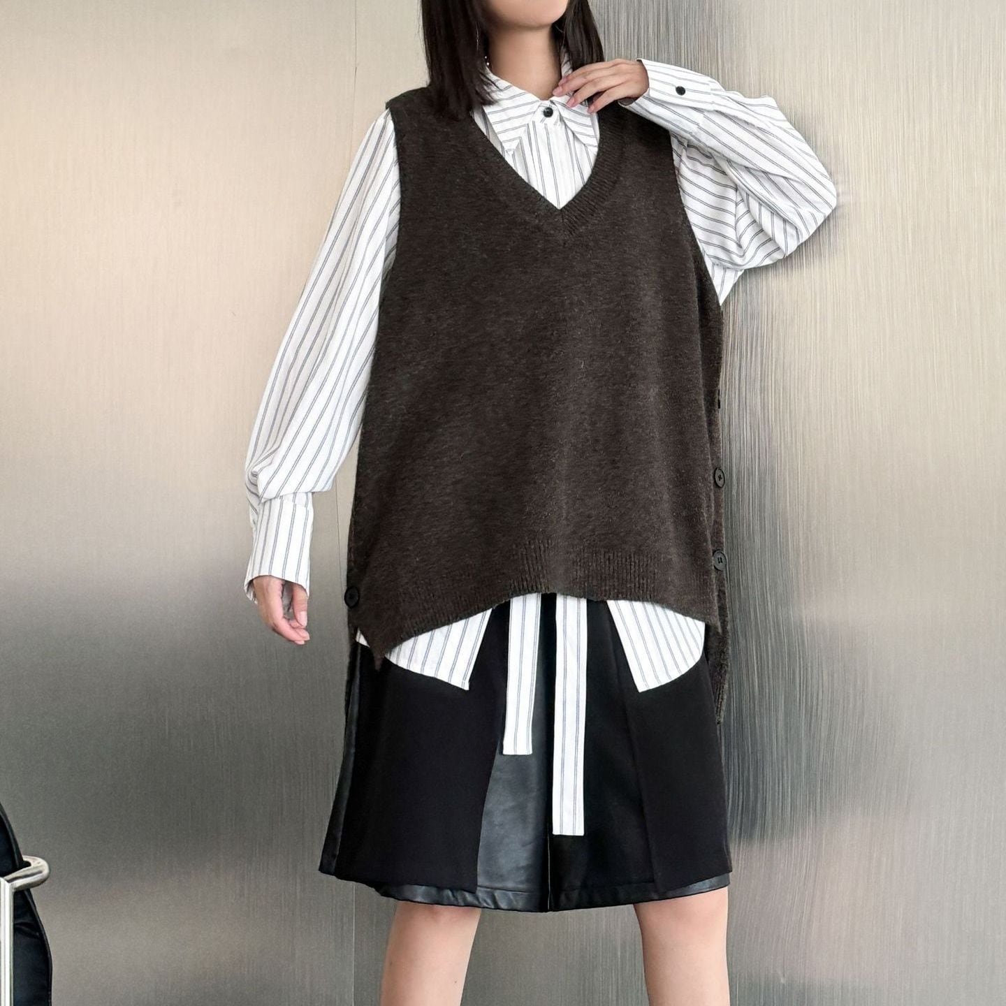サイドのボタンやバックのスリットデザインがお洒落な、Vネック・ハイローヘムのプルオーバー・ニットベストです。落ち着いた色味の単色で、コーディネートしやすいカジュアルアイテムです。色はブラックとブラウンの2色から選べます。