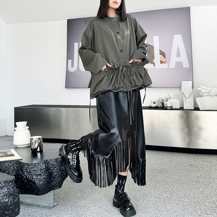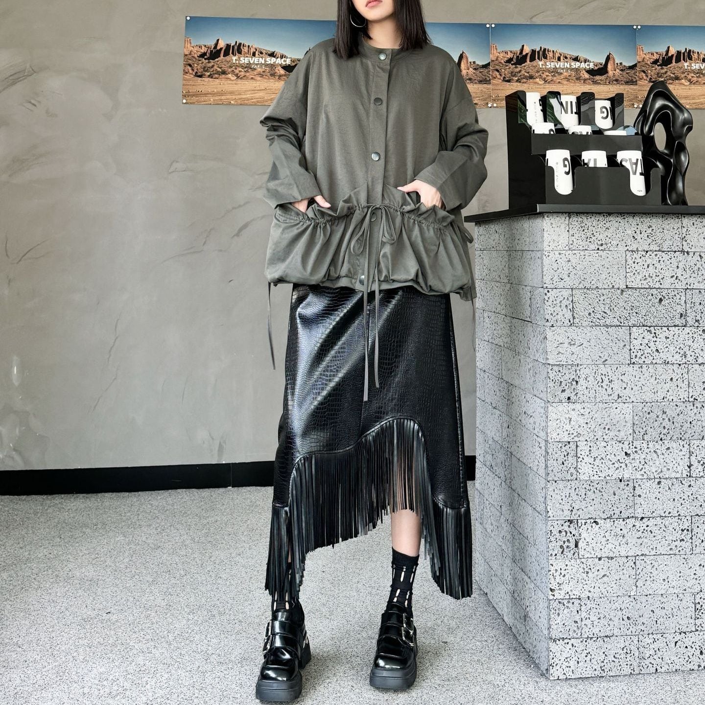 SOLID OFF STAND COLLAR DRAWSTRING POCKET DESIGN SHIRT 2colors M-15127