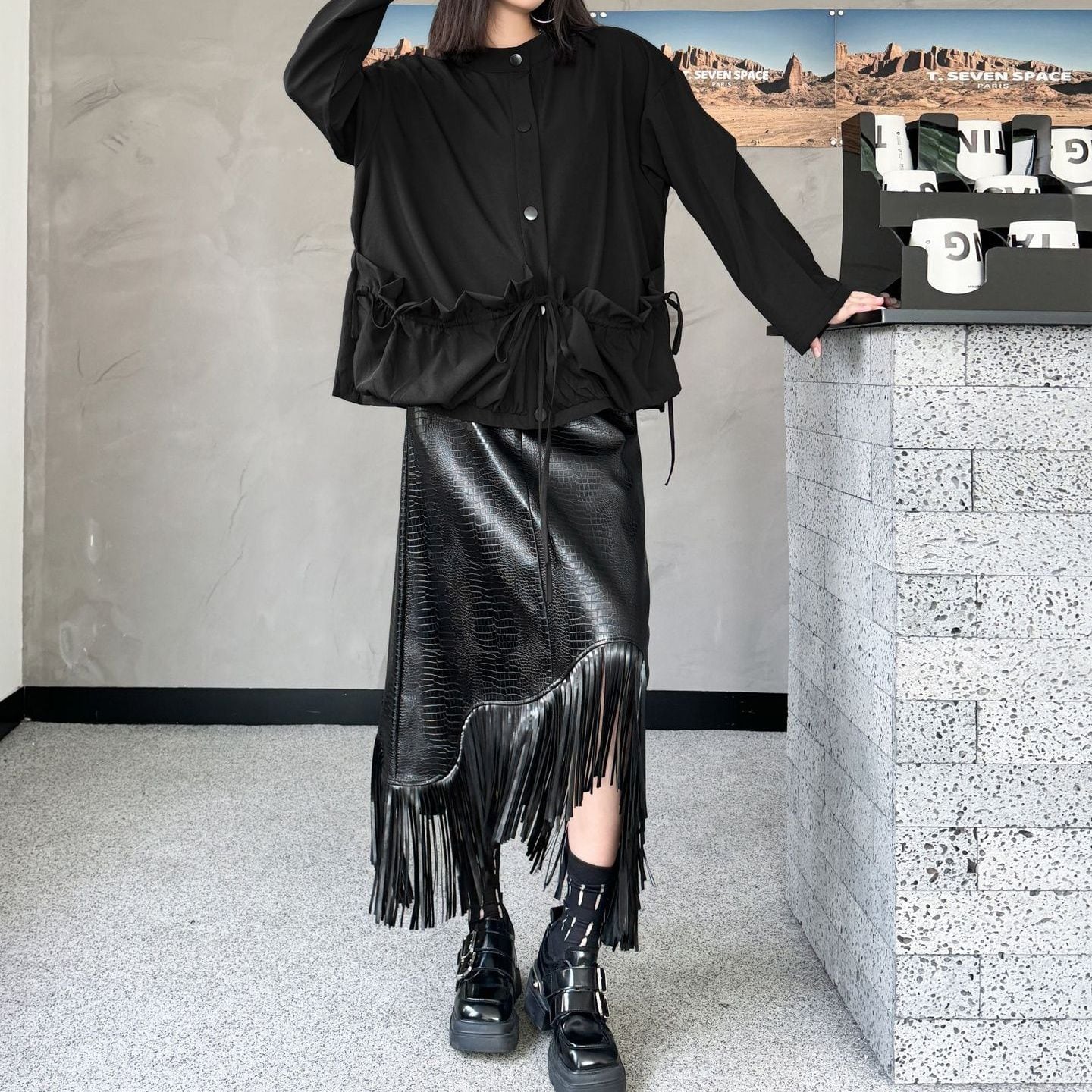 ドローストリングの付いた巾着のような大きなポケットが特徴的な、オフスタンドカラー・長袖・ストレートカットのデザインシャツです。ゆったりとしたオーバーサイズシルエットで、シャツジャケットとしても活躍するアイテムです。ブラックとグレーの2色から選べます。