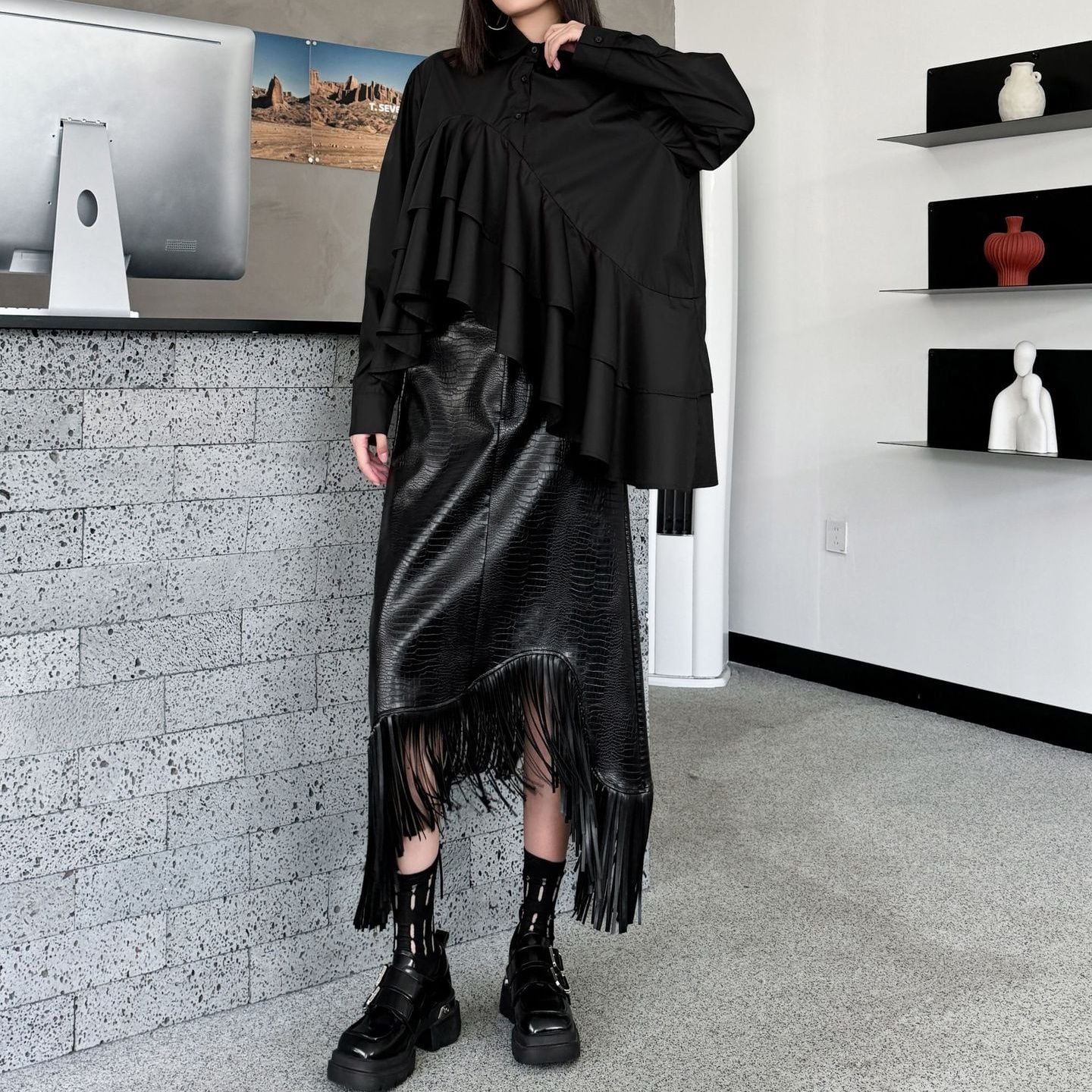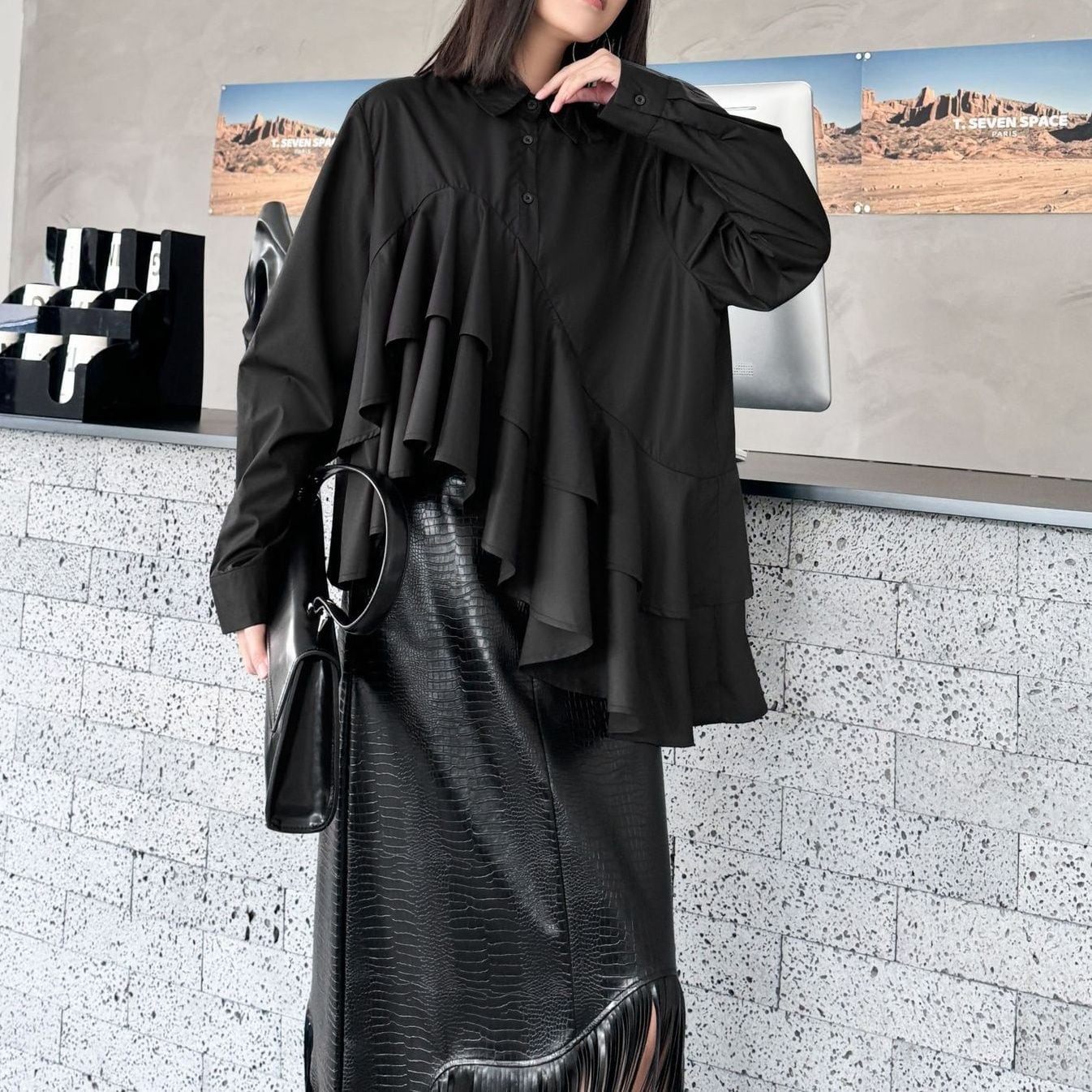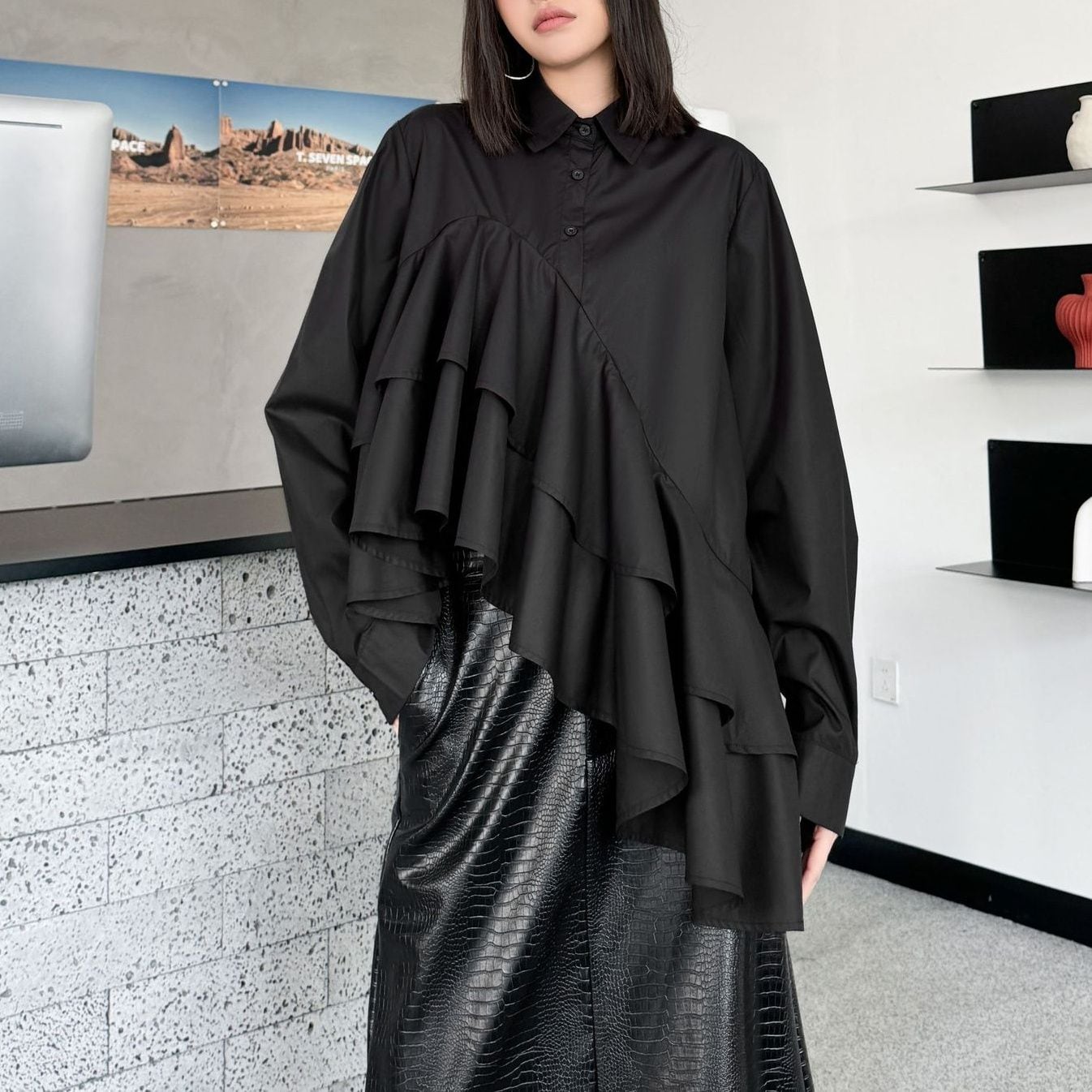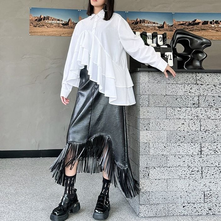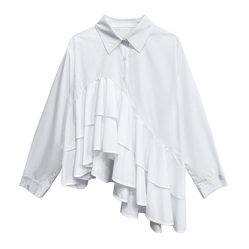 SOLID IRREGULAR FRILLED HEM LONG SLEEVES SHIRT BLOUSE 2colors M-15131