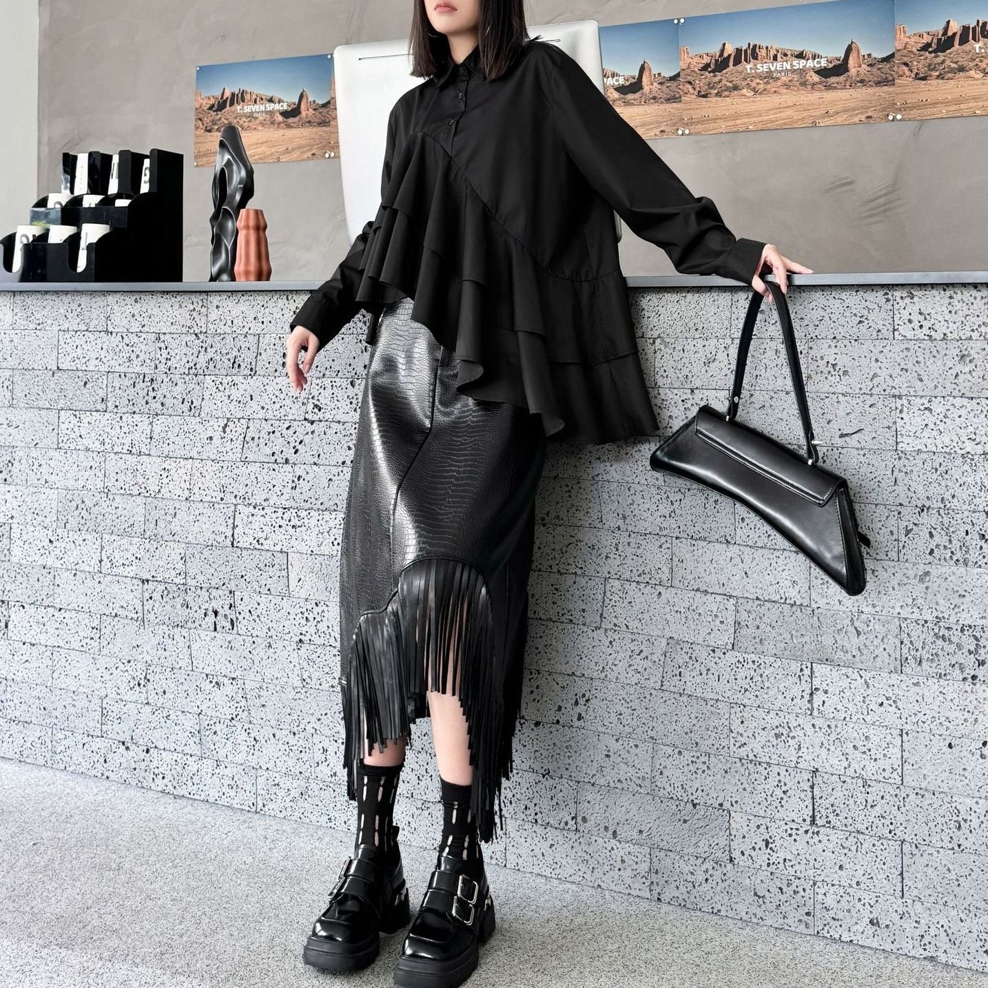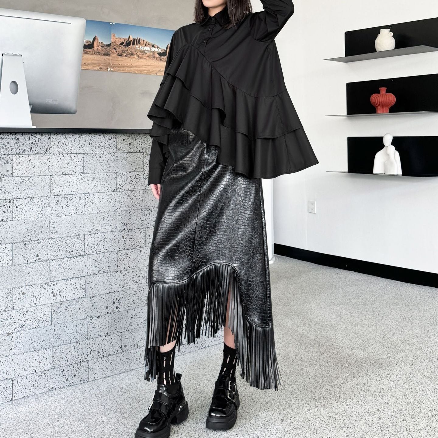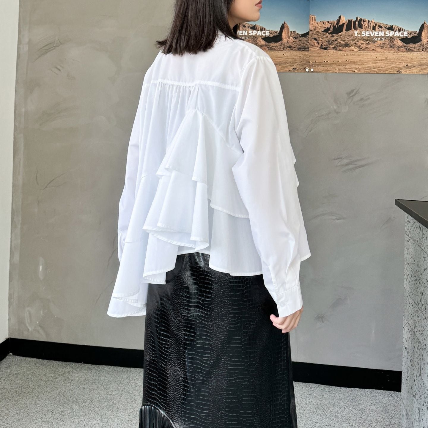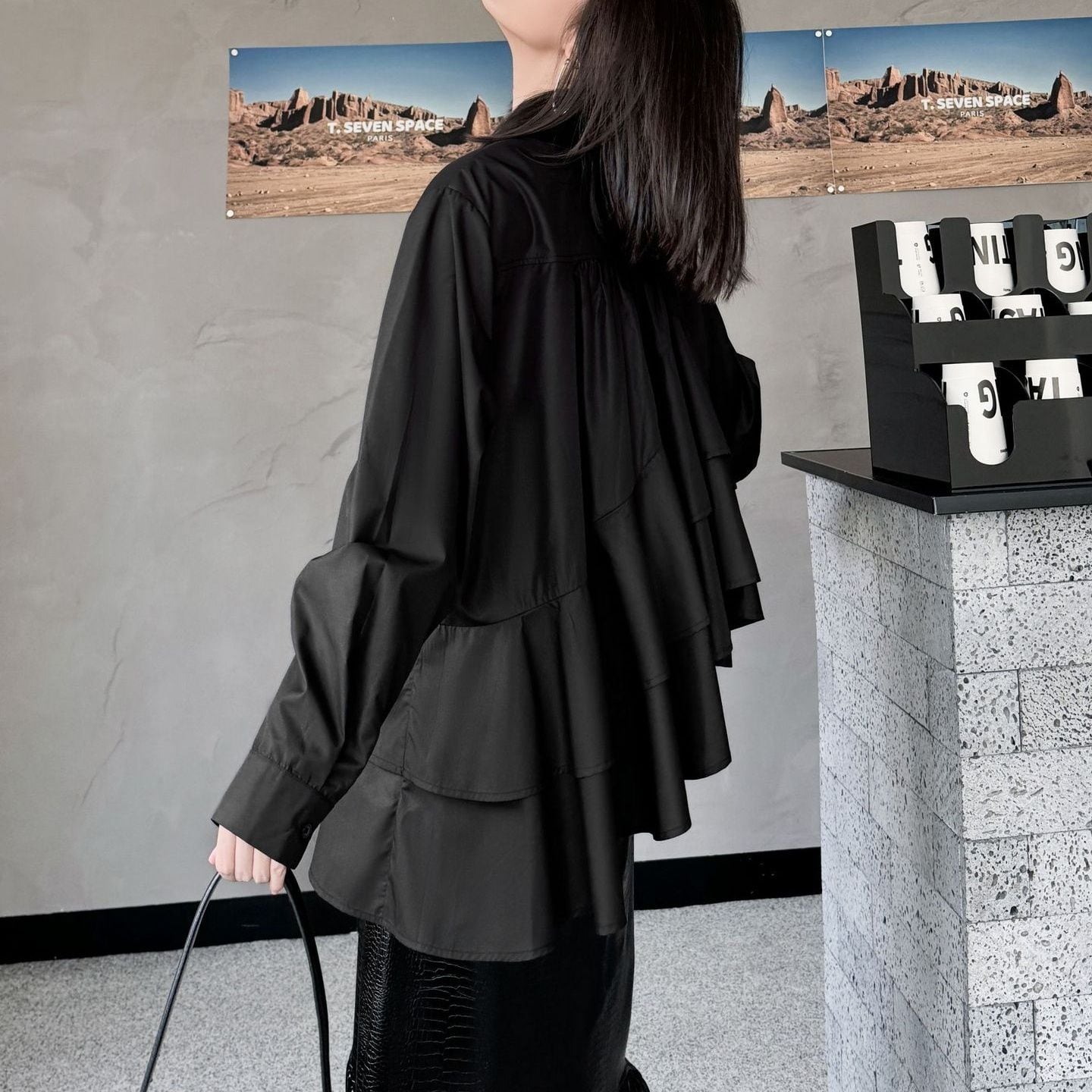 SOLID IRREGULAR FRILLED HEM LONG SLEEVES SHIRT BLOUSE 2colors M-15131