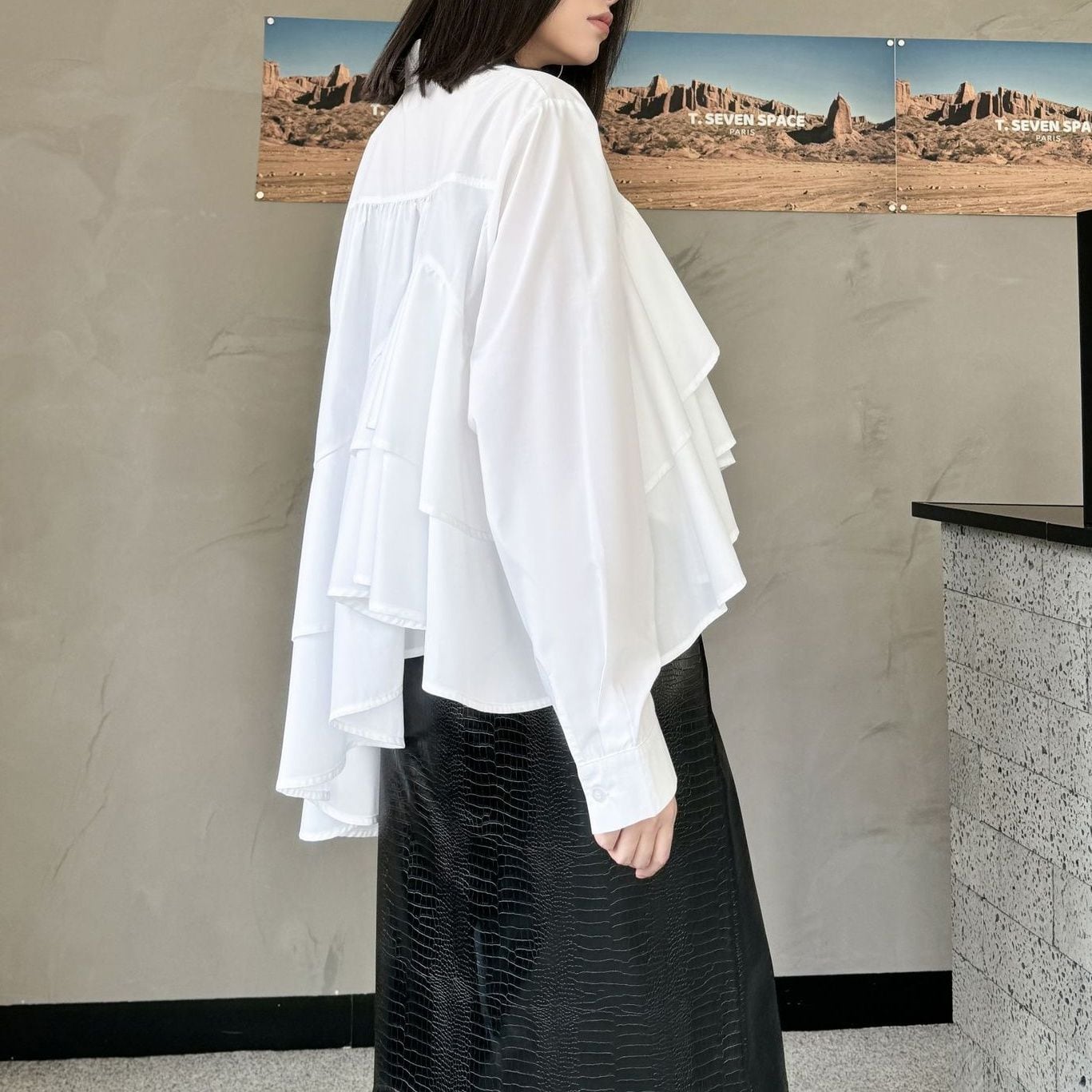 2段の大きなフリルがあしらわれた裾が豪華な、ポロ襟・長袖・ハーフボタン・イレギュラーヘムのシャツブラウスです。単色の滑らかな素材に、ふわりとしたシルエットが魅力的なアイテムです。色はブラックとホワイトの2色から選べます。