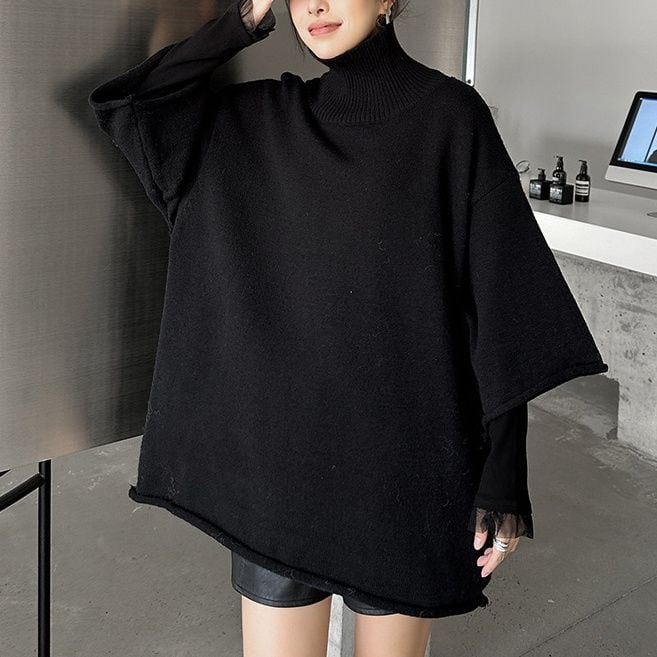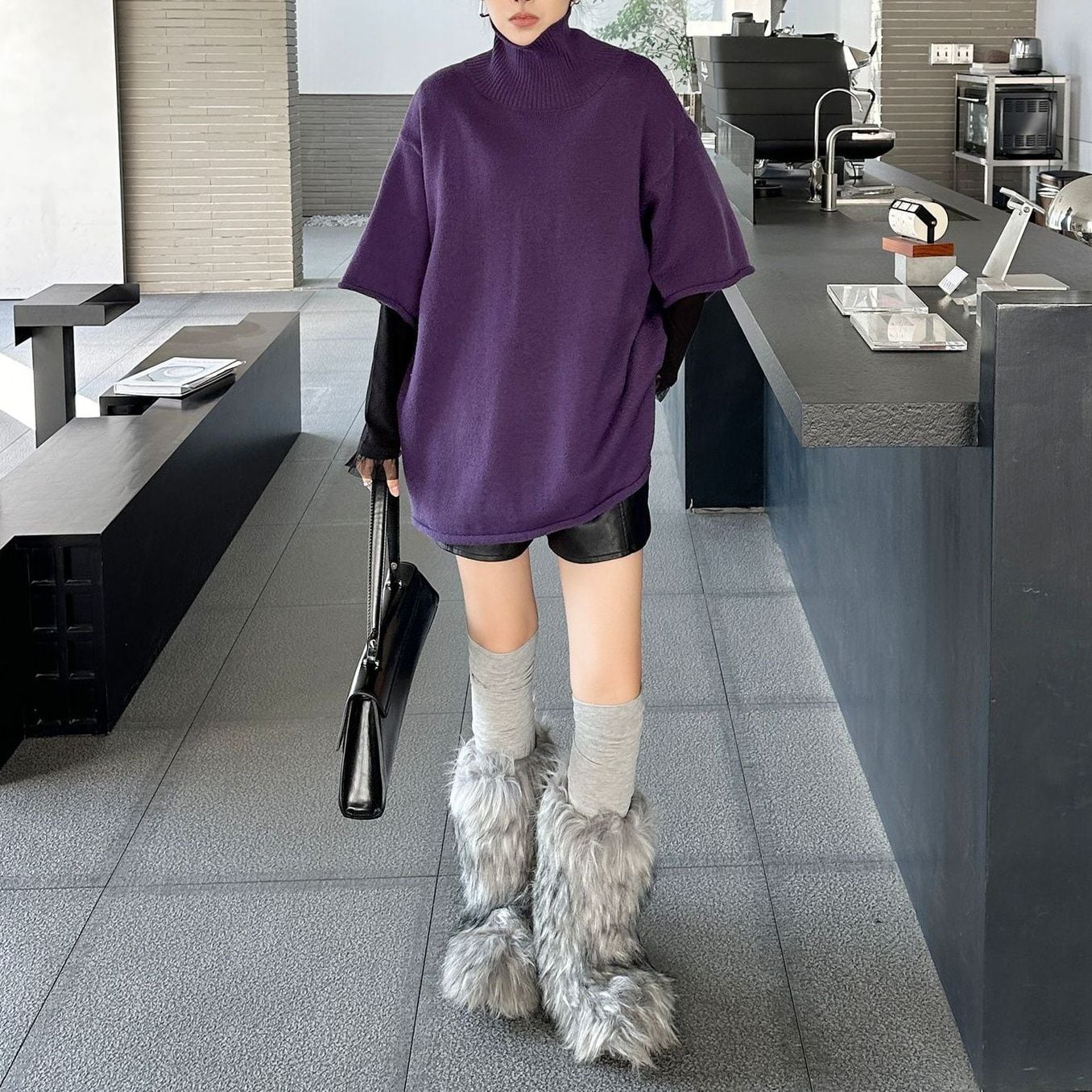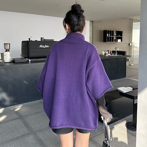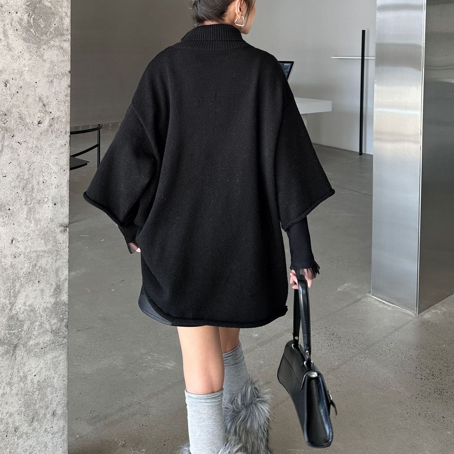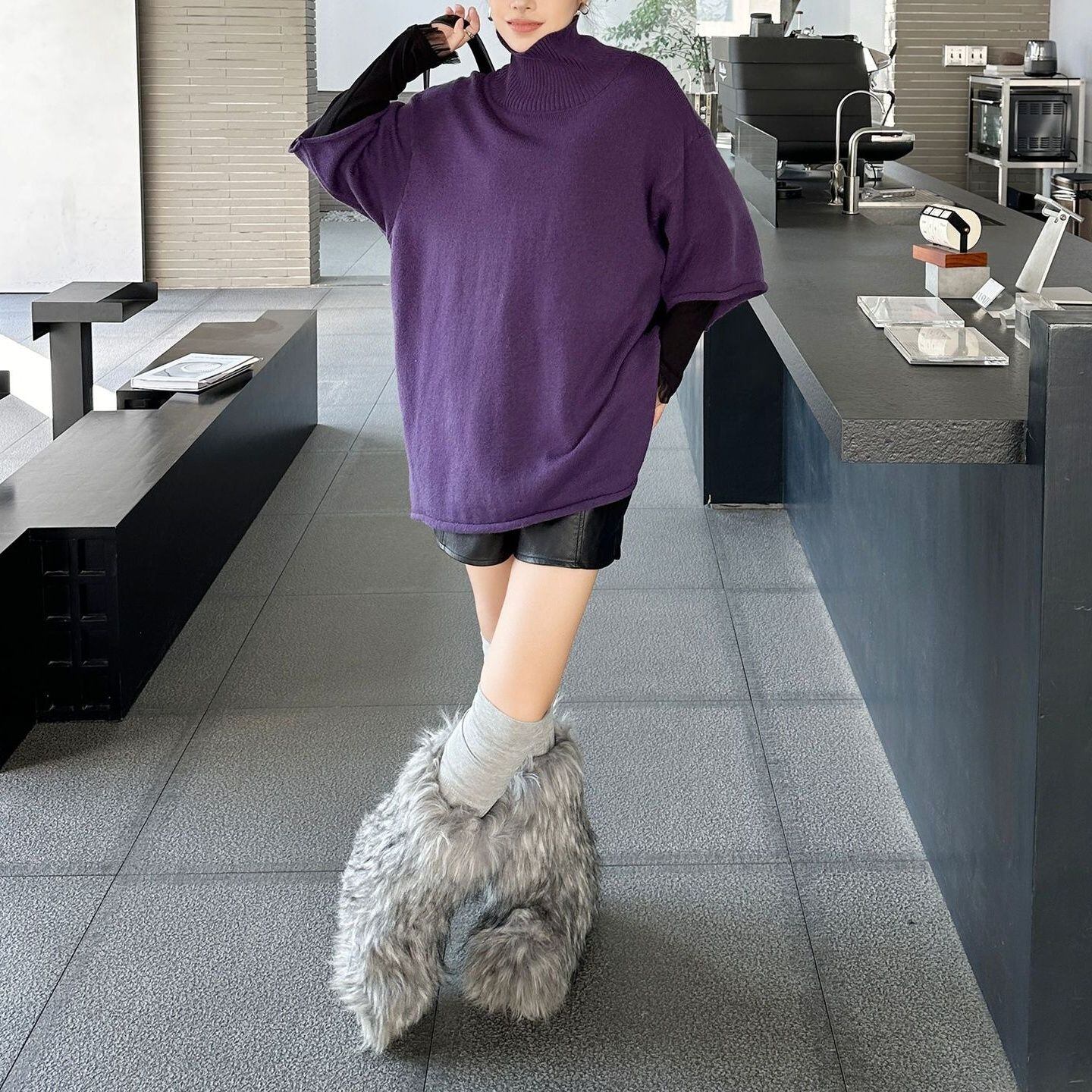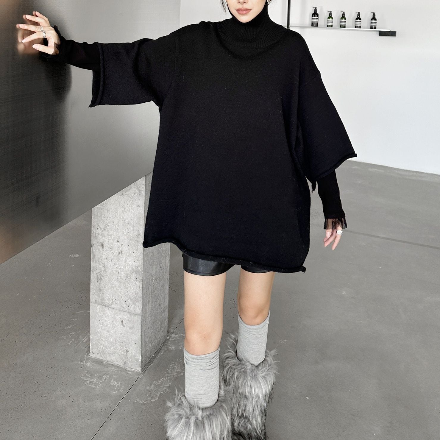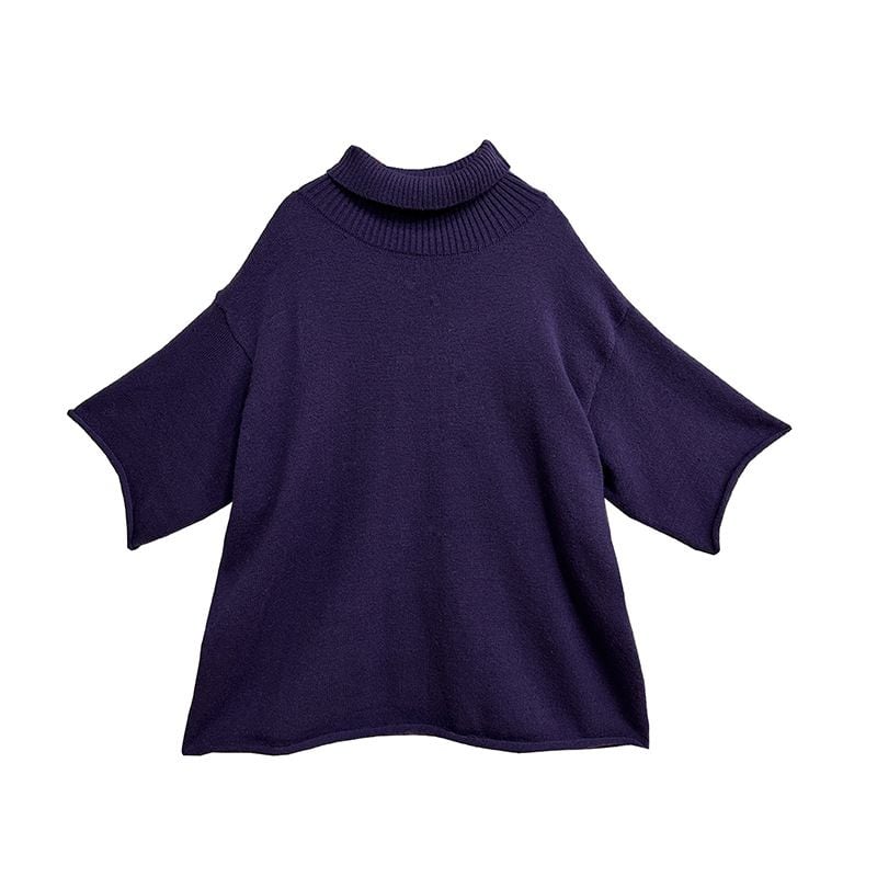 袖口や裾がロールしたワイド幅のシルエットがキュートな、タートルネック・7分袖・チュニック丈のプルオーバーニットです。ネック部分のみがリブ加工された単色のシンプルなデザインで、コーディネートしやすいお洒落なアイテムです。色は3色から選べます。