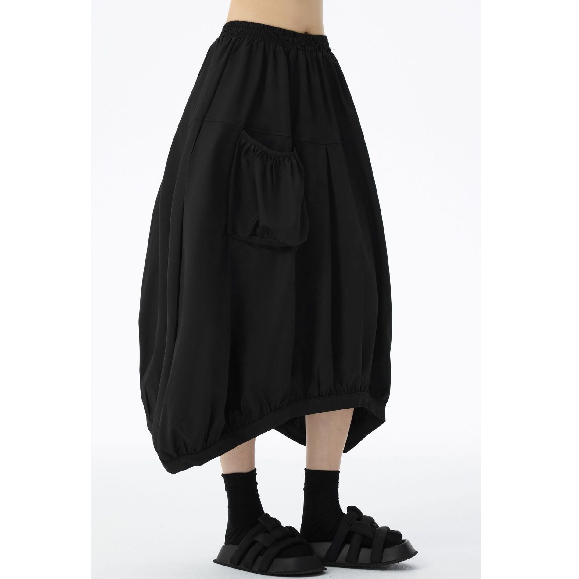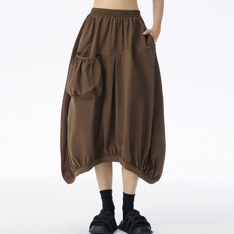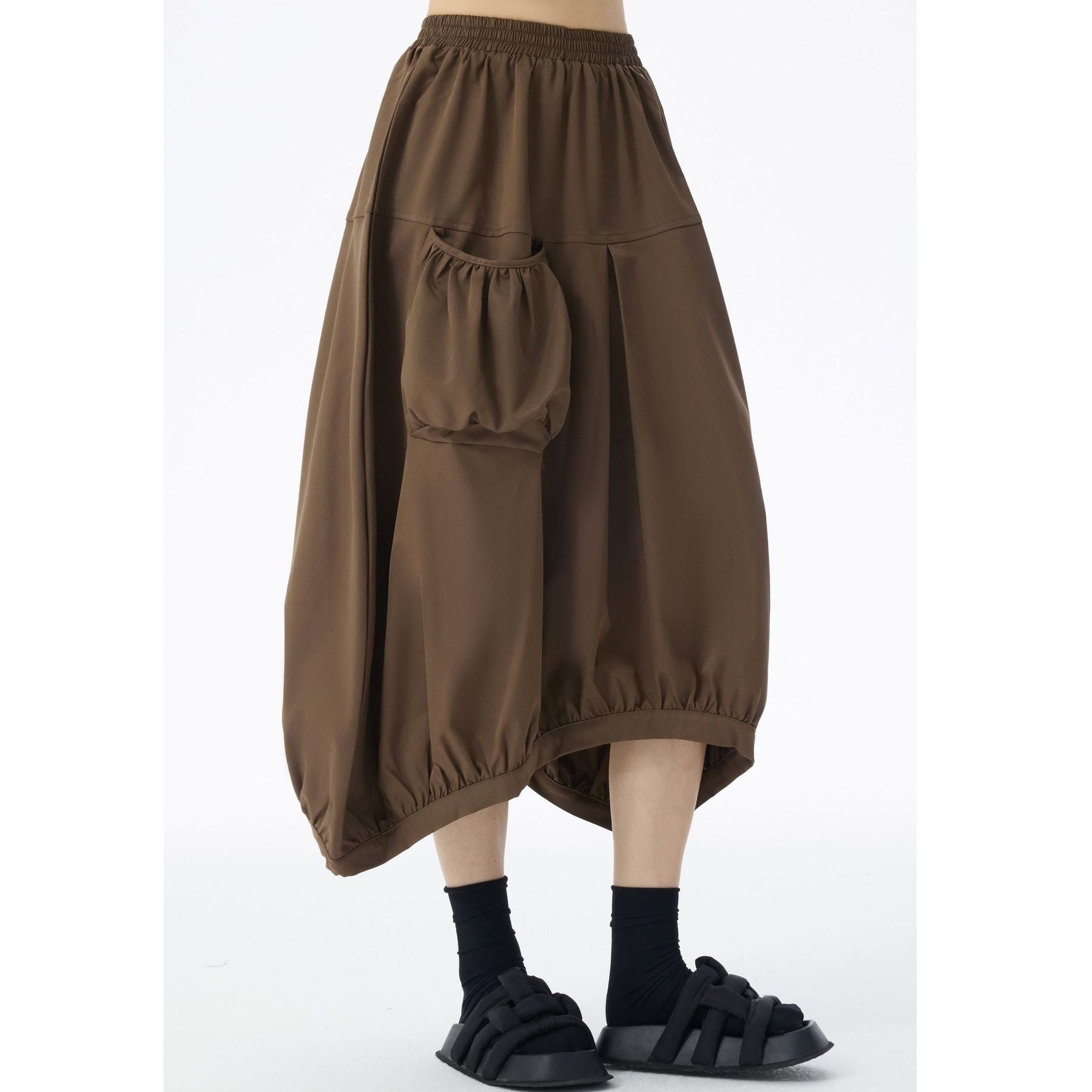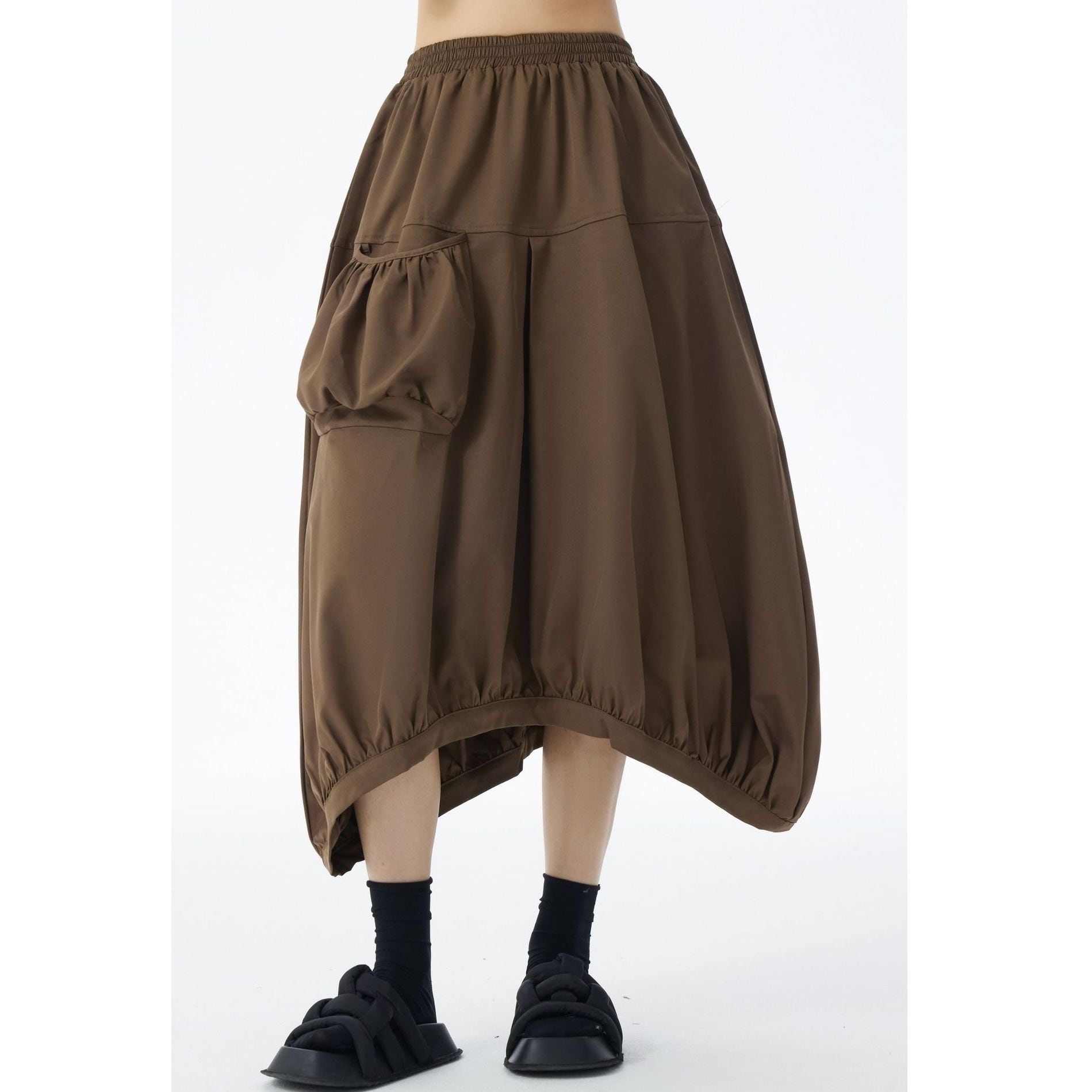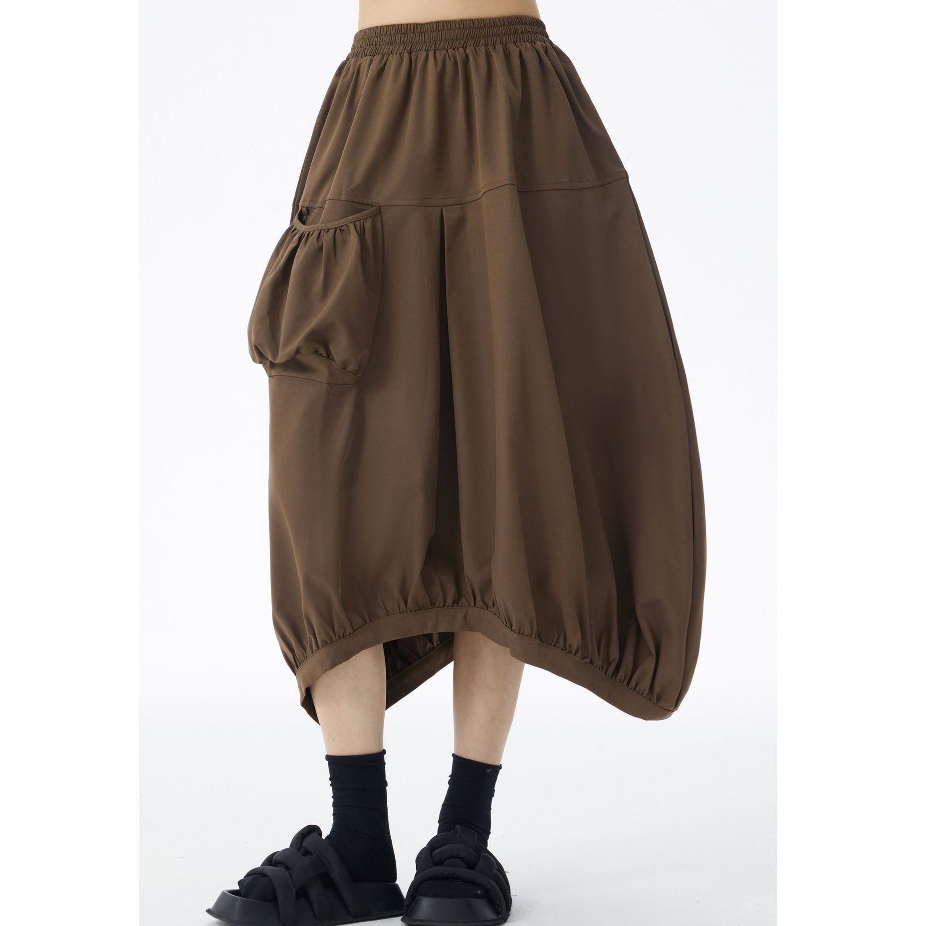 サイドの長いAラインのランタンデザインや立体的なポケットがキュートな、ミドル丈のデザインスカートです。ウエストはゴムなので、着脱が簡単で履き心地が良いです。単色で何にでも合わせやすい、コーディネートのアクセントになるアイテムです。ブラックとブラウンの2色から選べます。