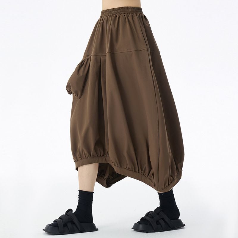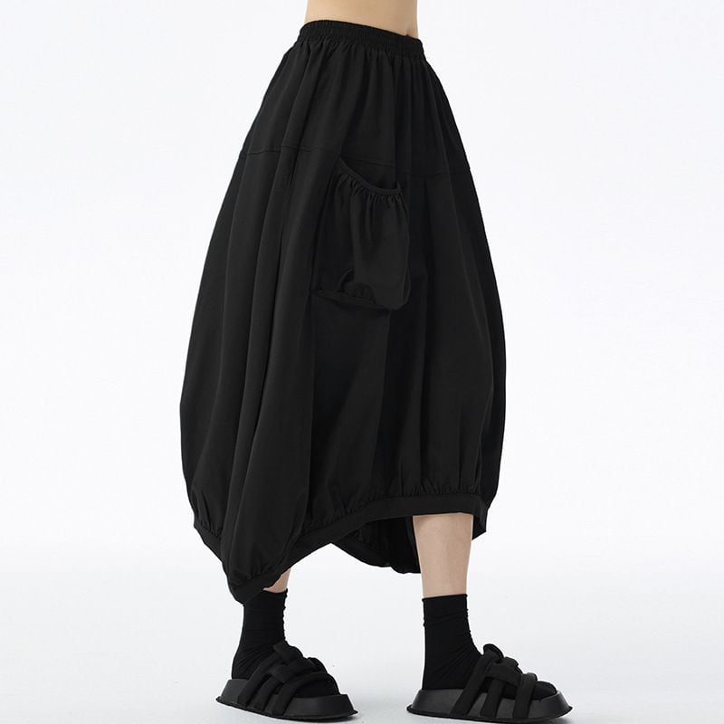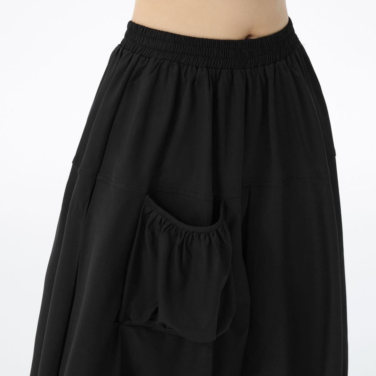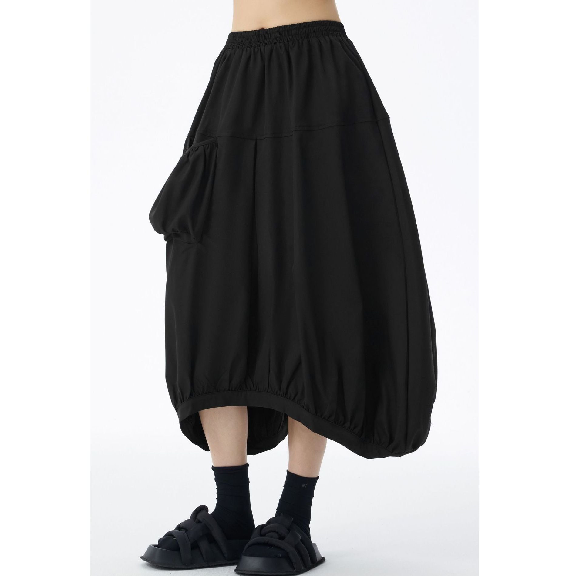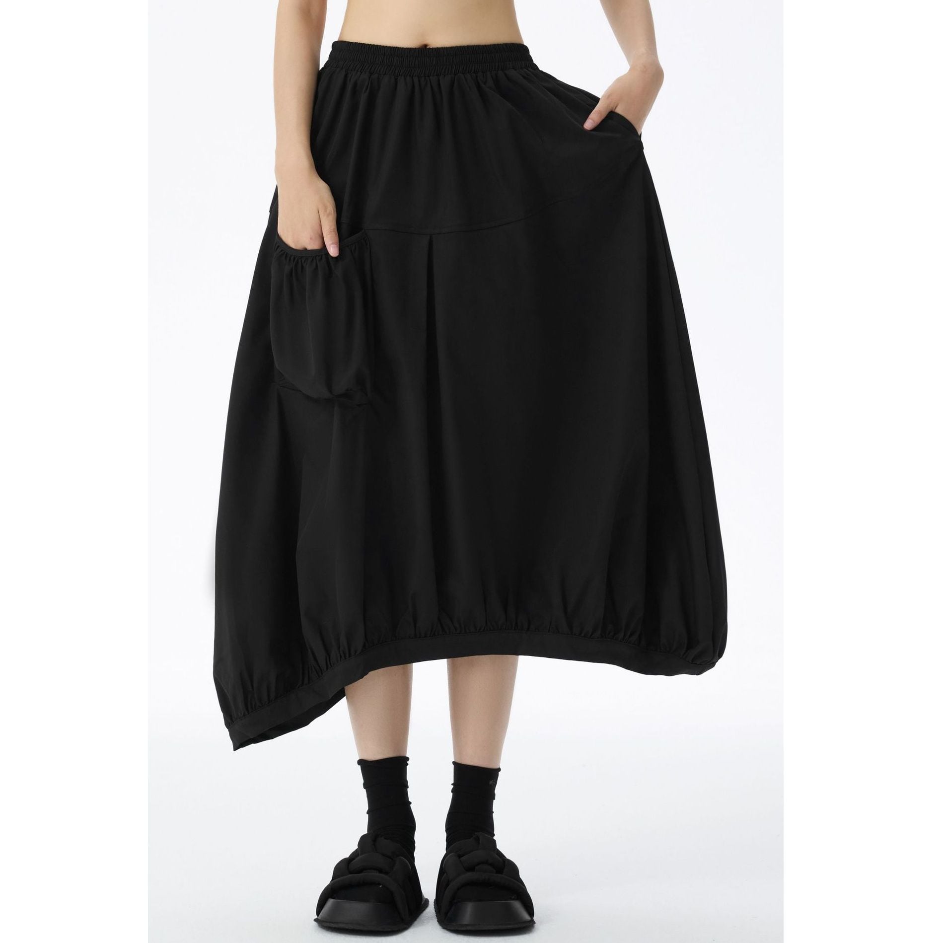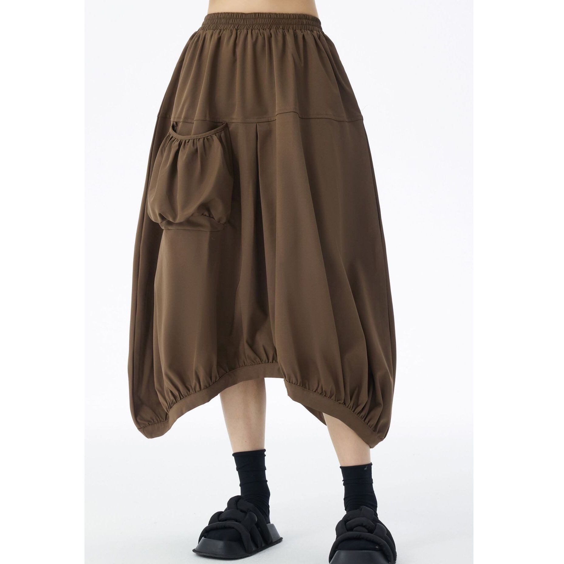 サイドの長いAラインのランタンデザインや立体的なポケットがキュートな、ミドル丈のデザインスカートです。ウエストはゴムなので、着脱が簡単で履き心地が良いです。単色で何にでも合わせやすい、コーディネートのアクセントになるアイテムです。ブラックとブラウンの2色から選べます。