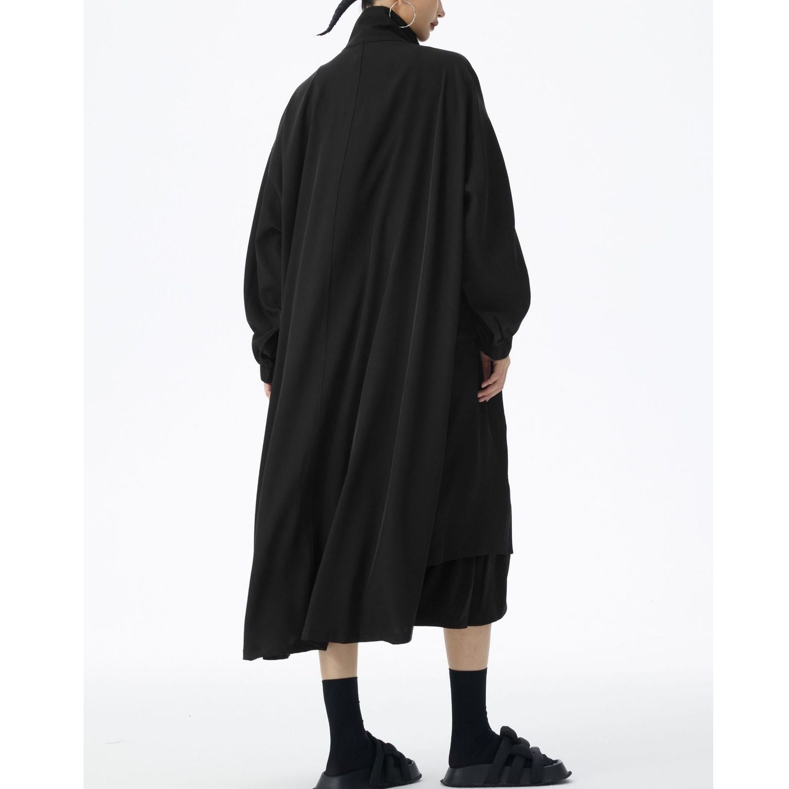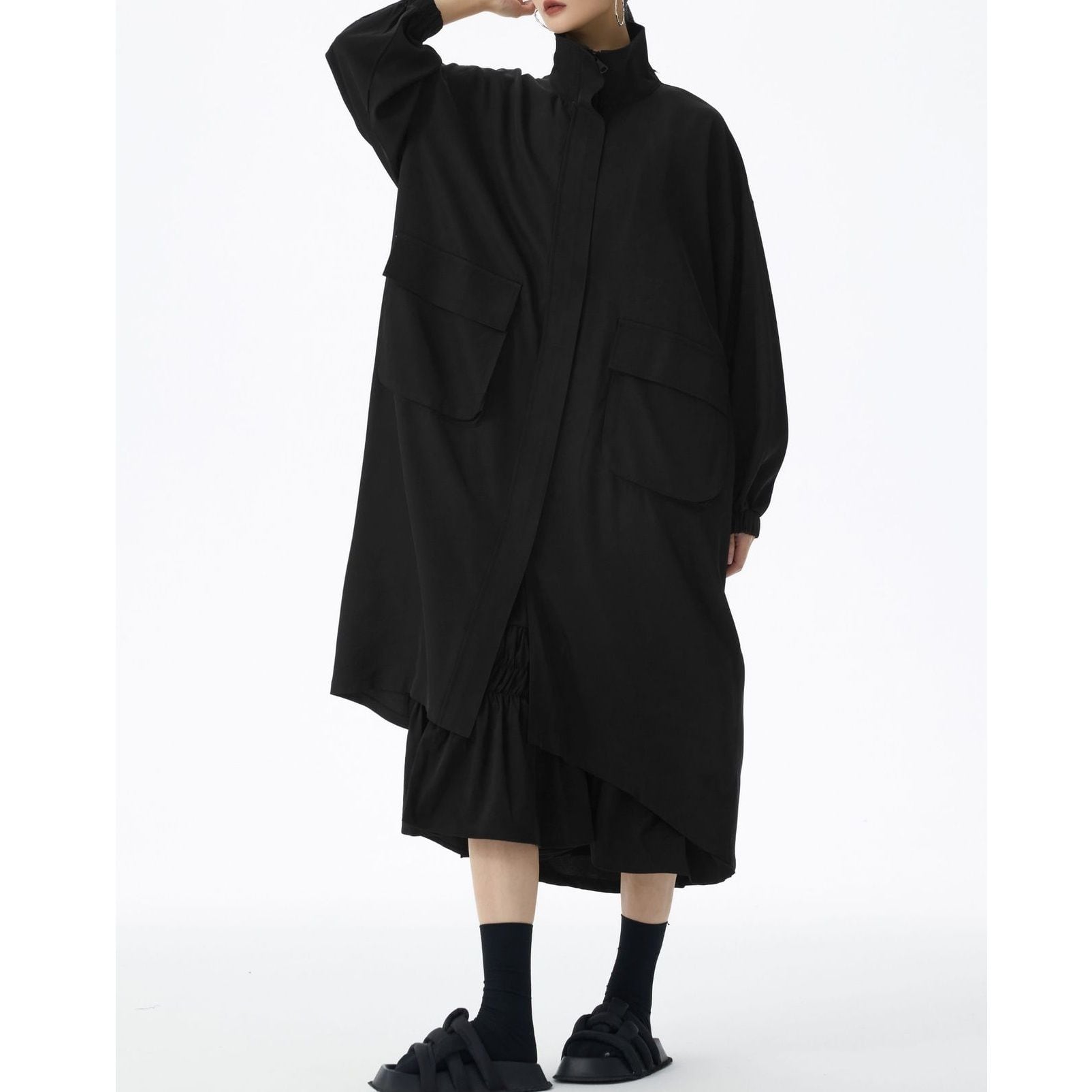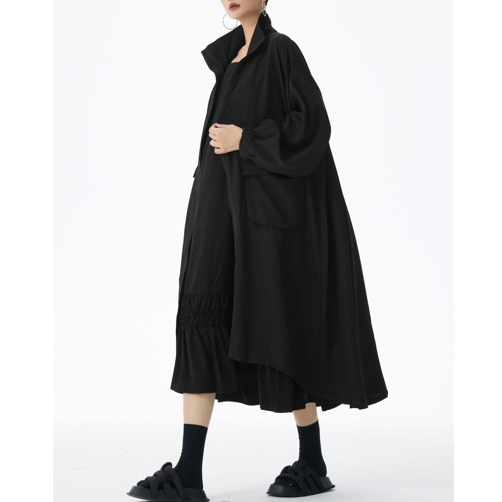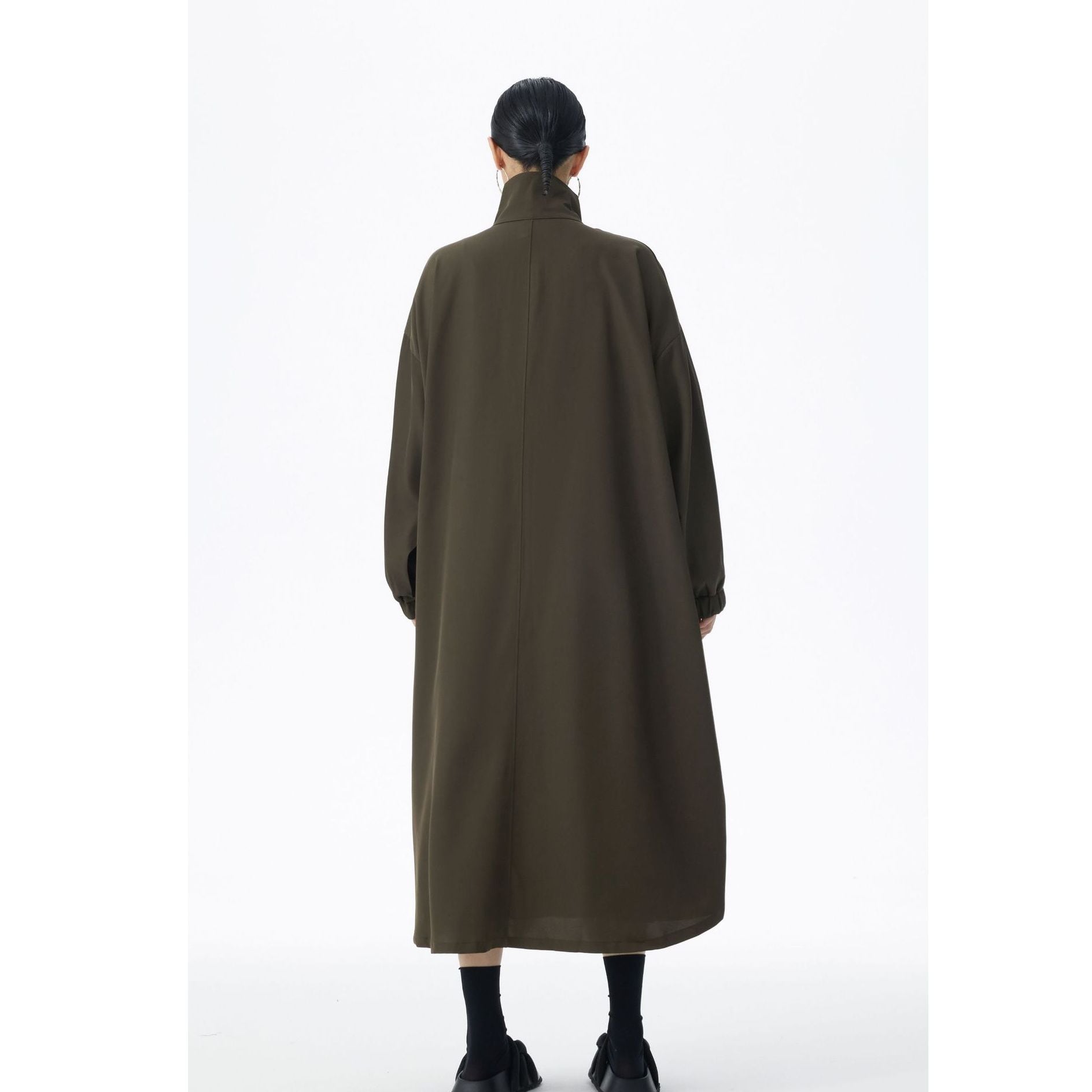 高さのあるスタンドカラーがクールな、長袖・ミドル丈のウインドブレーカーコートです。ゆったりとしたシルエットに単色のフルジップデザインが使いやすい、モードな印象のアイテムです。