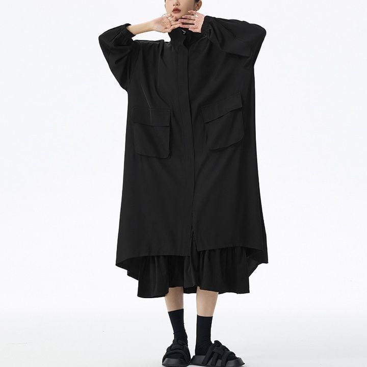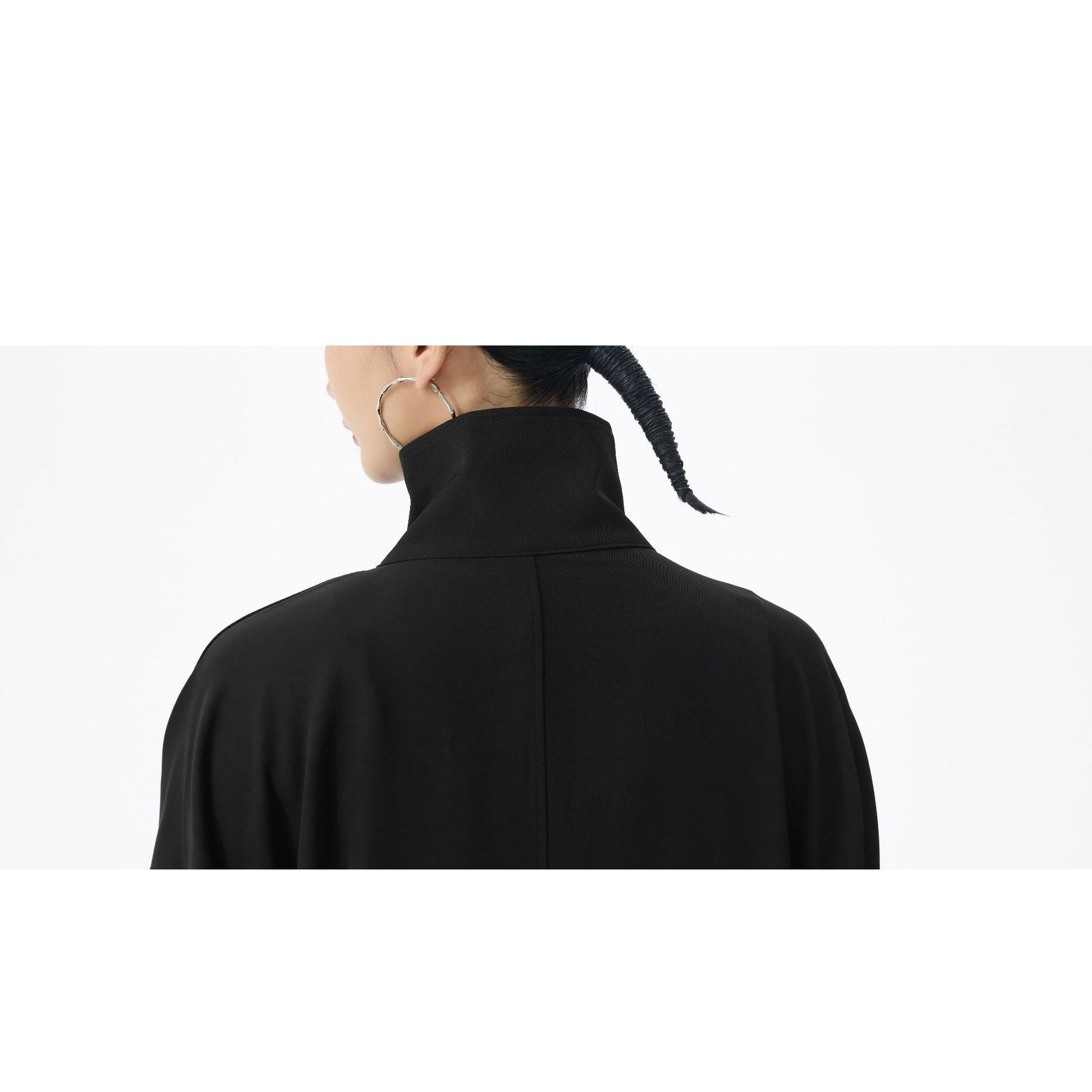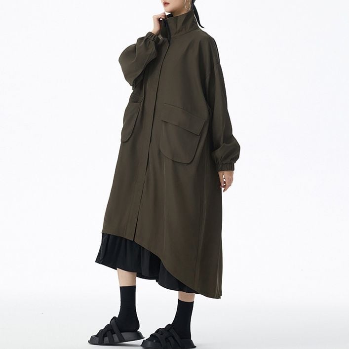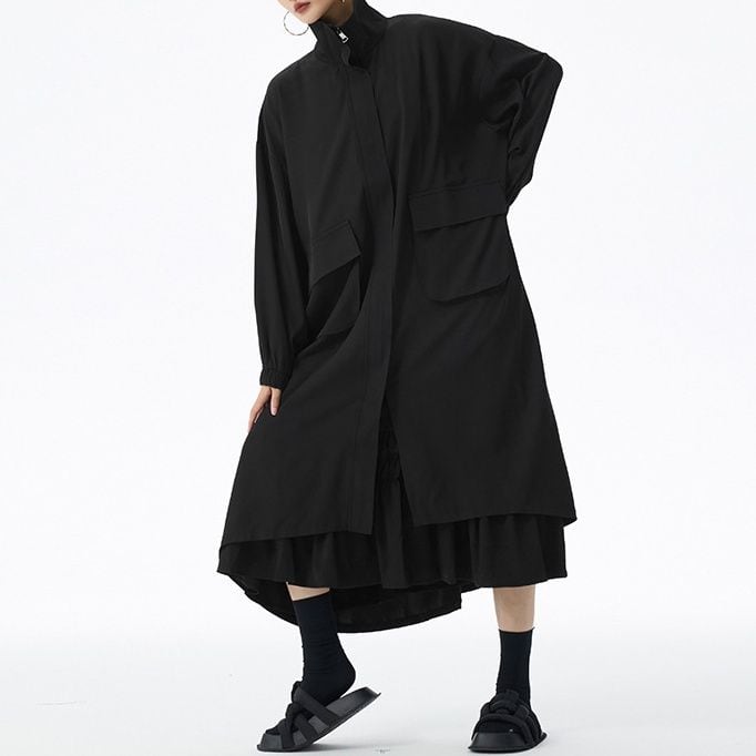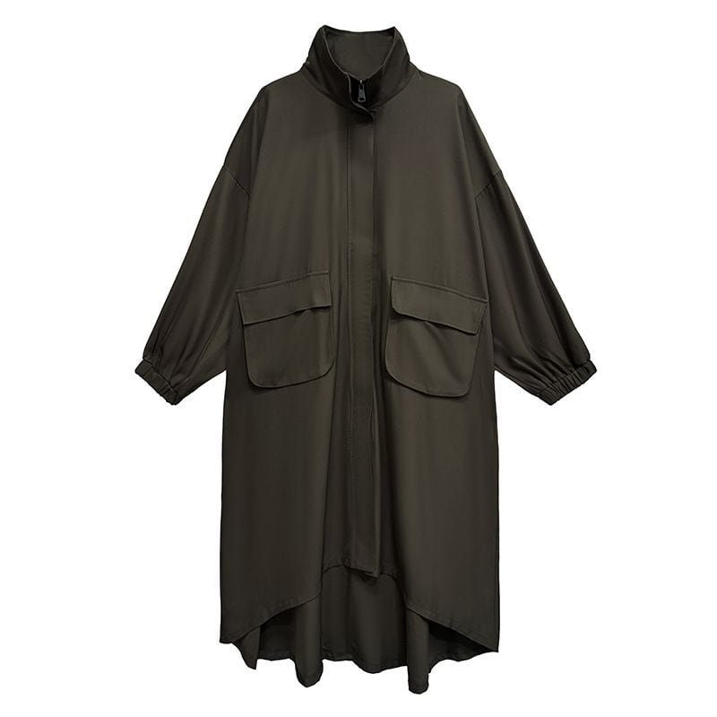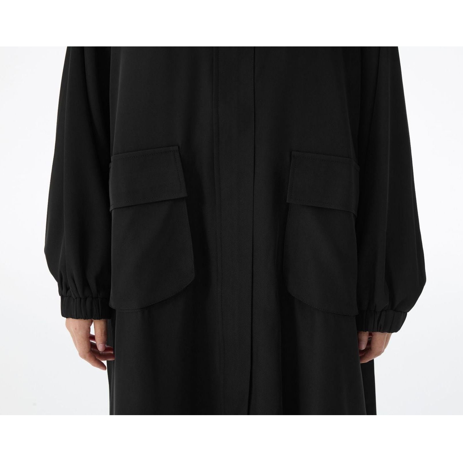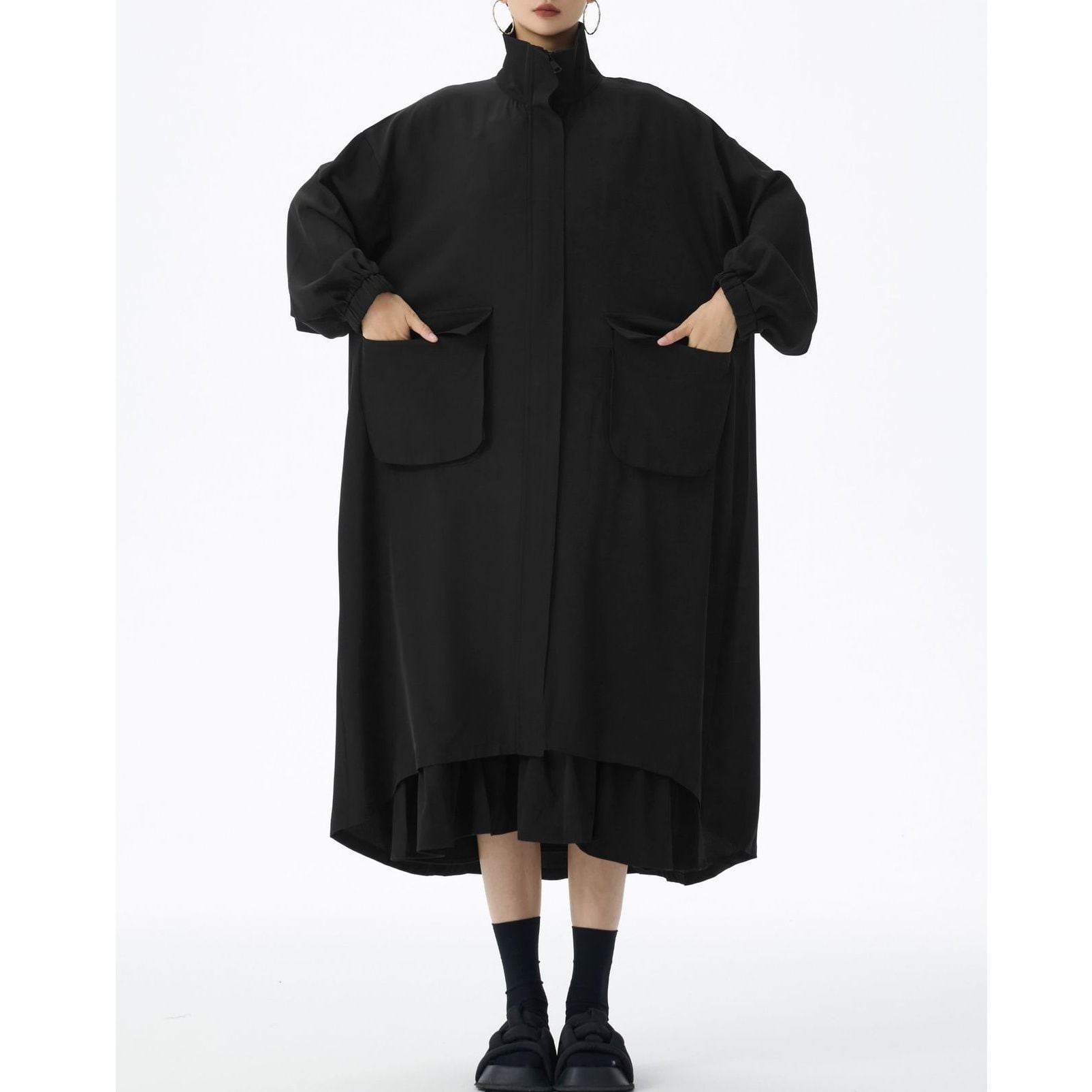 高さのあるスタンドカラーがクールな、長袖・ミドル丈のウインドブレーカーコートです。ゆったりとしたシルエットに単色のフルジップデザインが使いやすい、モードな印象のアイテムです。